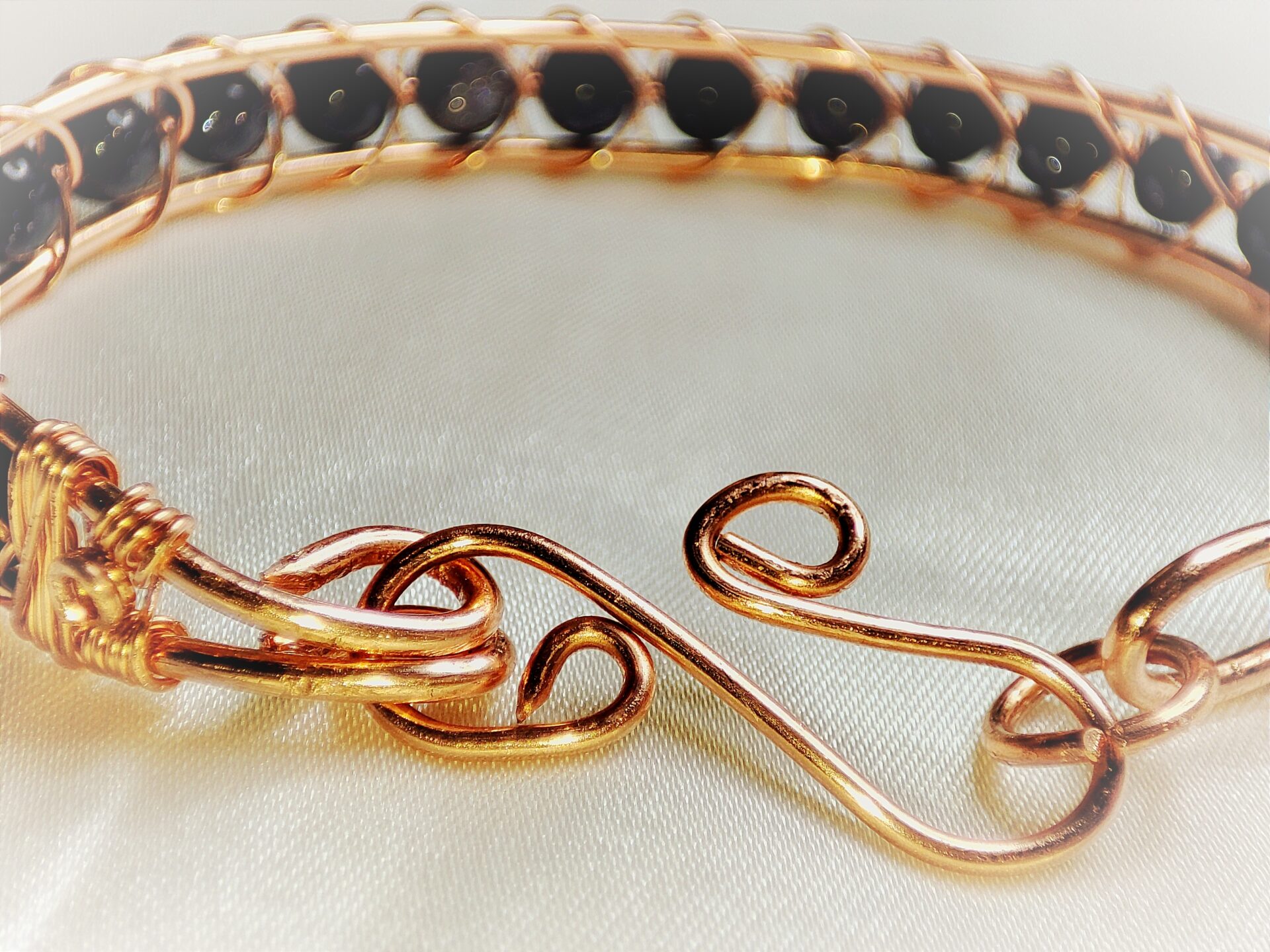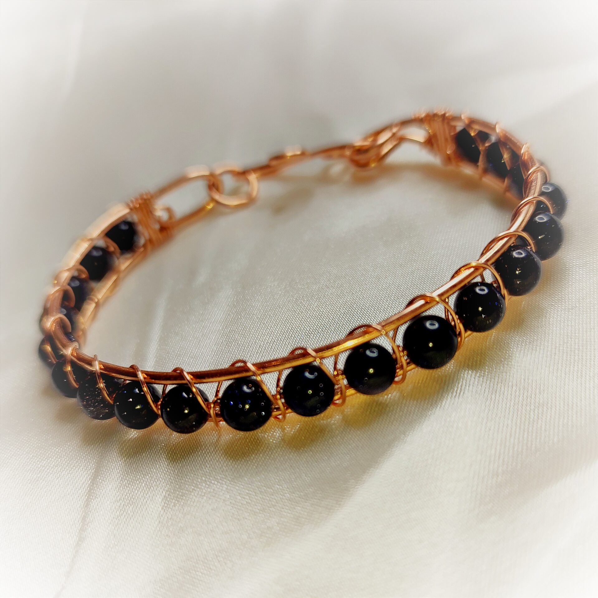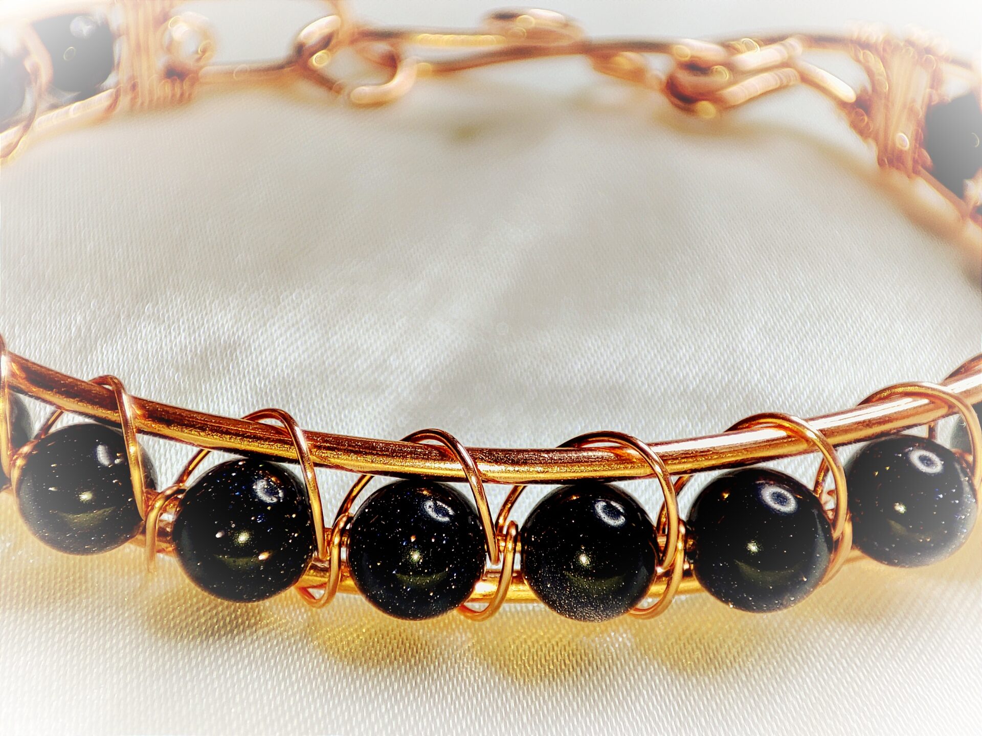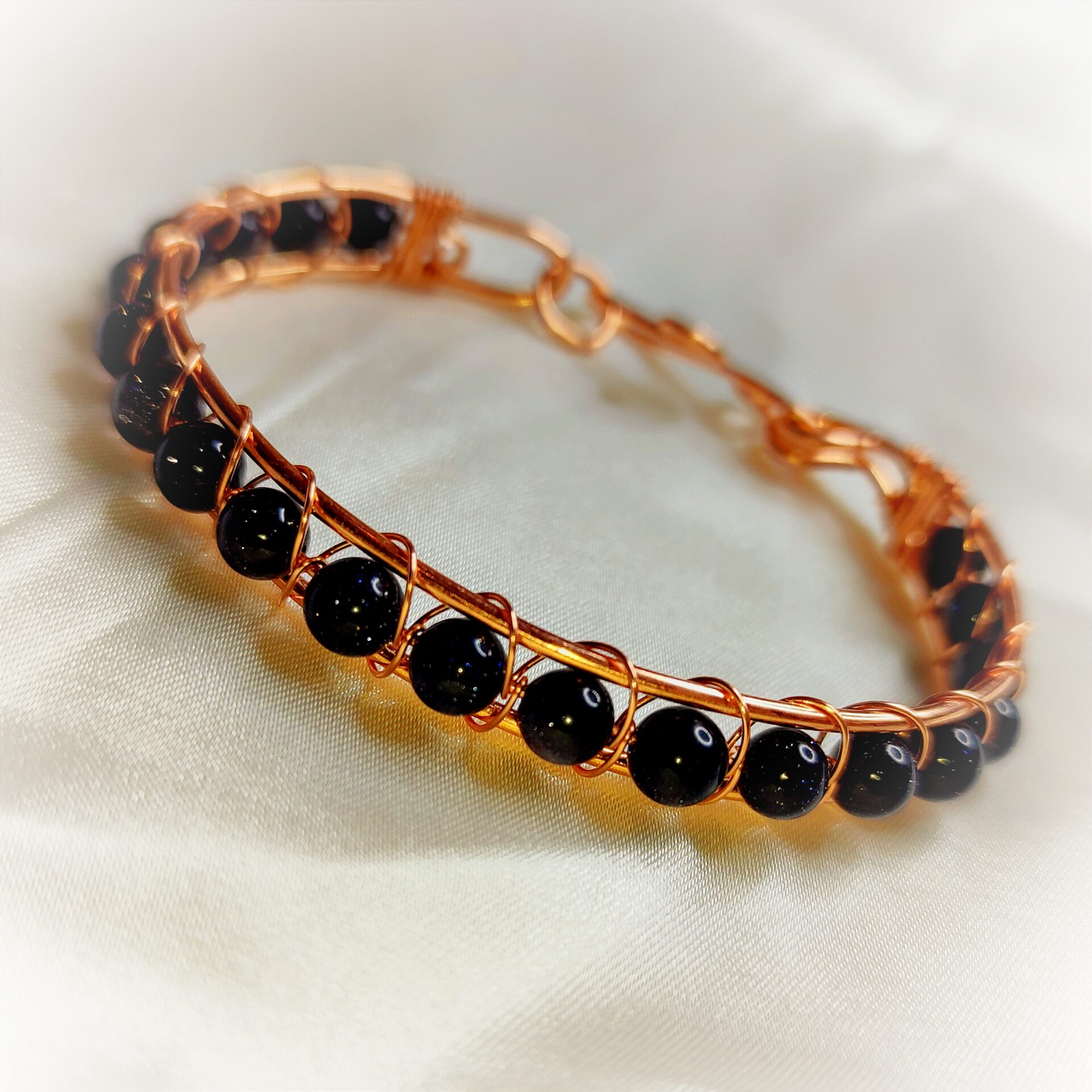 Prezentowana bransoletka wykonana jest z miedzi oraz z dwudziestu koralików noc Kairu o szerokości/długości- 0,5 cm każdy.