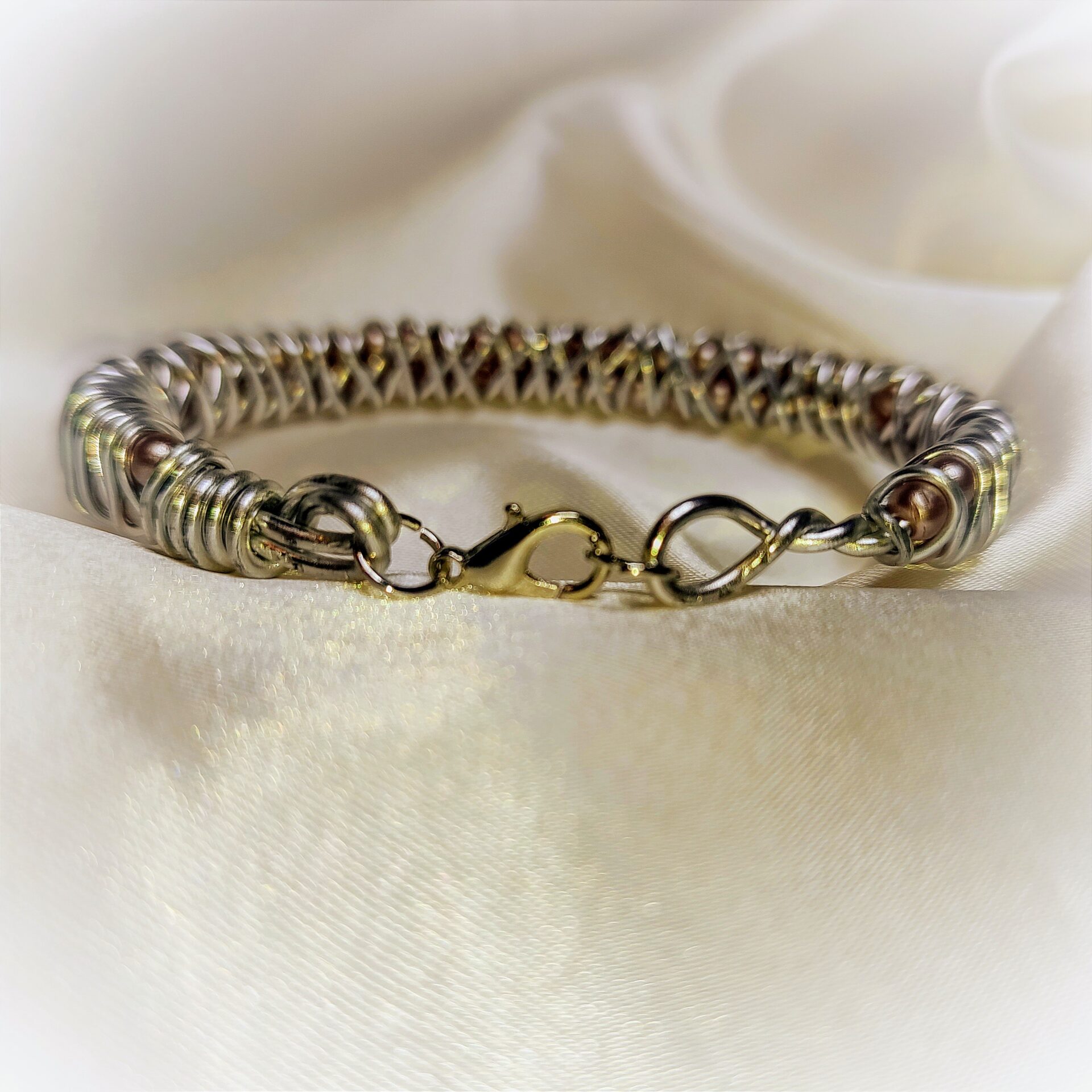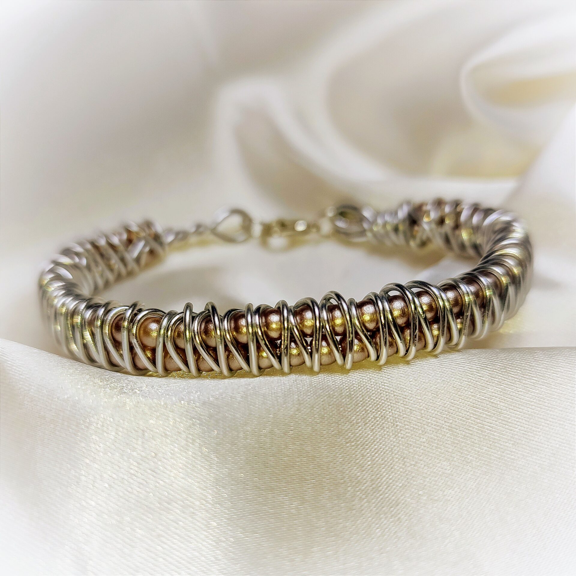 Przedmiotem sprzedaży jest bransoletka w kolorze srebrnym utworzona metodą wire jewelry. W skład bransolety wchodzą 84 sztuczne perły z abs-u w kolorze szampana. Do wykonania bransoletki użyłam aluminium – bardzo giętkiego metalu.