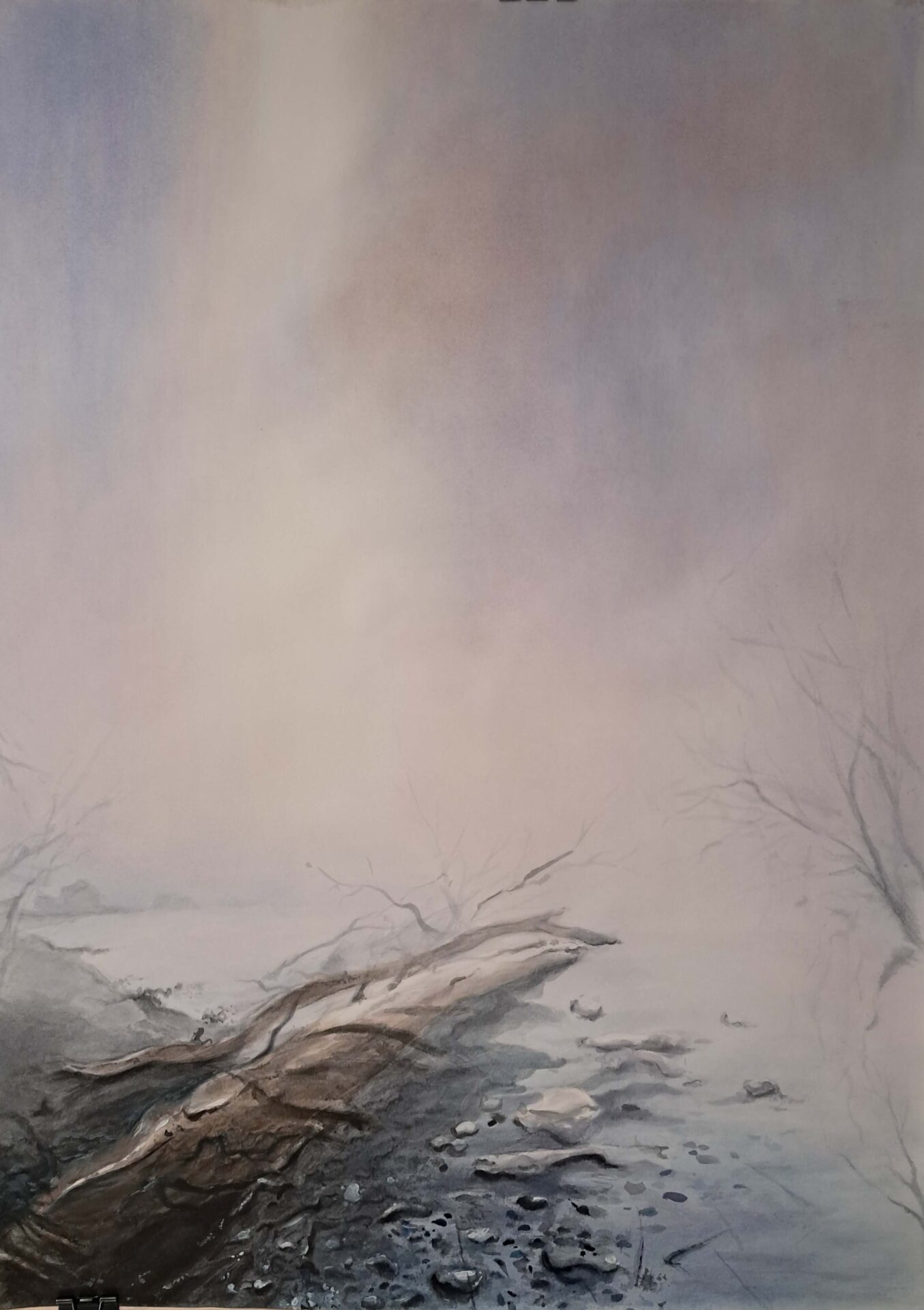 Na obrazie widać mglisty pejzaż, gdzie dominuje gra szarości i delikatnych błękitów, które nadają całości niesamowitą atmosferę spokoju i tajemniczości. Kompozycja jest centryczna, a rozmyte kontury gałęzi i kamieni zdają się lekko zanikać we mgle, tworząc płynne przejścia między planami. Obraz emanuje ciszą i zimnym porankiem, sprawiając, że czujemy się jakbyśmy stali nad brzegiem spokojnej rzeki, z dala od zgiełku codziennego życia.