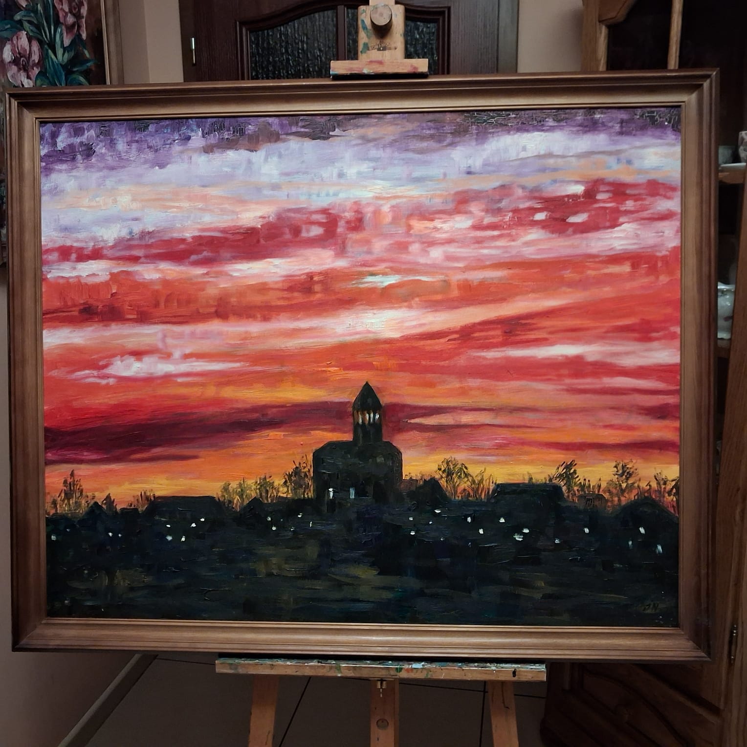 „*Budzi się noc* – obraz olejny na płycie, wymiary 100 cm x 80 cm. Przedstawia moment przejścia między dniem a nocą – niebo rozświetlają ciepłe odcienie żółci i czerwieni, tworząc intensywną, emocjonalną atmosferę. Wkrótce jednak zapada zmrok, przynosząc spokój i tajemniczość. Dynamiczna gra kolorów podkreśla ulotność chwili. Idealny do wnętrz, które potrzebują wyjątkowej energii i głębi.”