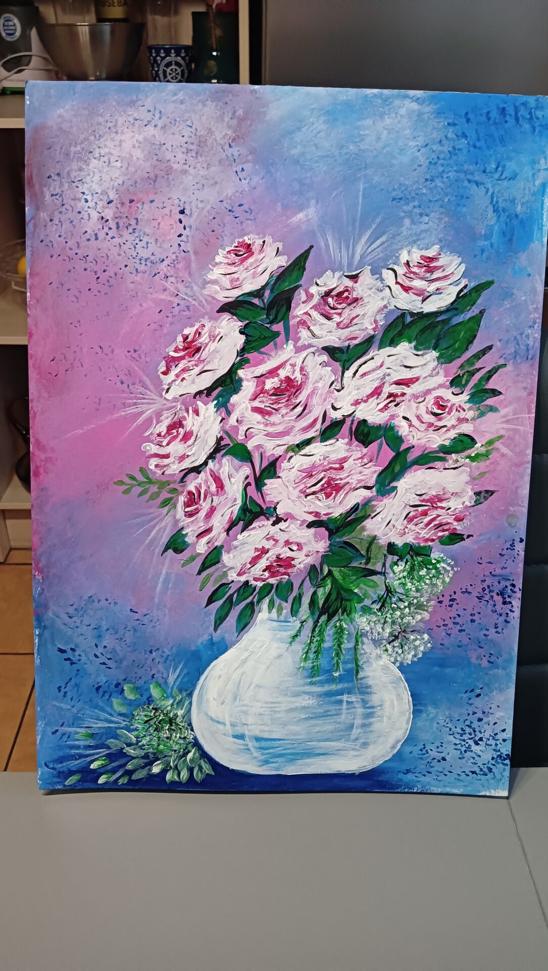 Obraz przedstawia bukiet pięknych róż we flakoniku Róża to symbol miłości i przywiązania dlatego obraz napawa optymizmem i chęcią działania Piękne różowe kolory cieszą oczy