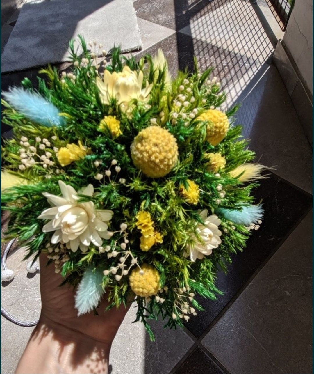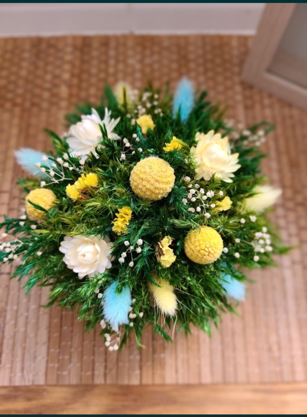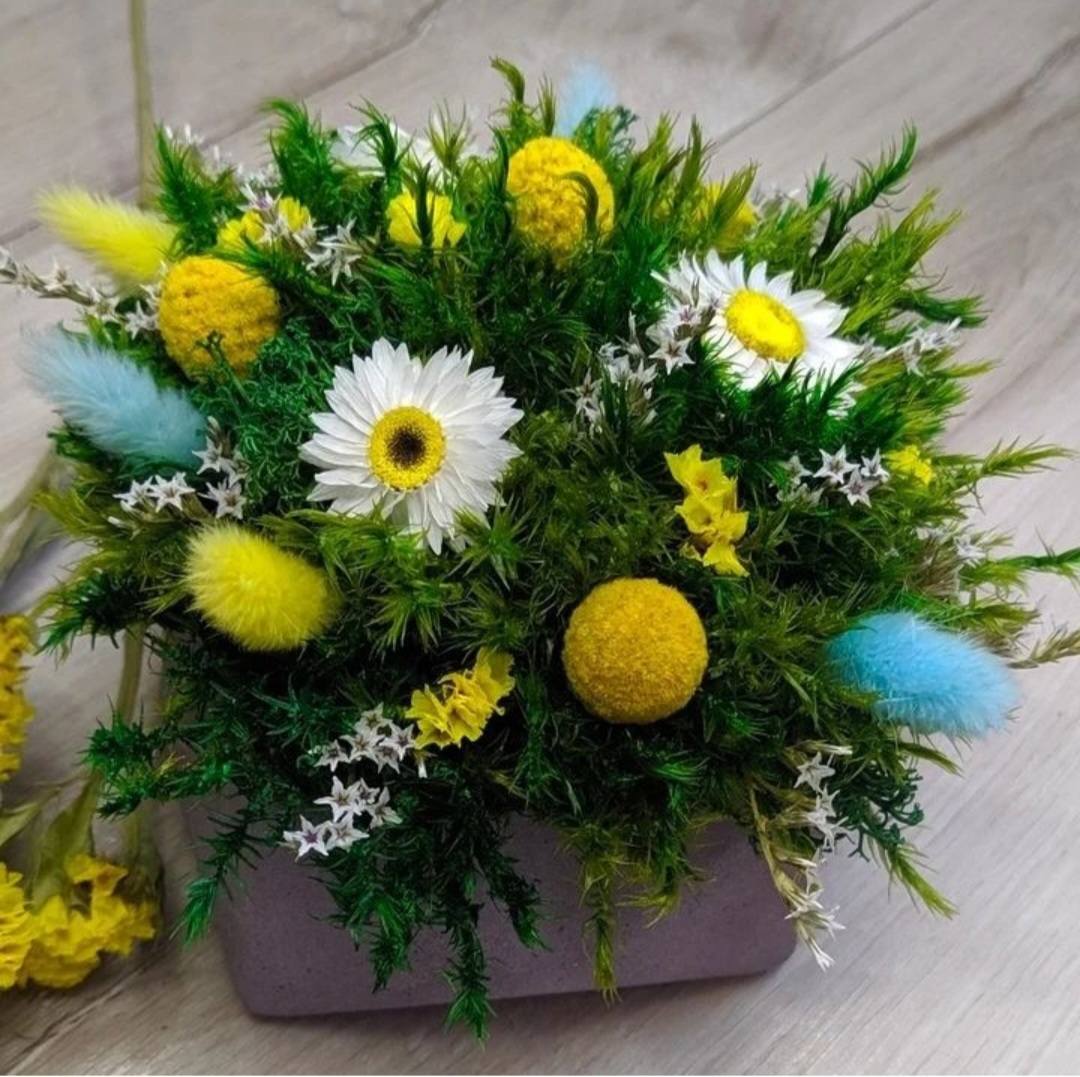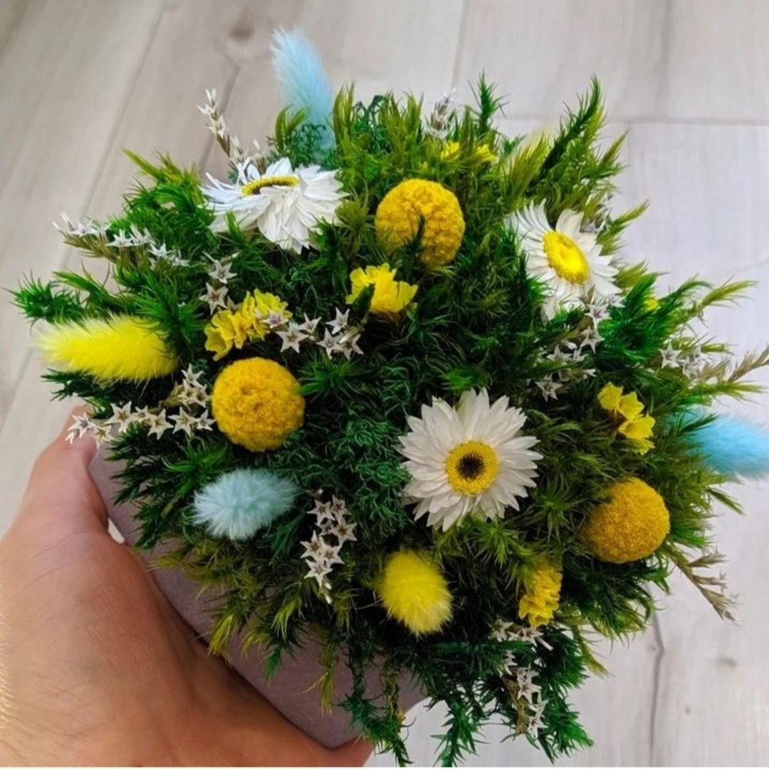 Piękny bukiet wykonany z mchu stabilizowanego i suszonych kwiatów o przyjemnych, ciepłych kolorach. Bukiet symbolizuje czułość, dając poczucie spokoju i przyjemności. Nie wymaga