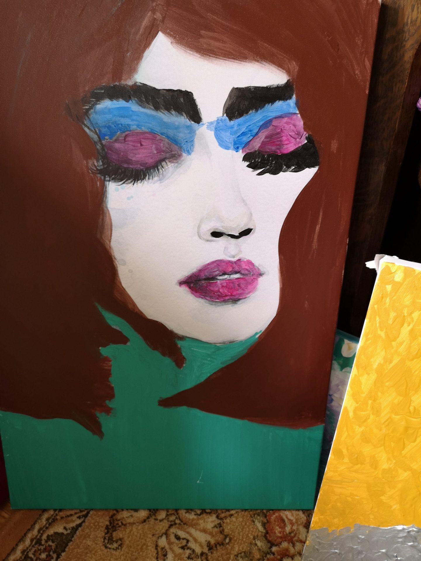 Obraz przedstawia kobietę z brązowymi włosami, ubrana w zielona bluzkę. Obraz idealnie nadaje się nowoczesnego salonu.