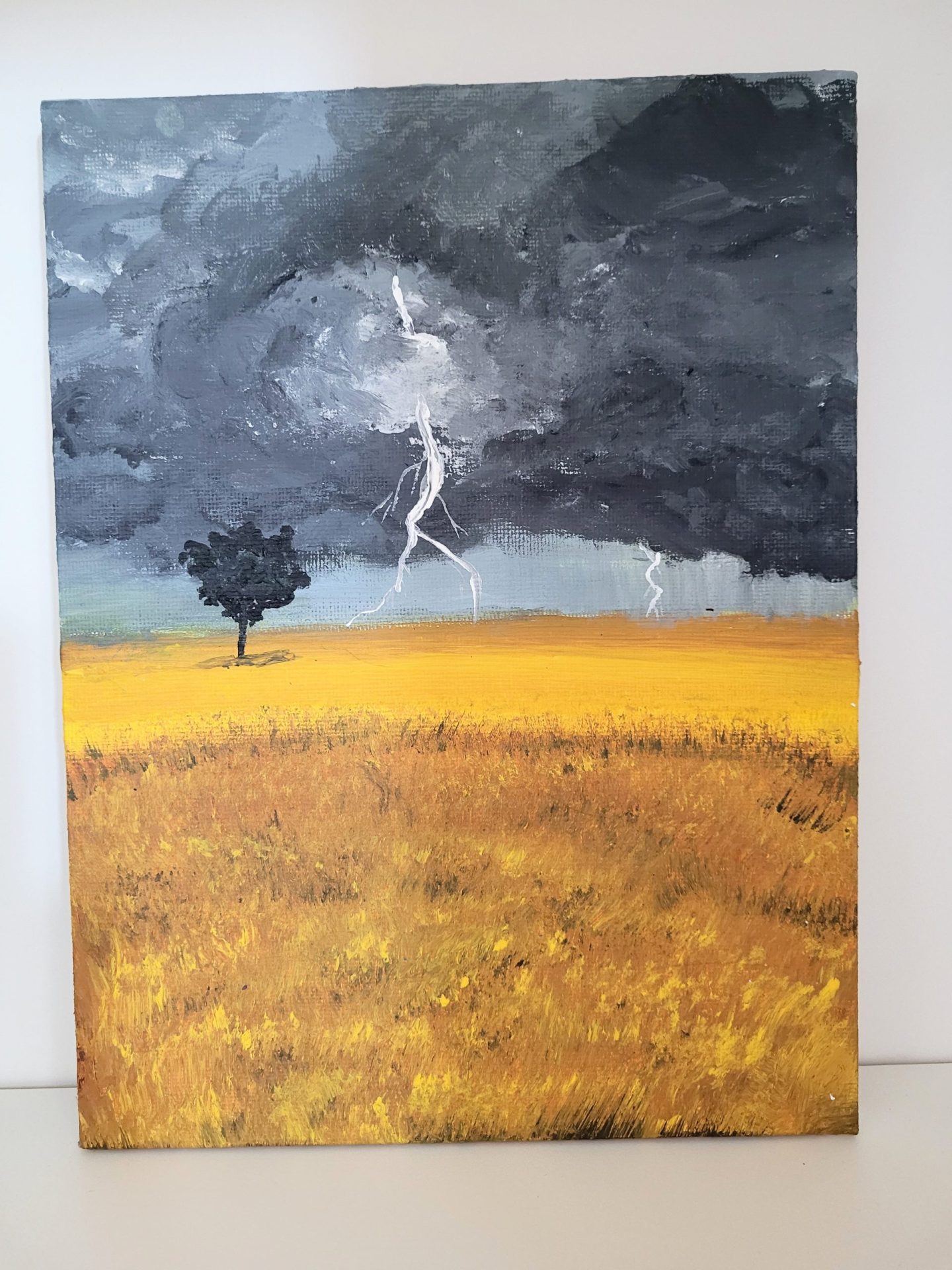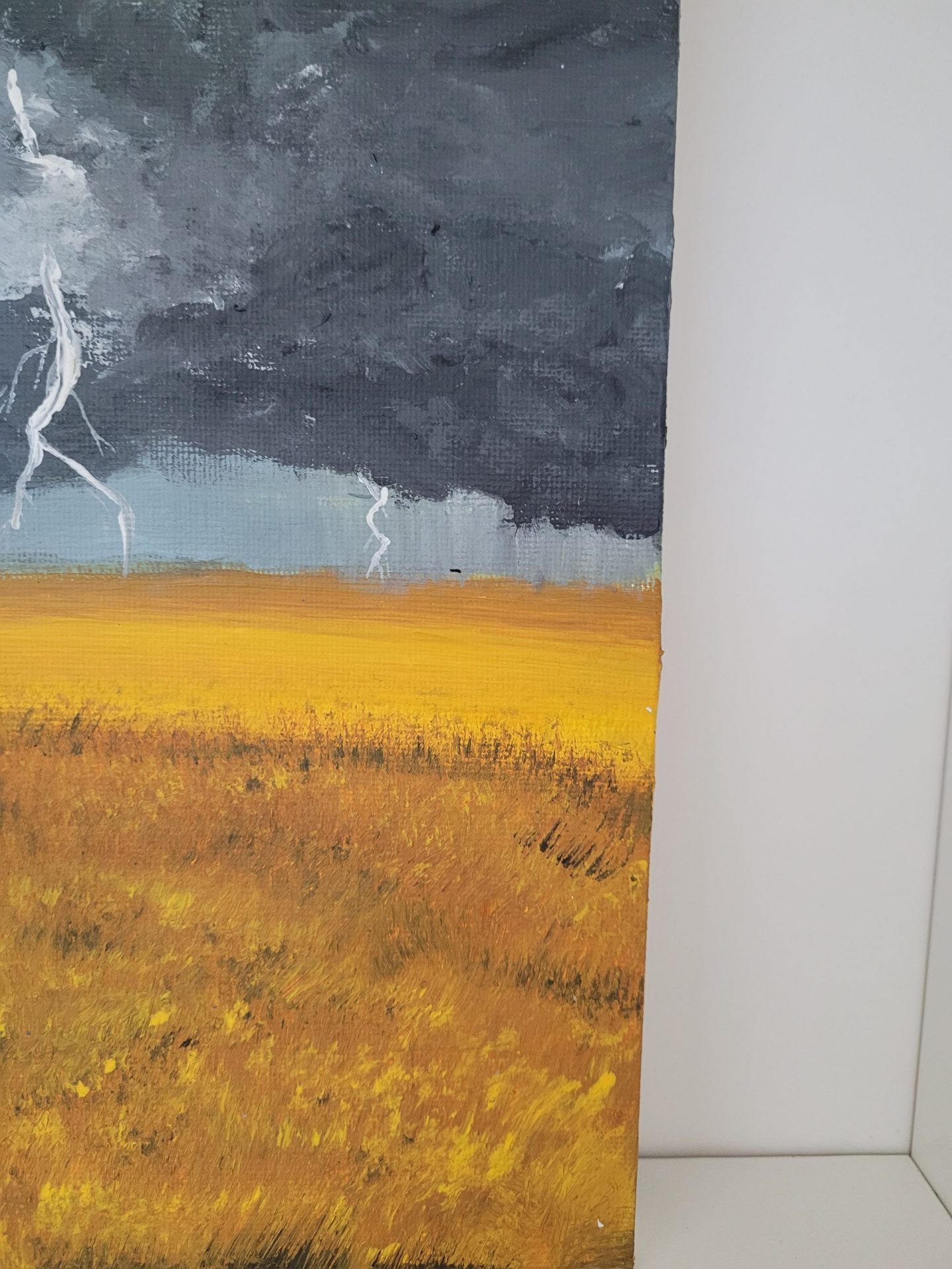 Obraz 18×24 „Burza nad rzepakiem” , zabezpieczony matowym werniksem, malowany farbami akrylowymi, gruba warstwa.