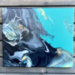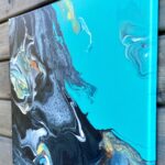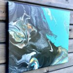 „Caribbean Vibes” to abstrakcyjny obraz wykonany techniką pouringu na płótnie o wymiarach 46 cm x 55 cm, który przenosi widza w świat tropikalnych kolorów i intensywnych emocji. Dominujące odcienie turkusu, błękitu i bieli przywodzą na myśl krystaliczne wody Karaibów, tworząc poczucie świeżości i głębi. Złoto i ochra dodają kompozycji elegancji i ciepła, przywodząc na myśl słońce odbijające się na powierzchni morza oraz bogactwo tropikalnych krajobrazów.