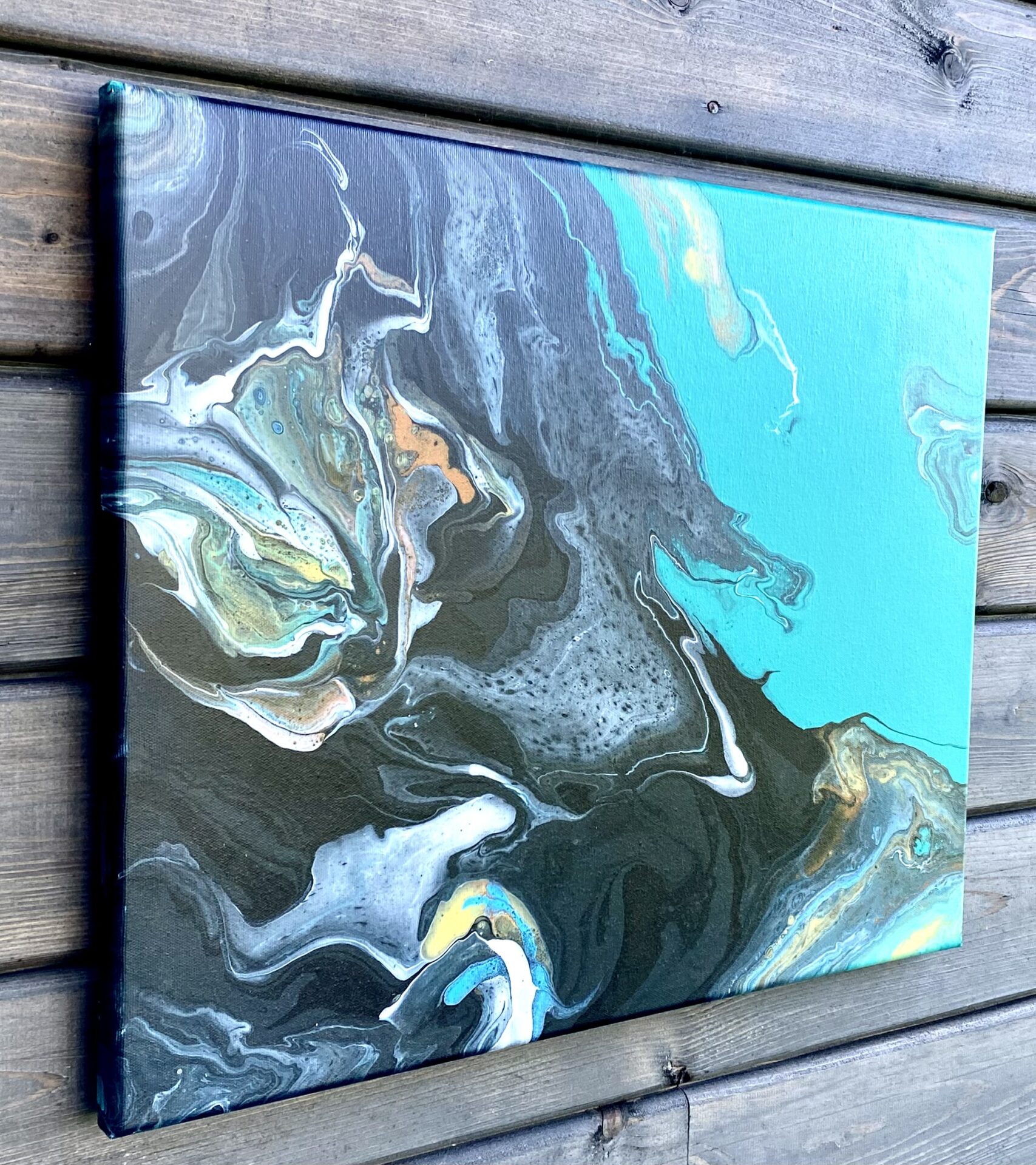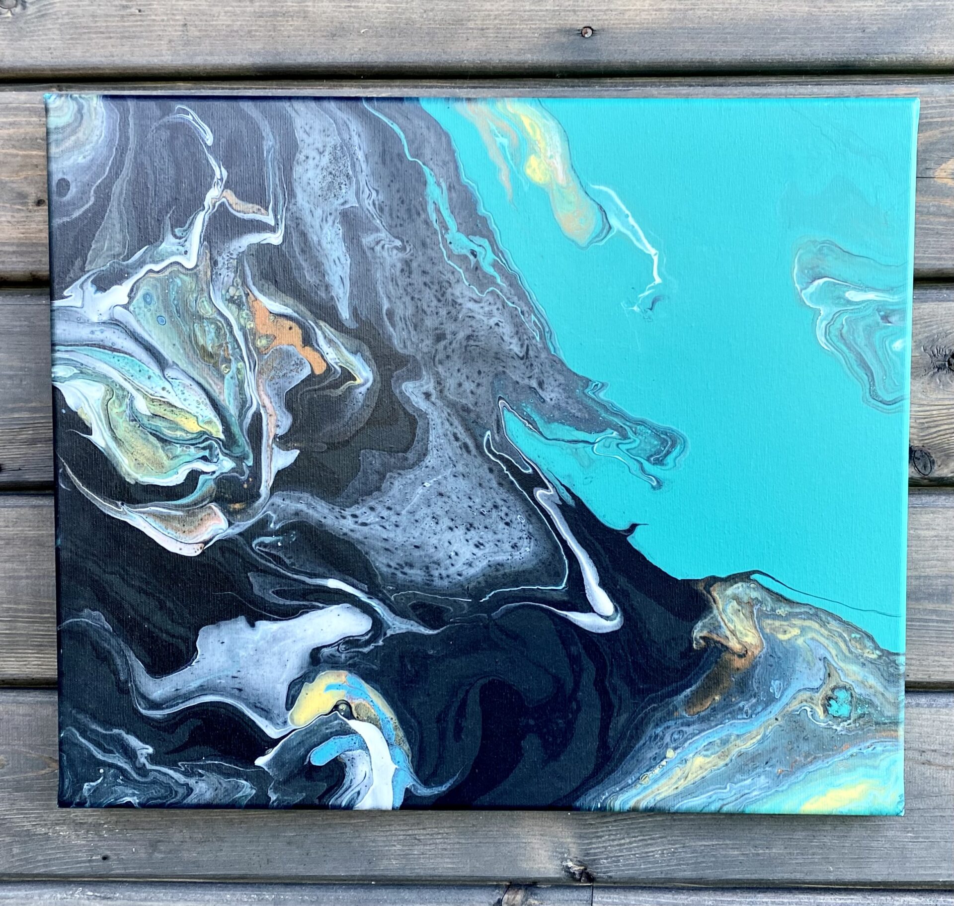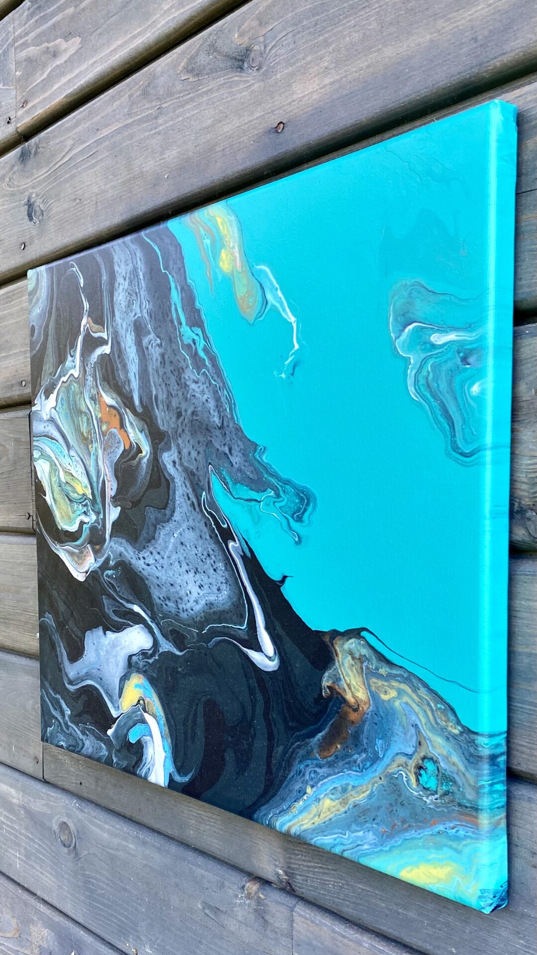 „Caribbean Vibes” to abstrakcyjny obraz wykonany techniką pouringu na płótnie o wymiarach 46 cm x 55 cm, który przenosi widza w świat tropikalnych kolorów i intensywnych emocji. Dominujące odcienie turkusu, błękitu i bieli przywodzą na myśl krystaliczne wody Karaibów, tworząc poczucie świeżości i głębi. Złoto i ochra dodają kompozycji elegancji i ciepła, przywodząc na myśl słońce odbijające się na powierzchni morza oraz bogactwo tropikalnych krajobrazów.