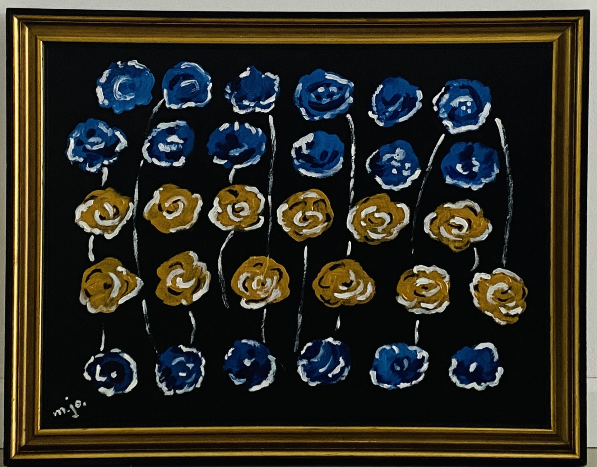 „CHABROWA ŁĄKA” to dzieło działającego pod znanym pseudonimem autora „m.jo.” Jego podpis i marka są synonimem jego pewności siebie w sztuce modnej i wyznaczającej trendy. Kwiaty były częstym motywem jego twórczości, pozwalały mu na studiowanie relacji barw. Kwiaty na prezentowanym obrazie to chabry. Oprócz róż, tulipanów czy dmuchawców, właśnie one występują najczęściej na obrazach autora.