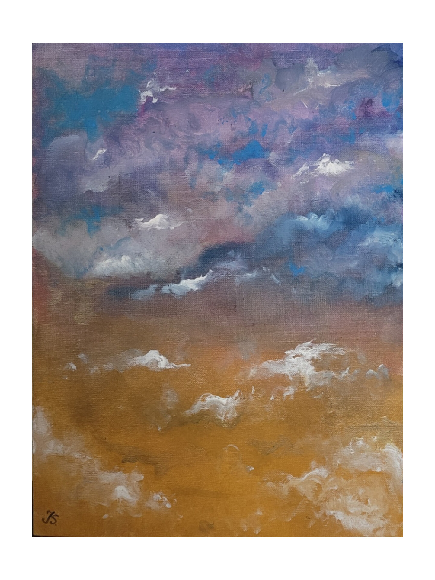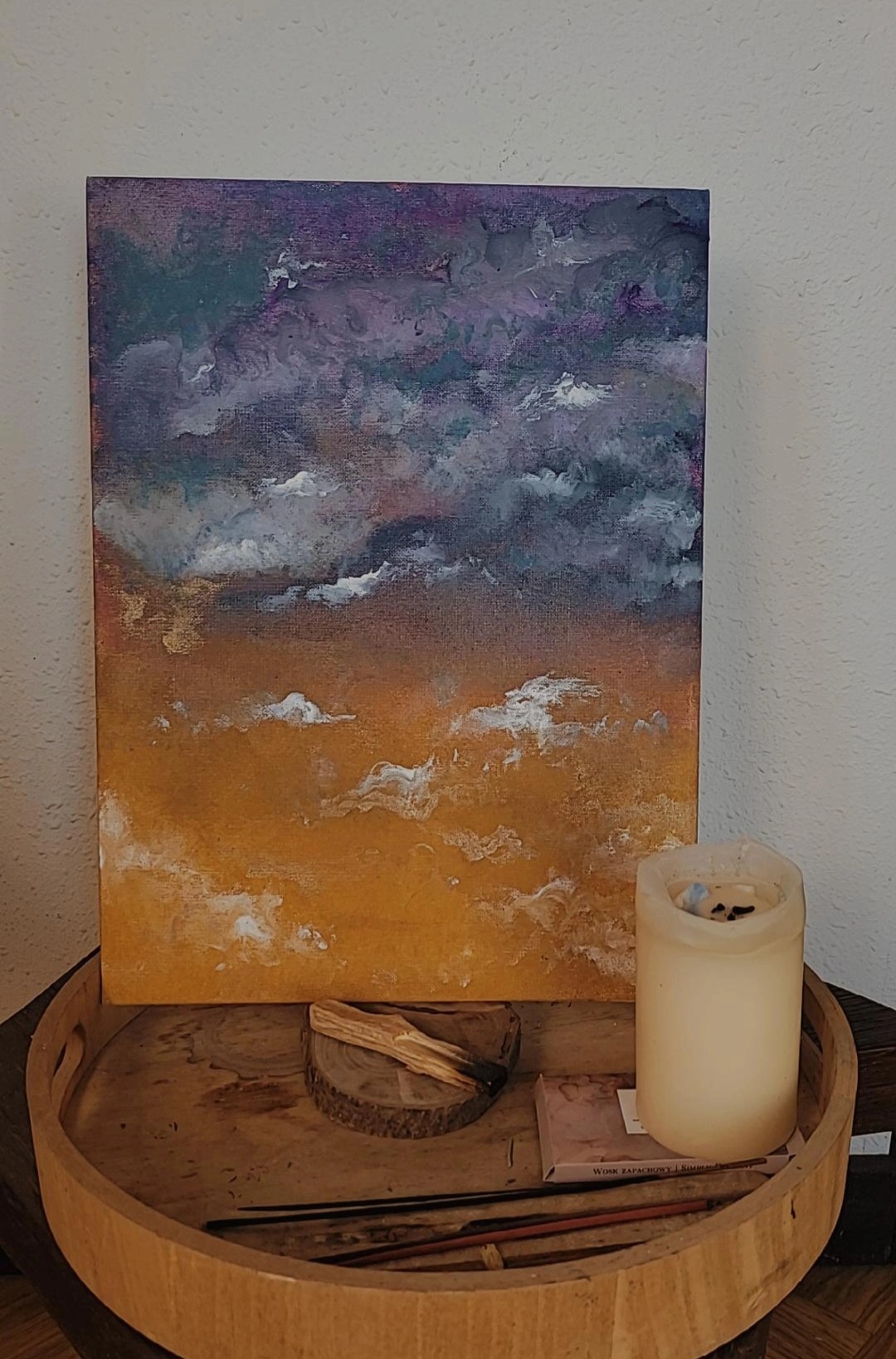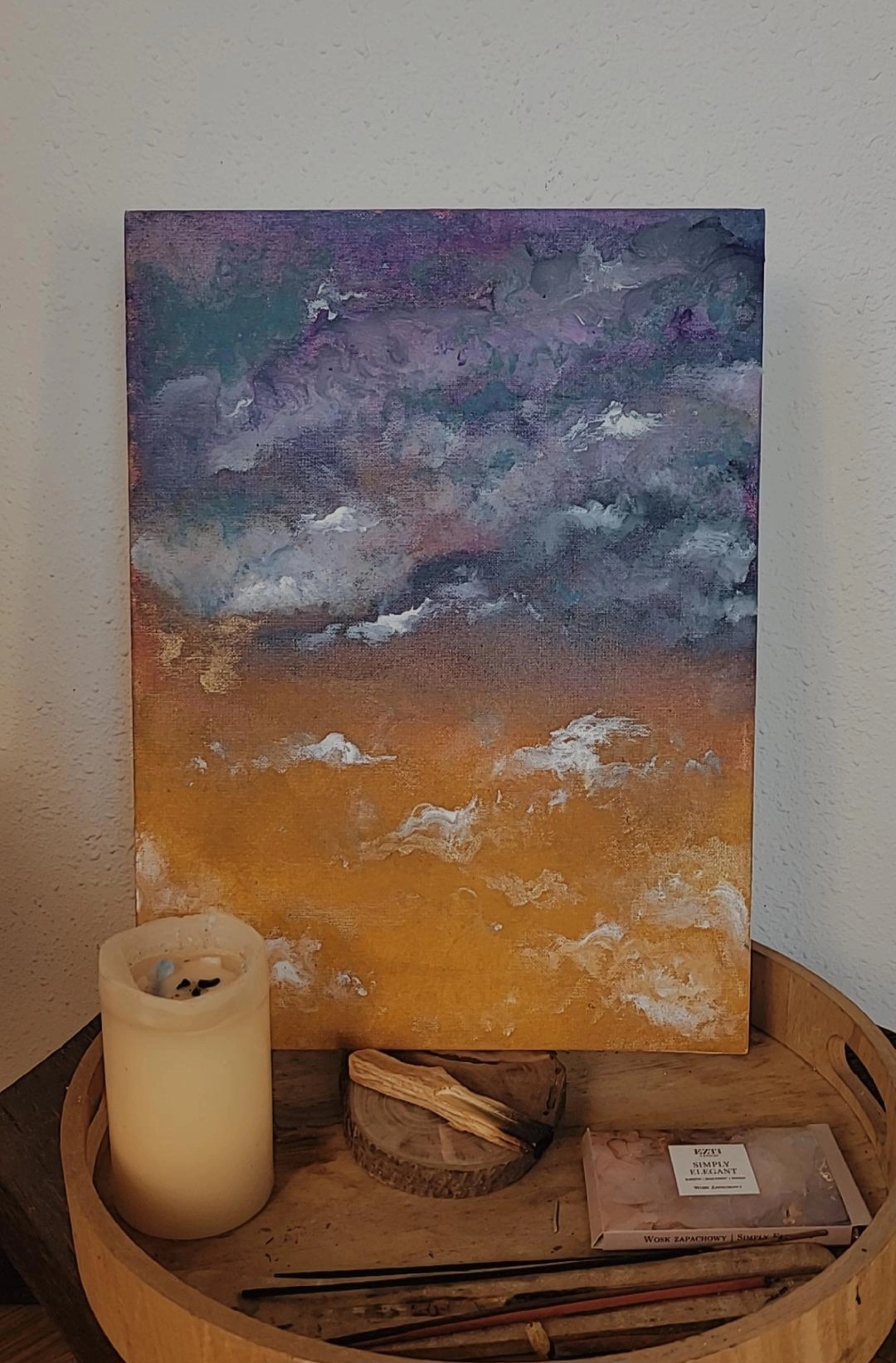 Obraz pt. „Chmury” malowany farbami olejnymi na płótnie o wymiarach 30×40. Nie posiada ramy.