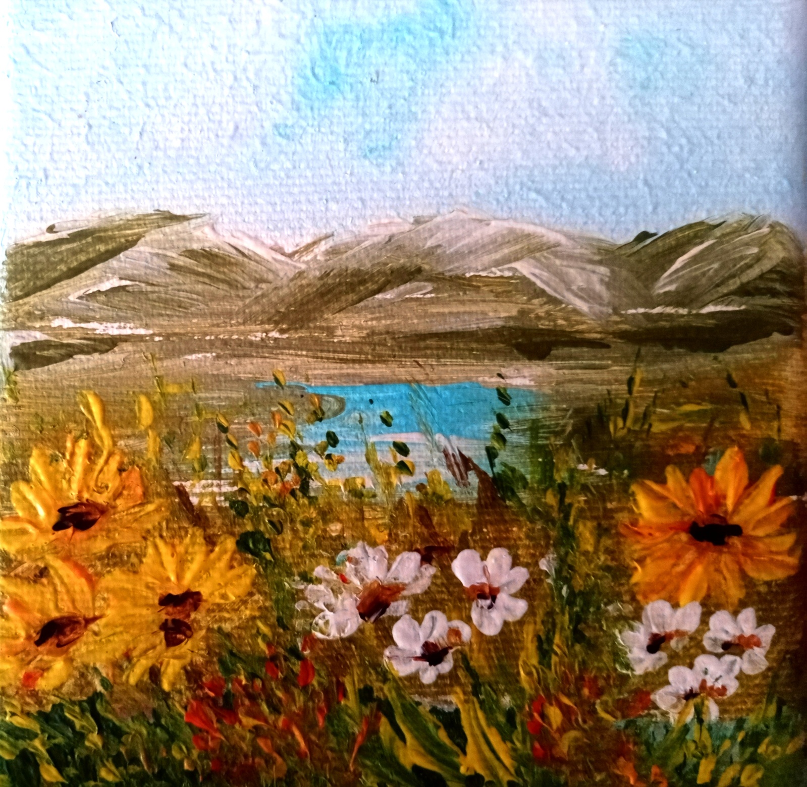 Obraz namalowany na profesjonalnym podobraziu . Płótno nabite na sosnowe krosno. Użyte zostały wysokiej jakości farby akrylowe. Wymiary 10 x 10 Do pracy dołączam certyfikat. Jest to moja praca. Obraz jest sygnowany i zawerniksowany. Boki zamalowane w tonacji obrazu.