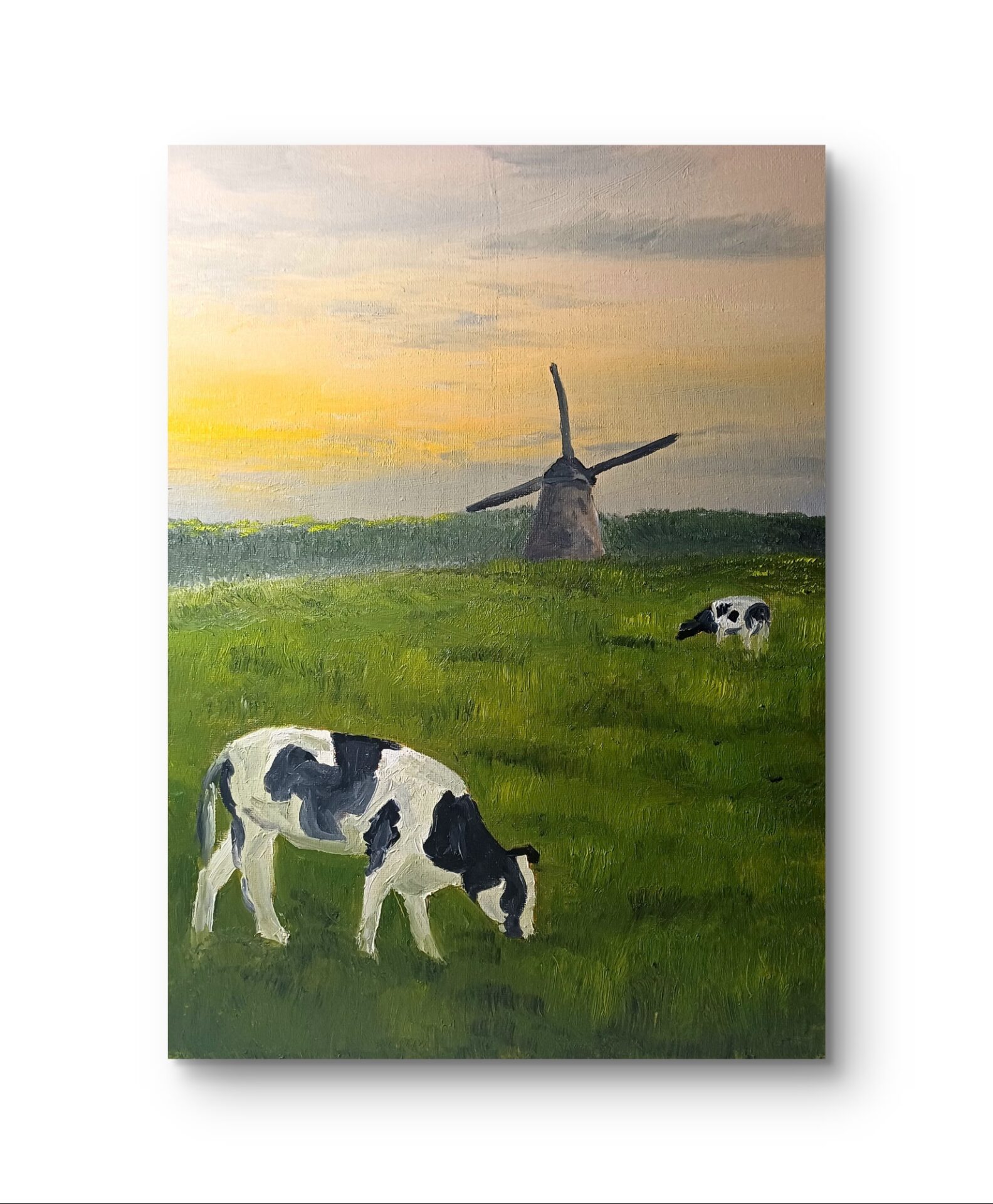 Ten urokliwy obraz przedstawia malowniczy krajobraz z pasącymi się krowami na tle wiatraka przy zachodzącym słońcu. Zastosowana technika olejna oddaje ciepło i głębię sceny, tworząc atmosferę spokoju i harmonii. Idealny do wnętrz, które cenią naturalne piękno.
