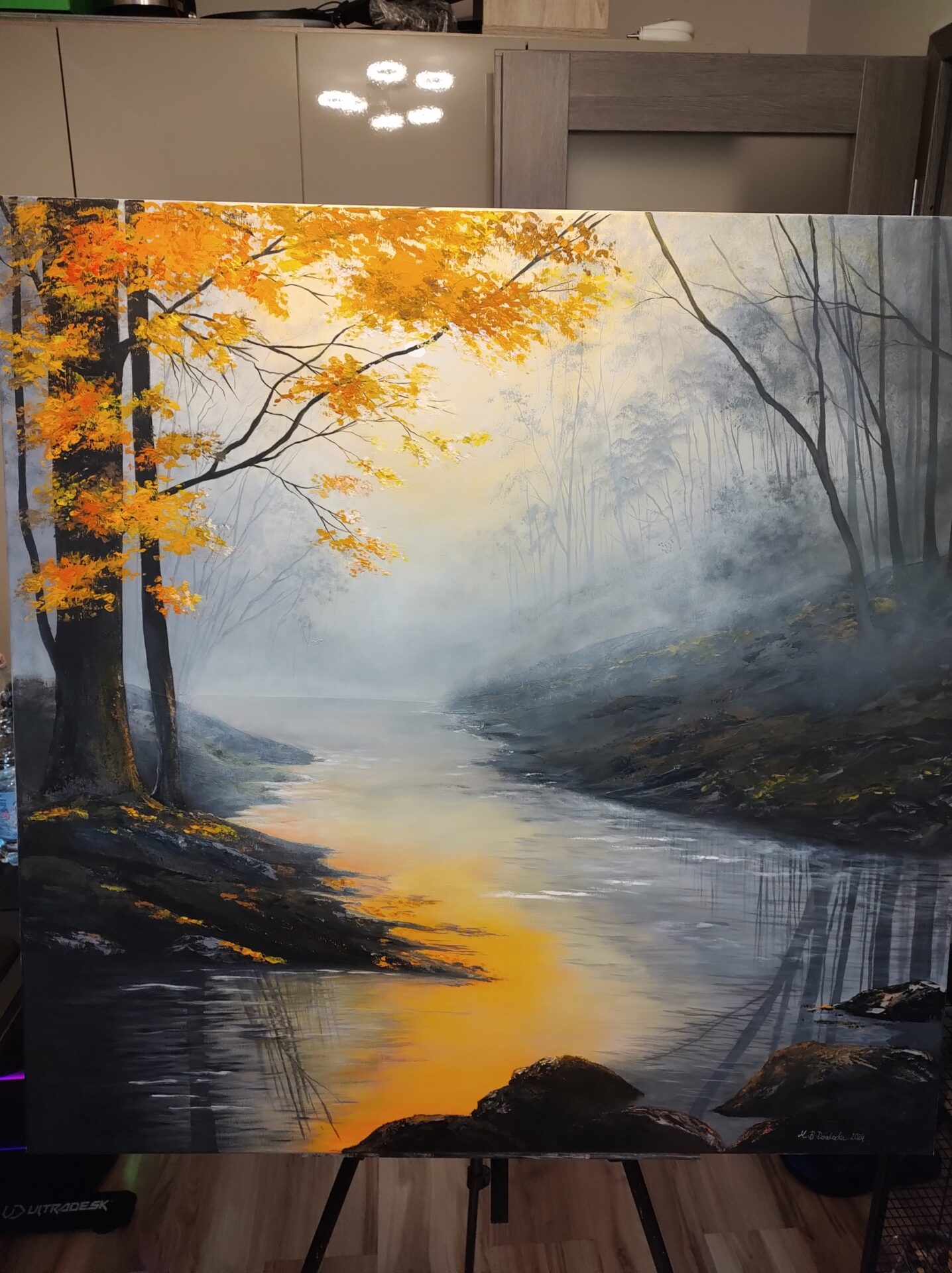 Obraz mojego autorstwa namalowany profesjonalnymi farbami akrylowymi na podobraziu bawełnianym pokrytym grubym włoskim płótnem naciągniętym na krosno, wykończony werniksem z połyskiem, sygnowany na awersie i rewersie. Wymiary 100 x 100 cm. Boki zamalowane zgodnie z kolorystyką obrazu.