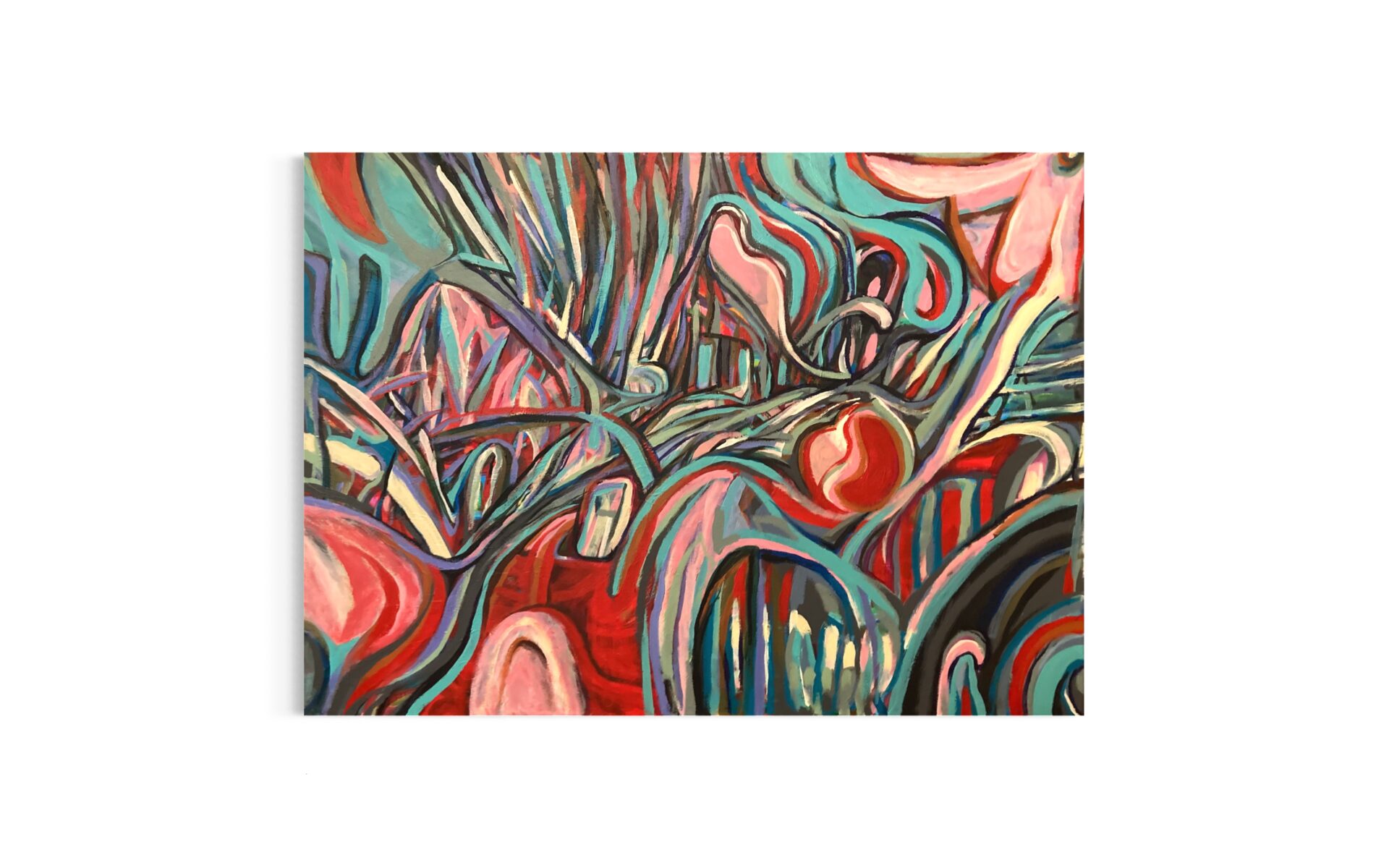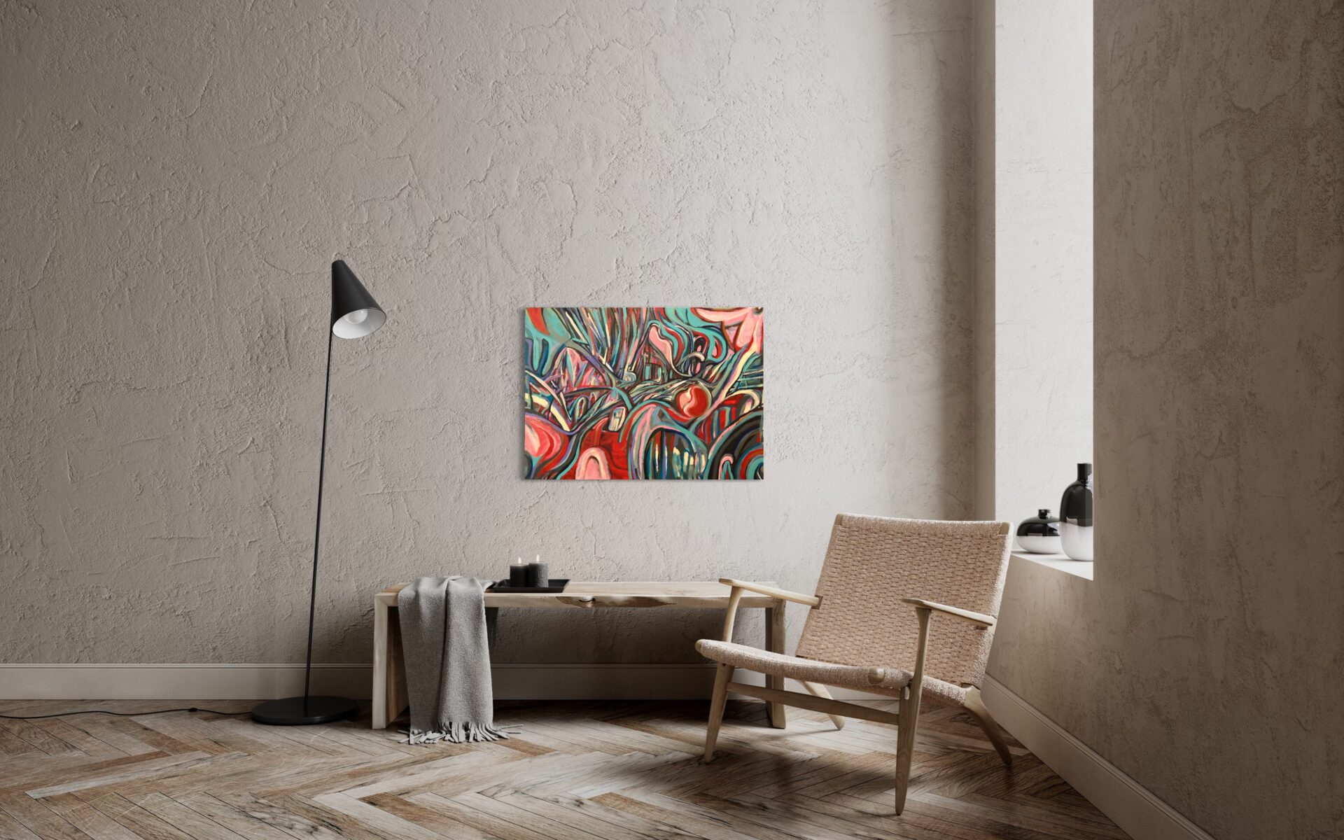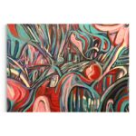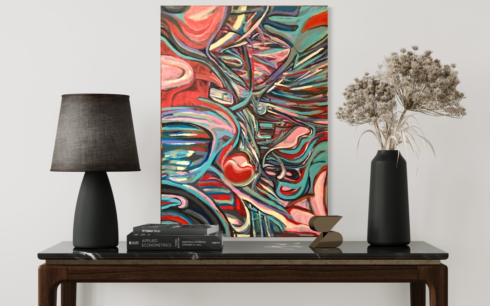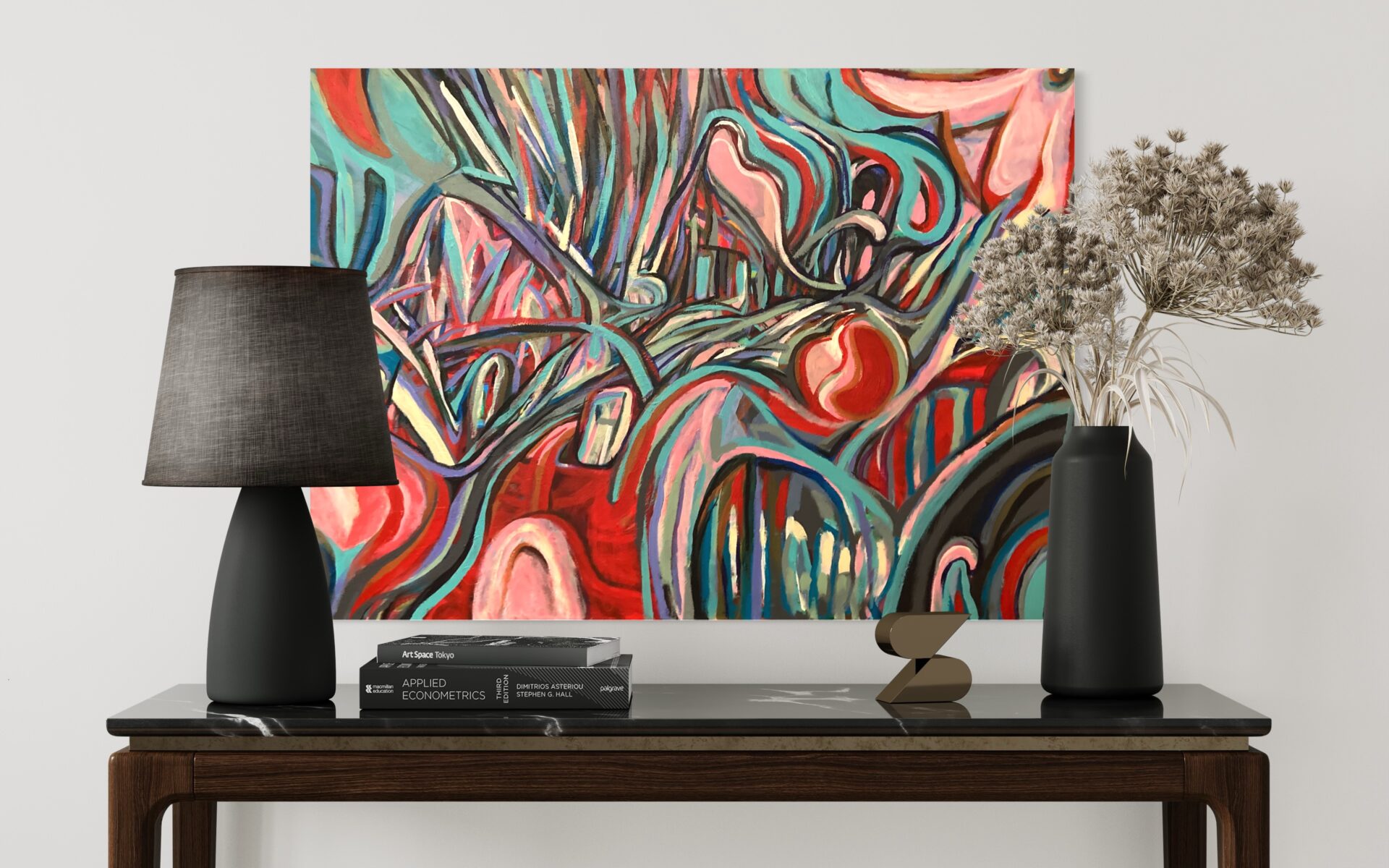 Duży obraz abstrakcyjny, który namalowałam w 2023 roku ma wymiary 65×90 cm. Namalowałam go farbami akrylowymi na podobraziu płóciennym.