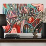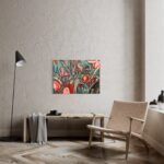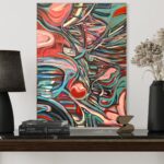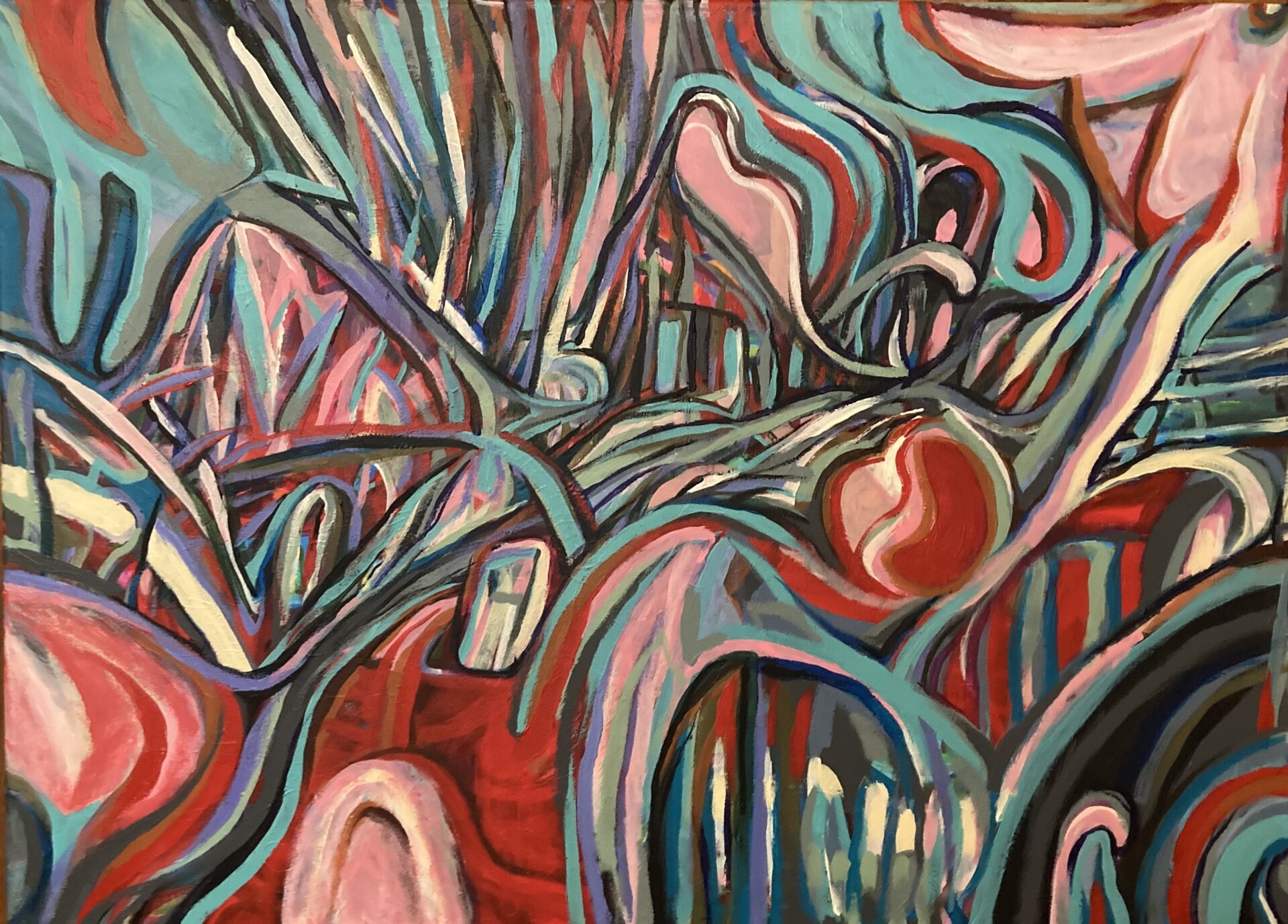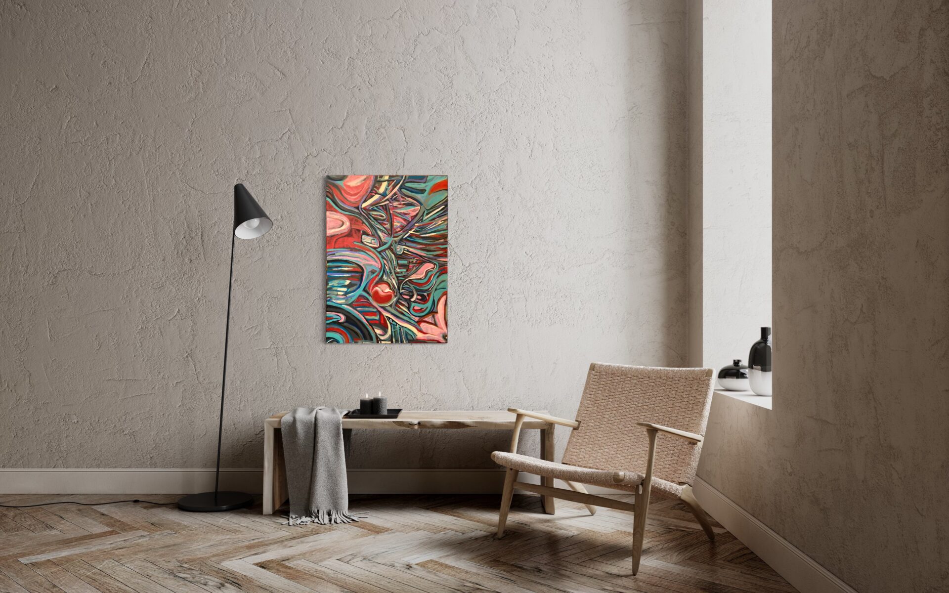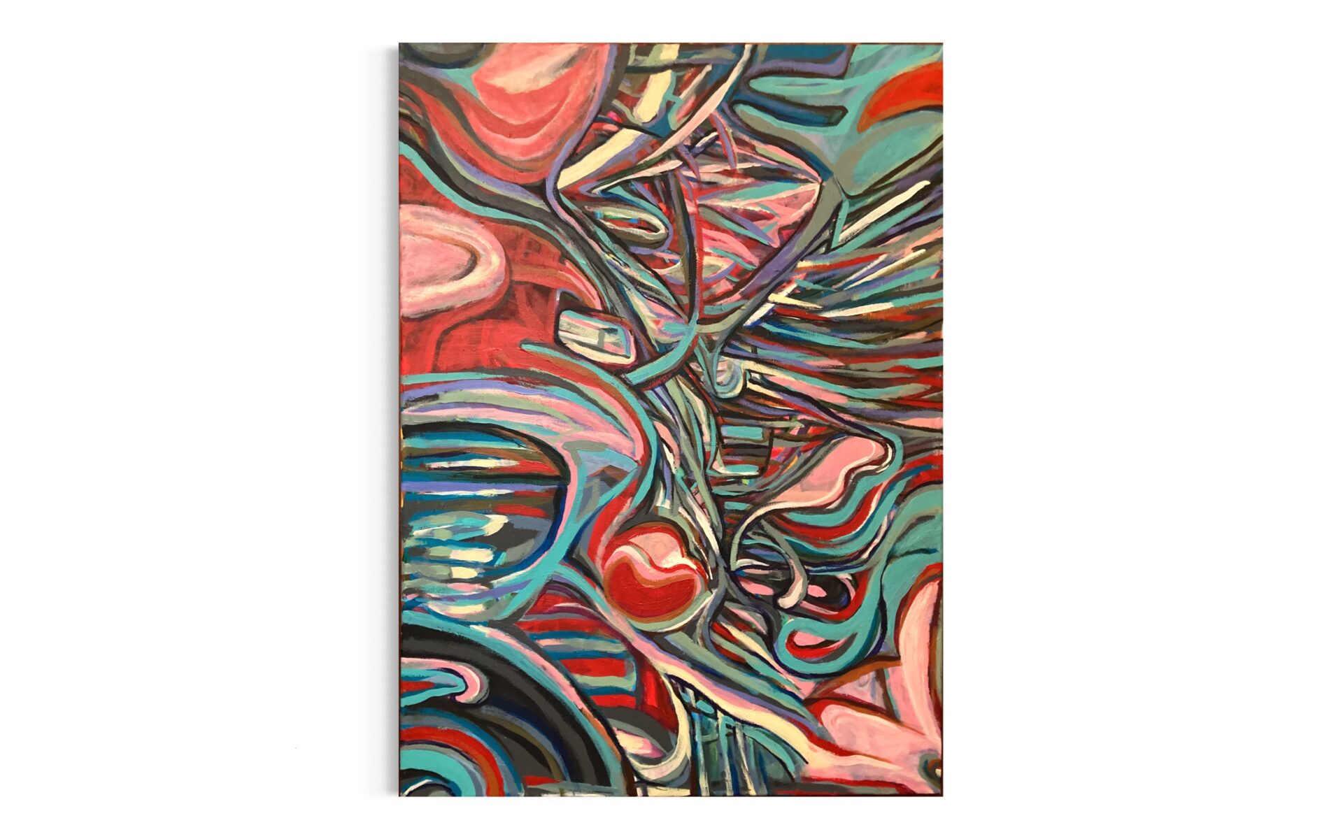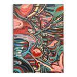 Duży obraz abstrakcyjny, który namalowałam w 2023 roku ma wymiary 65×90 cm. Namalowałam go farbami akrylowymi na podobraziu płóciennym.