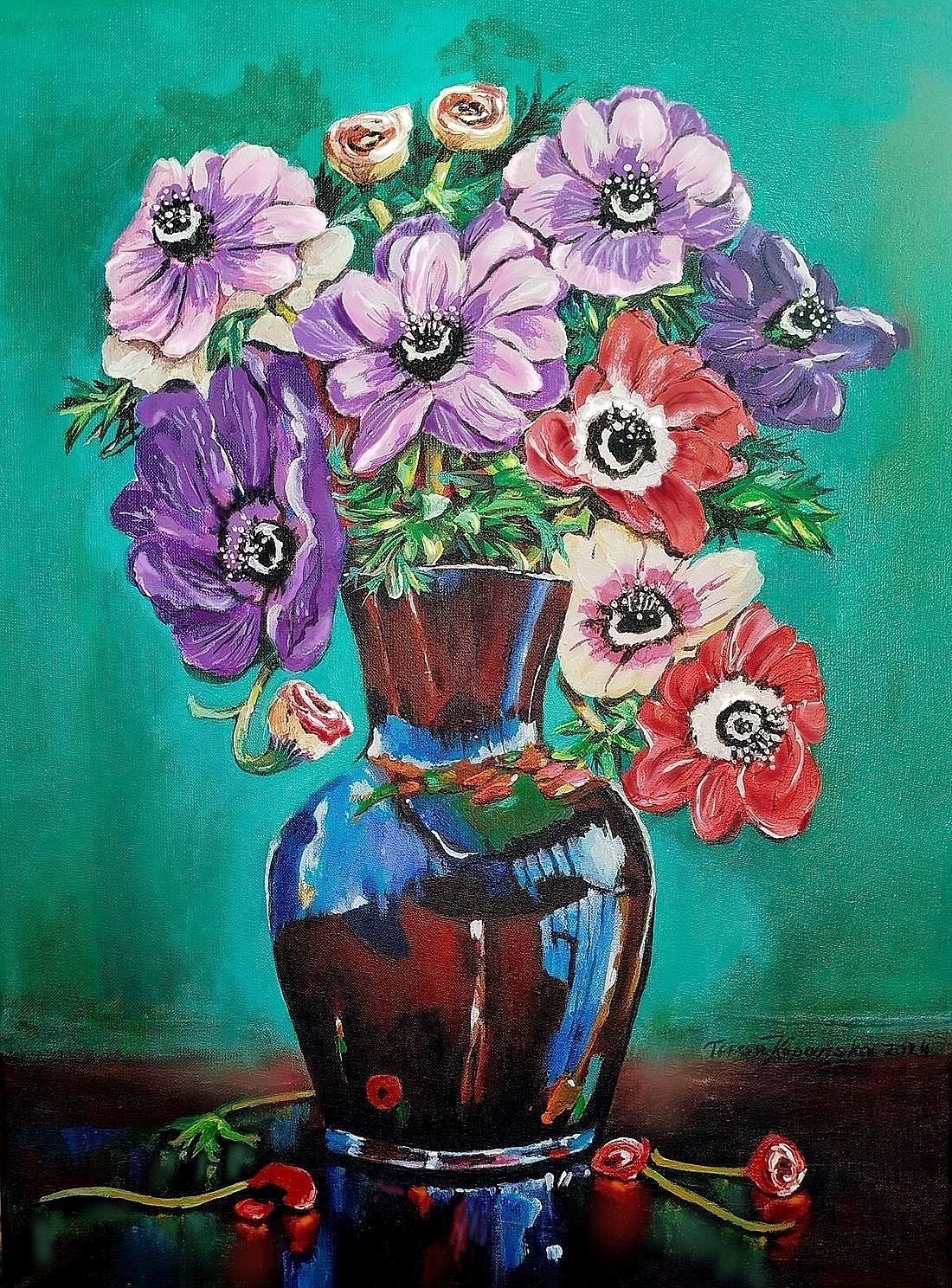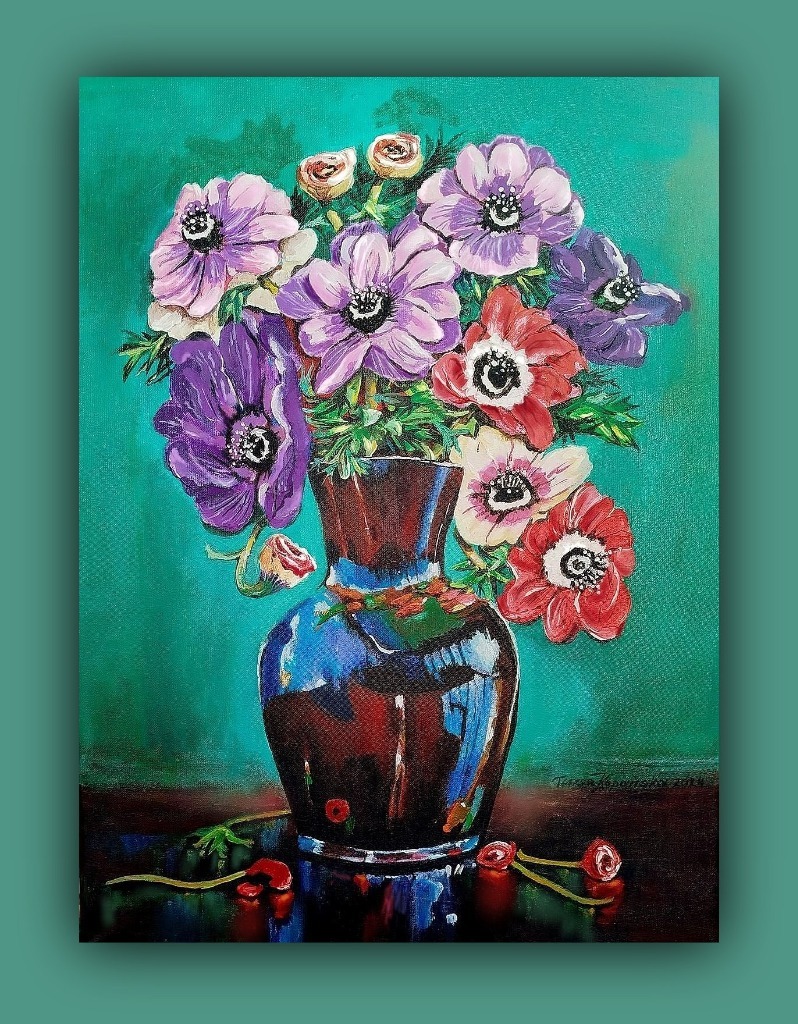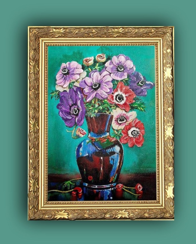 „Córki wiatru” (Anemony ) Malowany techniką olejną na płótnie malarskim. Rok powstania obrazu 2024 Wymiary obrazu 30 cm x 41 cm bez ramy, ale ma zamalowane boki w kolorze tła płótna (obrazu) co wskazuje, że dzieło można zawieść na ścianie nawet bez ram. Zawieszony obraz na ścianie bez ram „Córki wiatru” nie tracą na swoim pięknym wyglądzie. Obraz jest zabezpieczony werniksem co oznacza jego długa żywotność i nie zniszczalność farb i kolorów. Autorem dzieła jest Teresa Kopańska artysta – malarz. Z przodu obrazu jest sygnatura autorki, również na odwrocie płótna. Serdecznie zapraszam do zakupu nie tych pięknych kwiatów zwane potocznie Anemonami, czyli „Córkami wiatru” Obraz charakteryzuje się wyrazistością kolorów i barw. Obraz przedstawiony jest do wglądu w wirtualnych ramach.