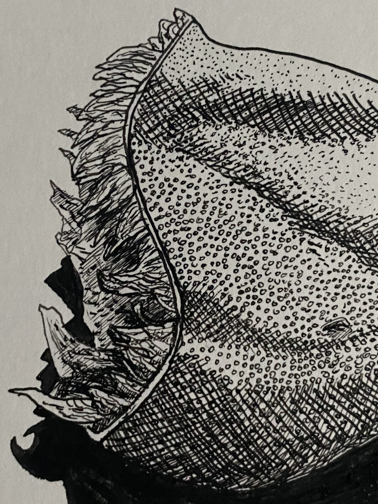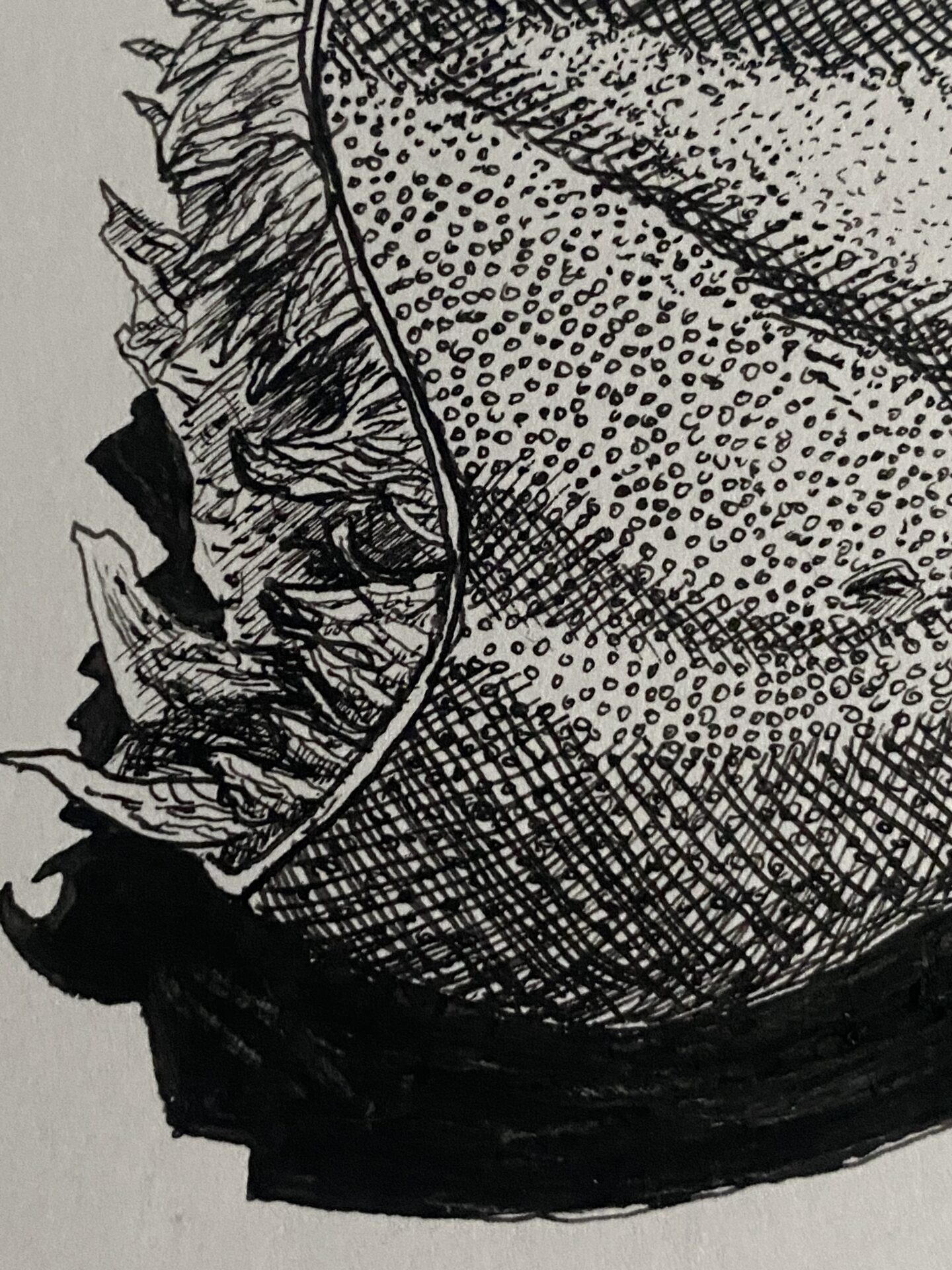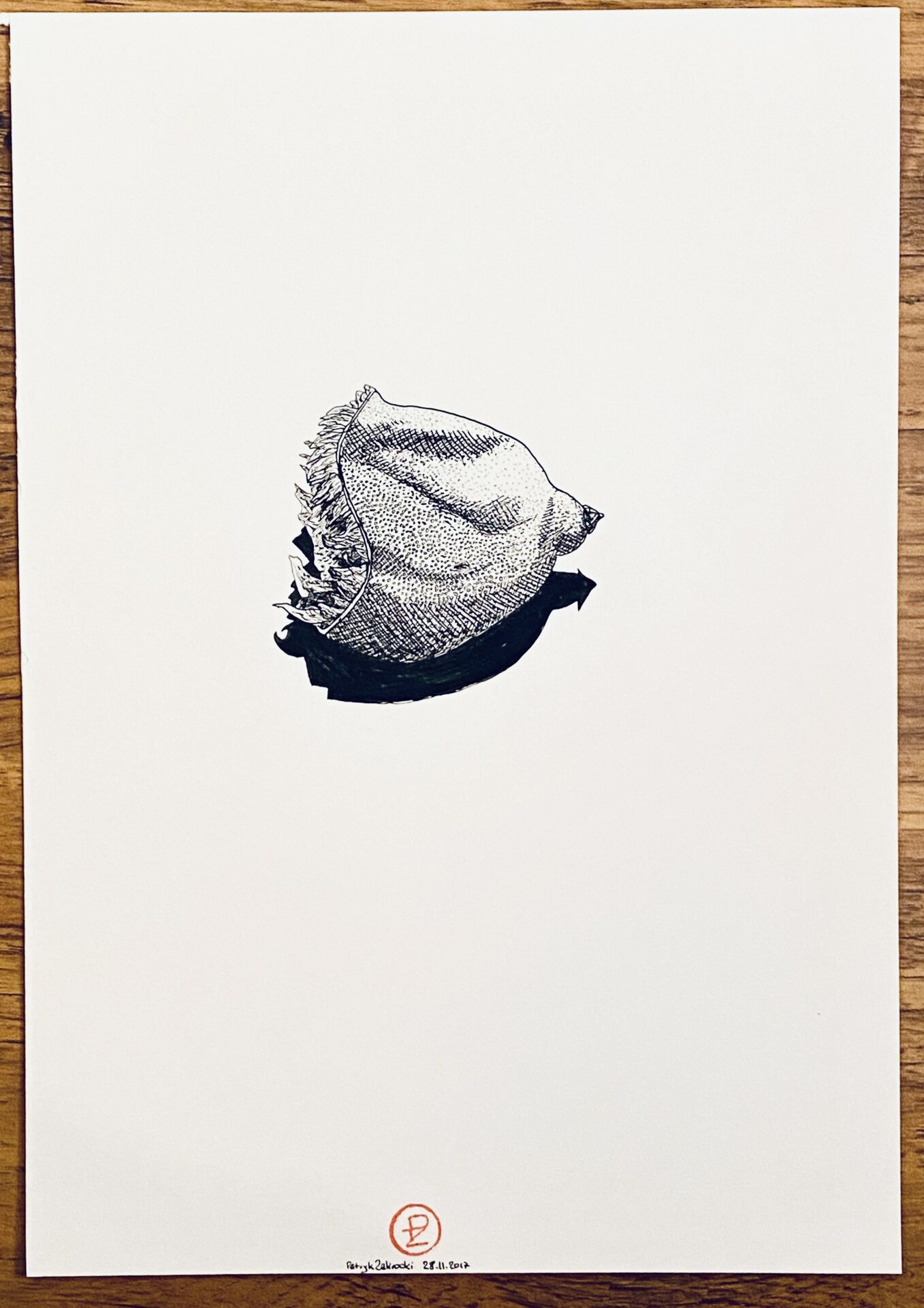 Rysunek piórkiem. Czarny tusz na papierze. Praca z cyklu „Przedmioty w ostrym świetle” . Praca sygnowana podpisem i stemplem.