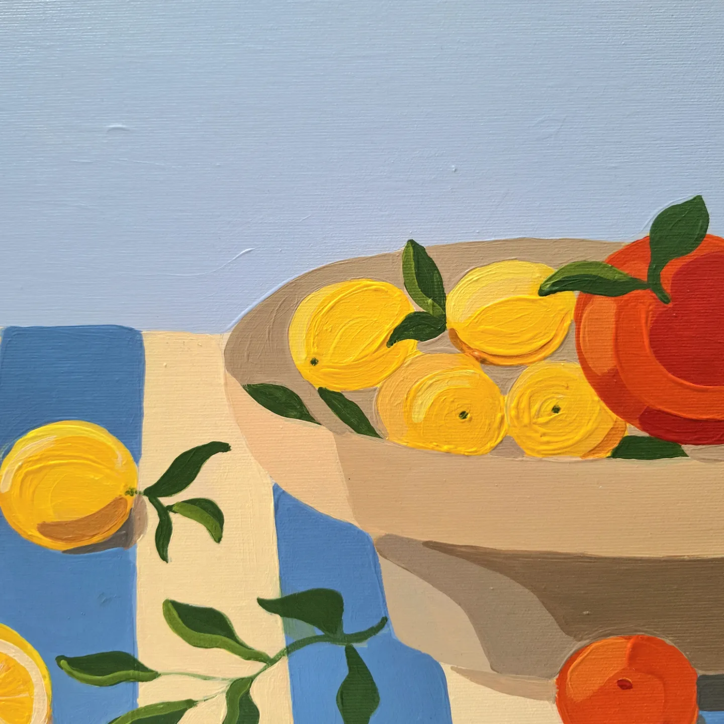 Obraz „Cytryny” na wysokiej jakości płótnie bawełnianym, w formacie 50×50, wykonany w technice akrylu. Zabezpieczony werniksem. Posiada zamalowane boki, będące przedłużeniem obrazu. Sprzedawany bez ramy.