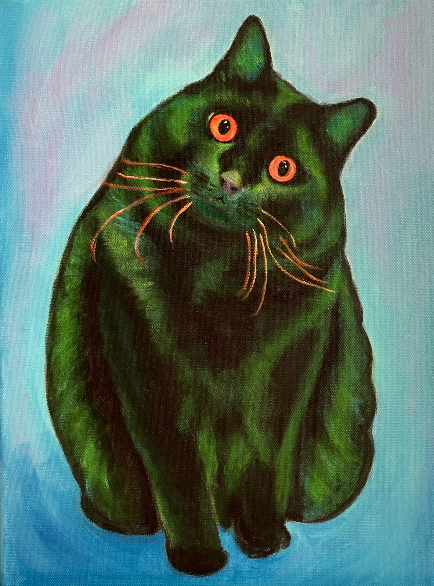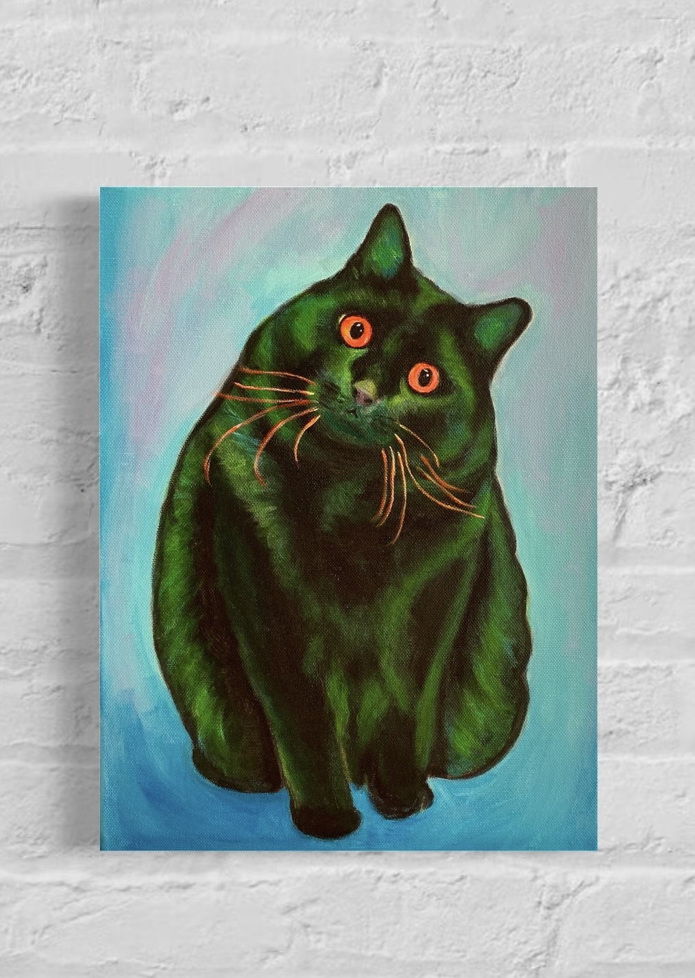 Piękny obraz zielonego-czarnego kotka malowany ręcznie akrylami na płótnie. Wymiary – 30 x 40 cm