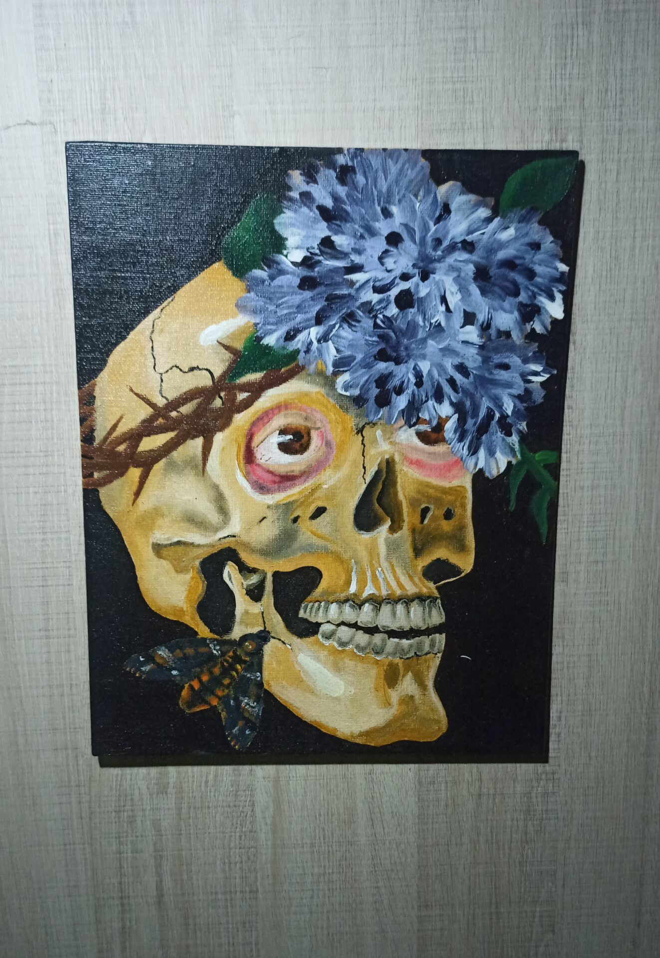 Obraz namalowany akrylami na płótnie, całość pokryta werniksem. Obraz ma pokazać ludzkie cierpienie, bezsilność człowieka ale także związek życia i śmierci.