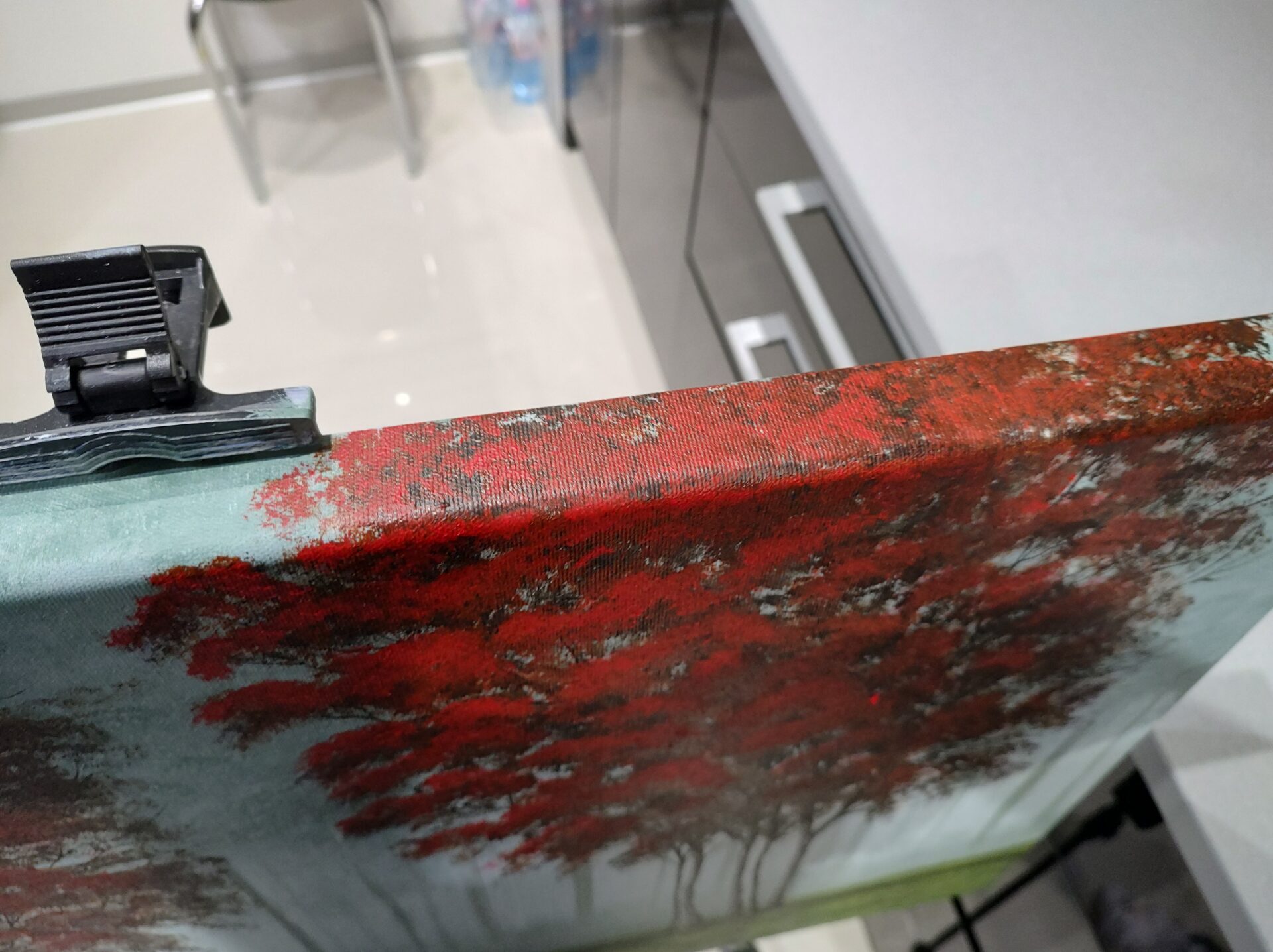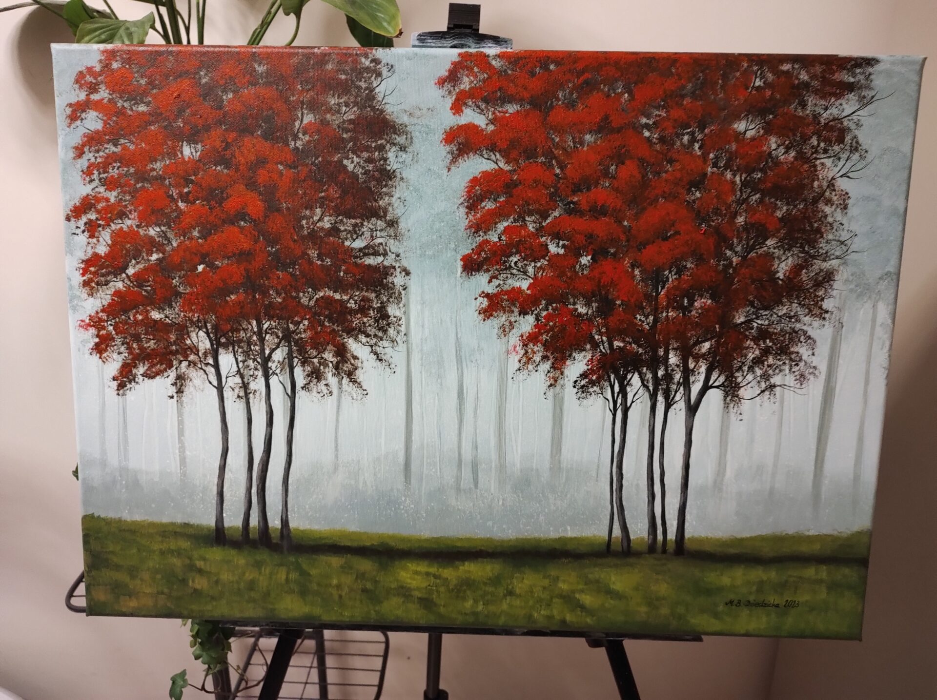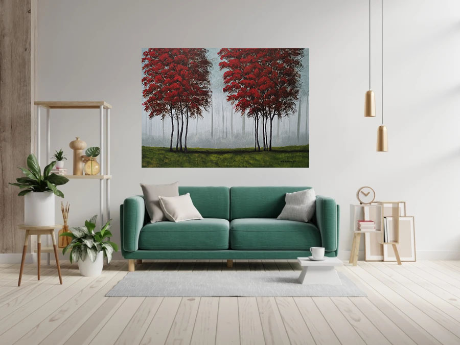 Przedstawiam obraz mojego autorstwa, pt.: ” Czerwone drzewa”, namalowany profesjonalnymi farbami akrylowymi ( firm: Winsor & Newton, Liquitex oraz Amsterdam) na podobraziu bawełnianym 3D ( oznacza to, że sosnowa blejtrama na którą naciągnięte jest płótno jest gruba – szerokość 3 cm) pokrytym grubym włoskim płótnem o doskonałej jakości. Boki obrazu są zamalowane ( przedłużenie pejzażu). Obraz nie wymaga oprawy, można swobodnie go powiesić na ścianie. Został wykończony i zabezpieczony werniksem z połyskiem. Obraz prezentuje się bardzo efektownie i oryginalnie. Podpis autora znajduje się na awersie i rewersie. Wszystkie materiały użyte do stworzenia obrazu są wysokiej jakości aby Kupujący mógł cieszyć się nim przez bardzo długie lata.