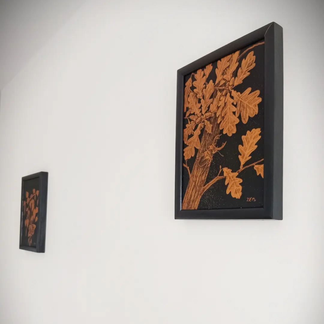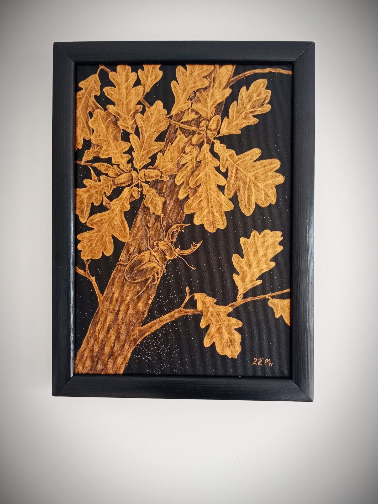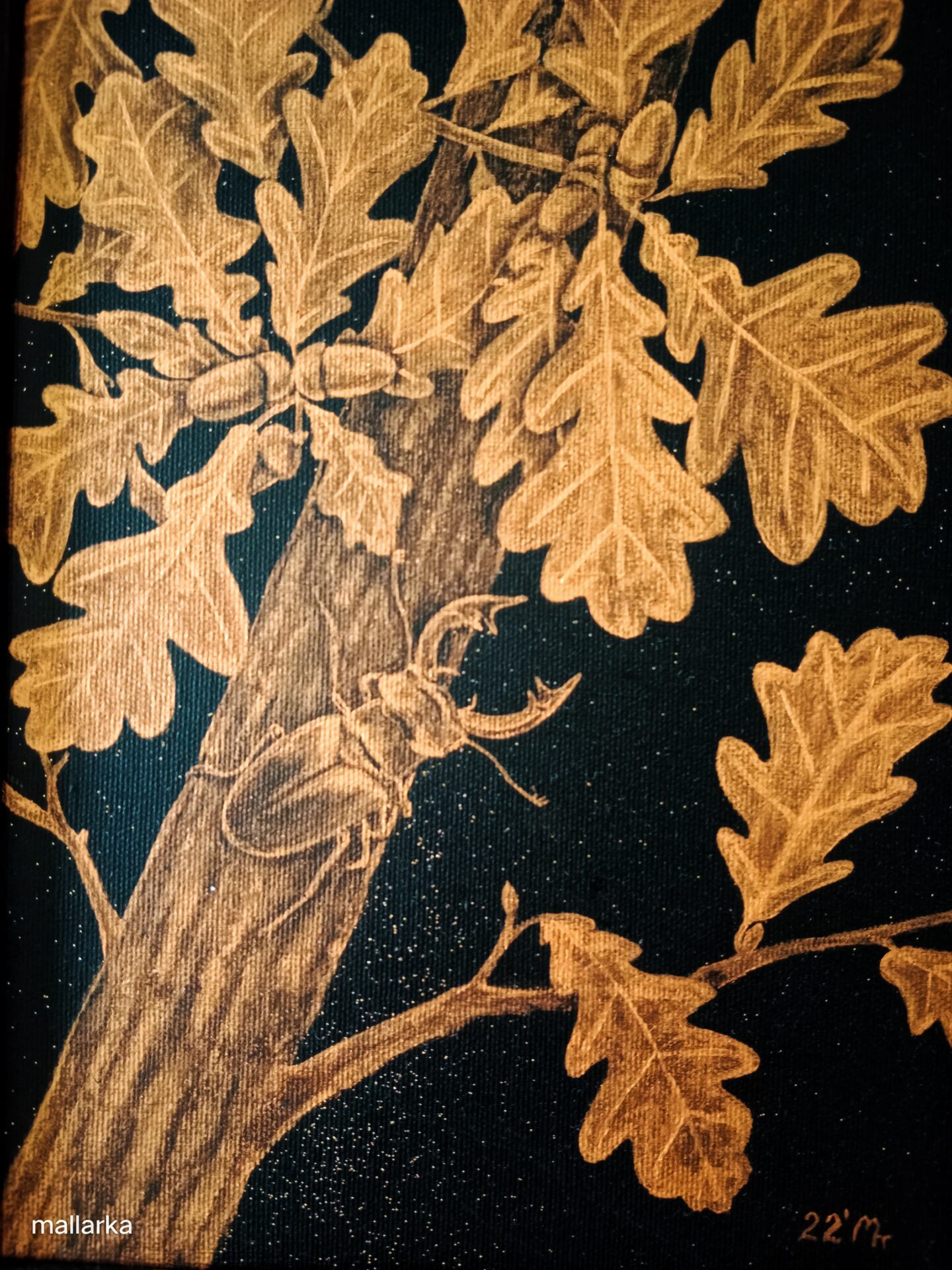 „Dąb” to czarno-zloty obraz z kolekcji „Złota Natura”. Obraz namalowany farbami akrylowymi z dodatkiem złotego brokatu. Oprawiony w drewnianą ramkę. Kompozycja dostojna, harmonijna.