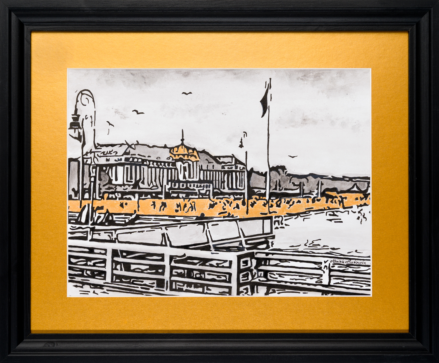Praca „Dawny Sopot Grand Hotel i Molo I”, 2021 należy do cyklu obrazów przedstawiających motywy dawnego i współczesnego Sopotu, Gdańska oraz Gdyni. Praca pozwoli podkreślić indywidualny charakter Twojego wnętrza oraz podnieść jego prestiż. Prace są niepowtarzalne, wykonane piórkiem, tuszem oraz farbami akwarelowymi i akrylowymi. Każda praca jest sygnowana i oprawiona w passe-partout oraz czarną elegancką ramę o wymiarach 57×47 cm