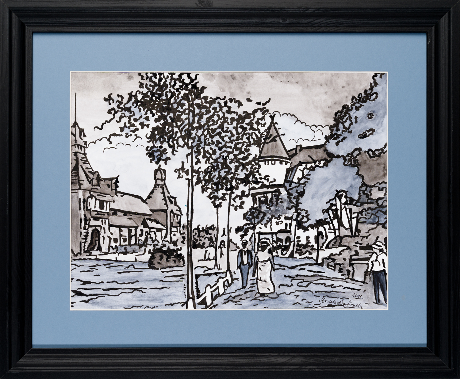 „Dawny Sopot Łazienki Południowe” 2021 należy do cyklu obrazów przedstawiających motywy dawnego i współczesnego Sopotu, Gdańska oraz Gdyni. Praca pozwoli podkreślić indywidualny charakter Twojego wnętrza oraz podnieść jego prestiż. Prace są niepowtarzalne, wykonane piórkiem, tuszem oraz farbami akwarelowymi i akrylowymi. Każda praca jest sygnowana i oprawiona w passe-partout oraz czarną elegancką ramę o wymiarach 57×47 cm
