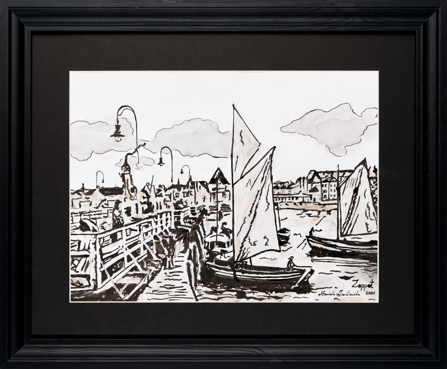 „Dawny Sopot Żagle Molo” 2021 należy do cyklu obrazów przedstawiających motywy dawnego i współczesnego Sopotu, Gdańska oraz Gdyni. Praca pozwoli podkreślić indywidualny charakter Twojego wnętrza oraz podnieść jego prestiż. Prace są niepowtarzalne, wykonane piórkiem, tuszem oraz farbami akwarelowymi i akrylowymi. Każda praca jest sygnowana i oprawiona w passe-partout oraz czarną elegancką ramę o wymiarach 57×47 cm gotowa do zawieszenia.