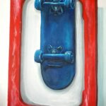 Obraz przedstawia niebeską deskorolkę w czerwonej ramce.