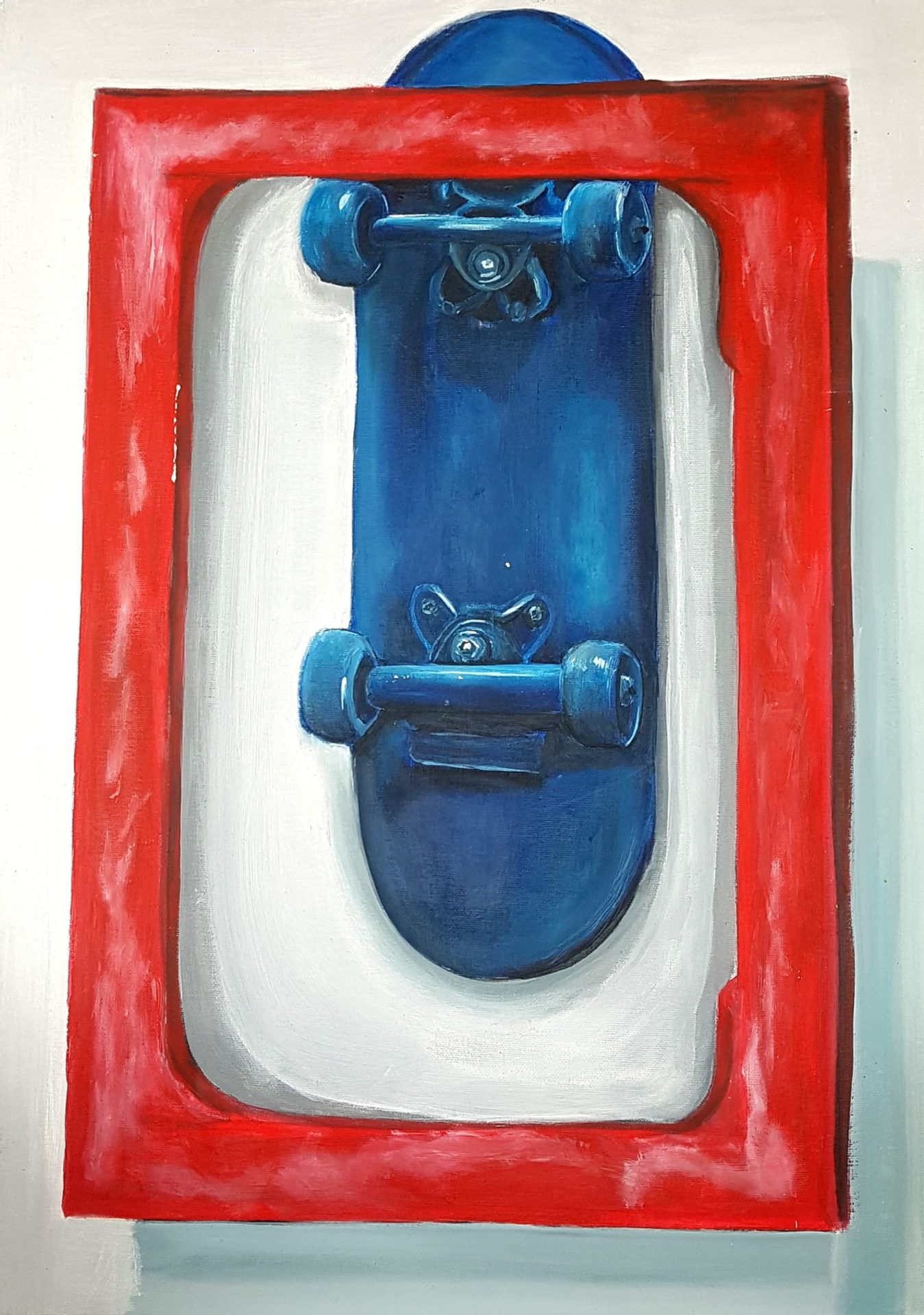 Obraz przedstawia niebeską deskorolkę w czerwonej ramce.