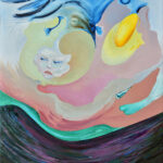 Na obrazie dominują pastelowe odcienie, miękkie róże przechodzące w niebieskości i zielenie, tworzące jakby baśniowy krajobraz. Na pierwszy rzut oka widzimy dynamiczną kompozycję falujących linii, które tworzą kształt przypominający ocean. W centrum obrazu pojawia się tajemnicza twarz o wyrazistych rysach, jakby wyrwana z sennego marzenia. Nad nią unosi się świetliste, żółte koło przypominające słońce rozpuszczające się w niebie. Ten obraz to rollercoaster emocji. Czujemy lekkość, może nieco melancholii, ale i coś magicznego. Trochę jak w filmie, gdzie wszystko może się wydarzyć. Artysta zgrabnie użył techniki mieszanych pociągnięć pędzla, gdzie kolor wlewa się w kolor, tworząc wrażenie ruchu i flow. Da się poczuć to, co w języku angielskim nazwalibyśmy „dreamlike” atmosferą. Dla mnie to przypomina krainę fantazji, pełną tajemnic i ukrytych znaczeń. Myślę, że można odnieść wrażenie, że obraz zaprasza odbiorcę do odkrywania jego głębszych warstw. Wyobraź sobie, że jesteś tam i wszystko jest możliwe. Kolory współgrają jak w magicznej grze świateł, tworząc aurę spokoju i refleksji.