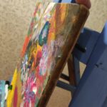 Technika mieszana: akryl na desce, mazak akrylowy, brokat, szkiełka.