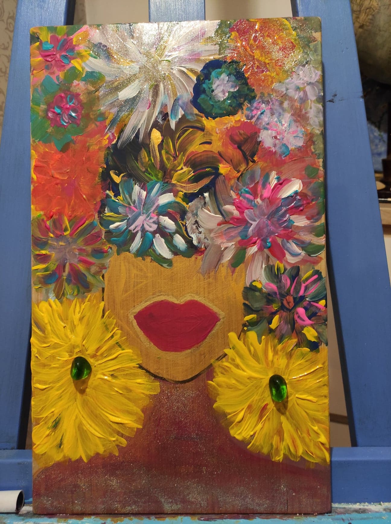 Diana, bogini natury i dzikiej przyrody. Ożywia, rozbawia, pozwala odetchnąć nadzieją. Kwiaty, które dominują na każdym moim obrazie to symbol radości życia. Absolutnie energetyzujące barwy podnoszą na duchu. Aż chce się żyć!