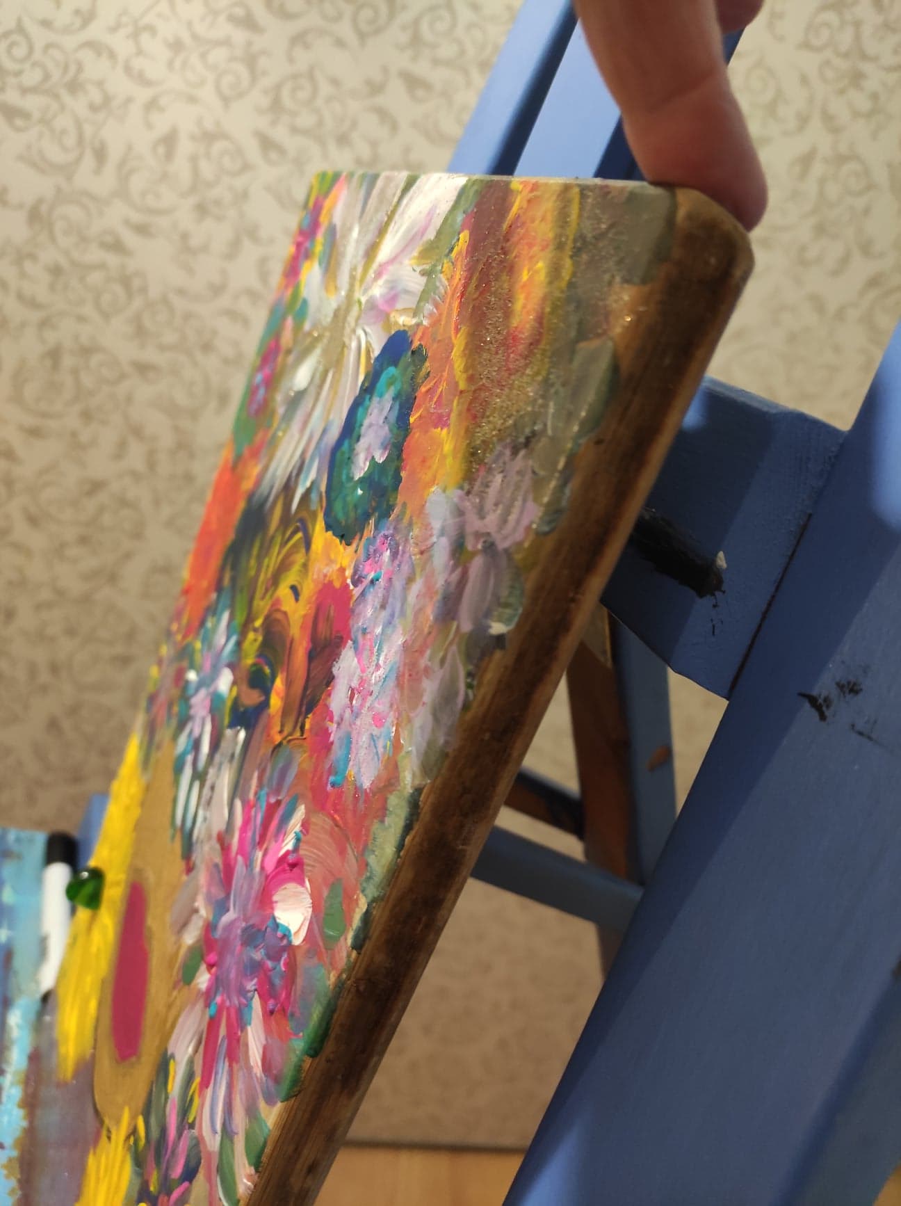 Technika mieszana: akryl na desce, mazak akrylowy, brokat, szkiełka.