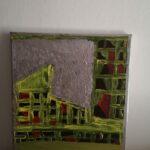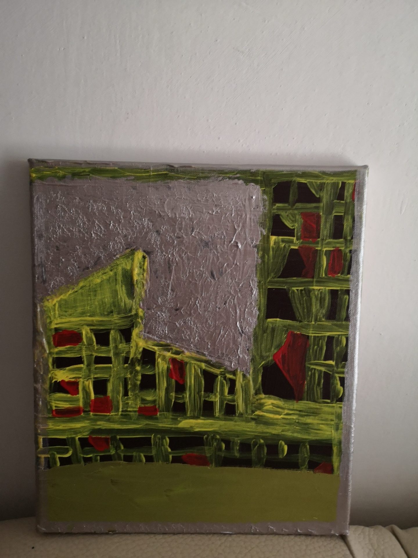 Obraz malowany na płótnie. Zieleń, czerwień i srebrny kolor jest dominujący.