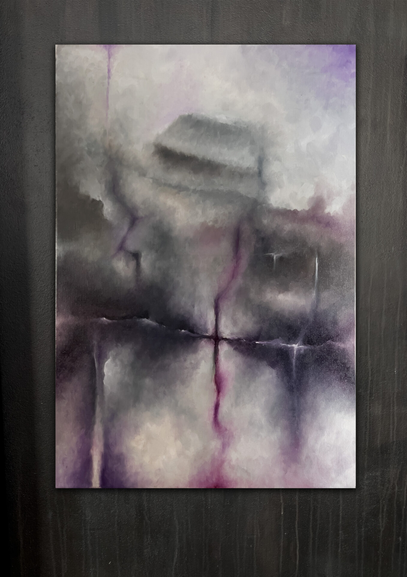 Obraz namalowany olejami, w odcieniach szarości, różu i fioletu, wymiary 50×70 cm