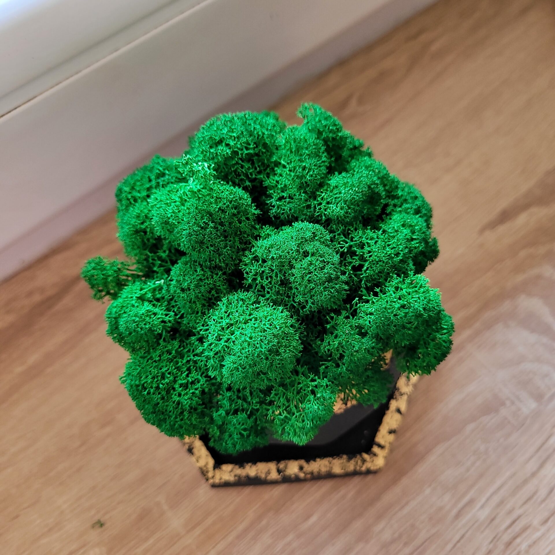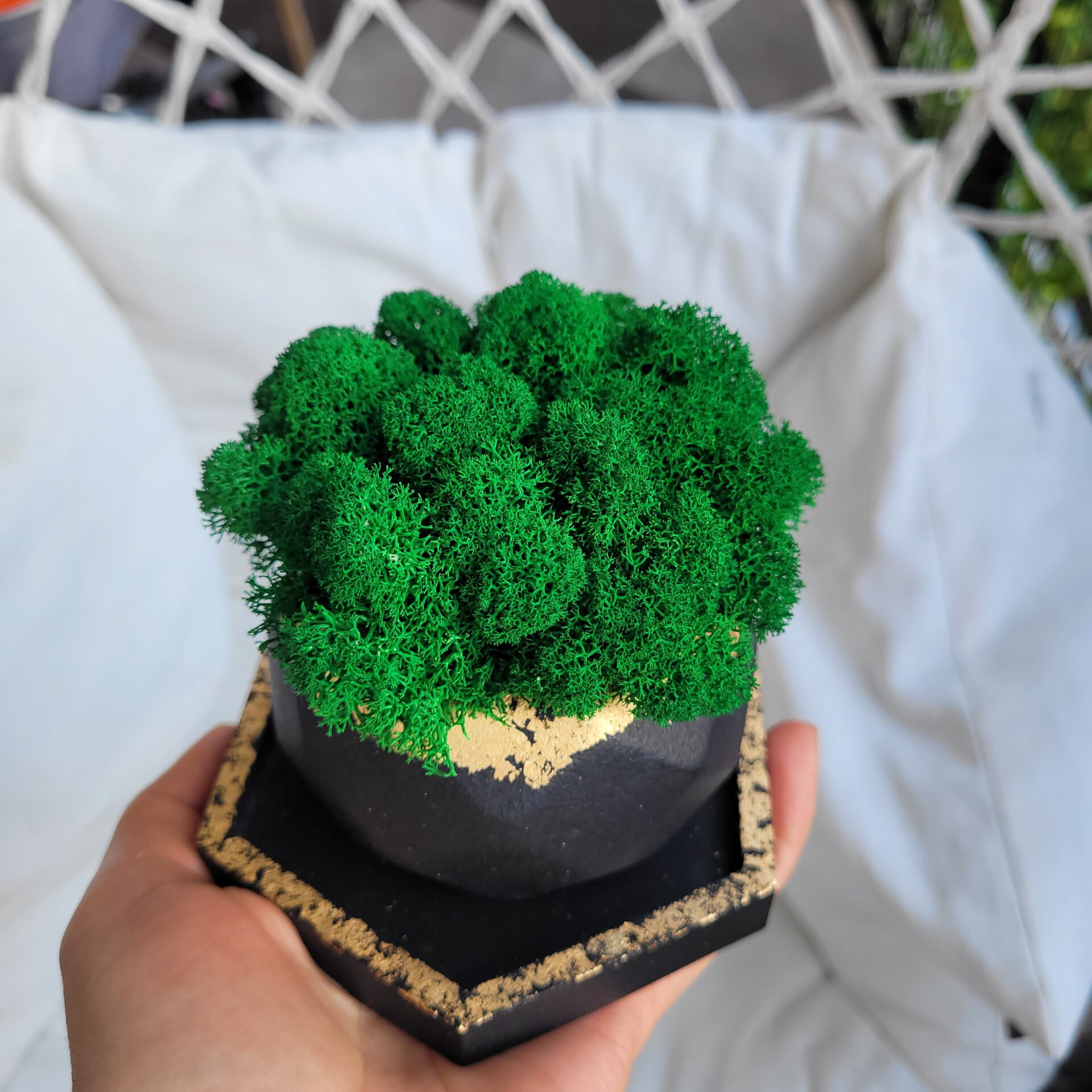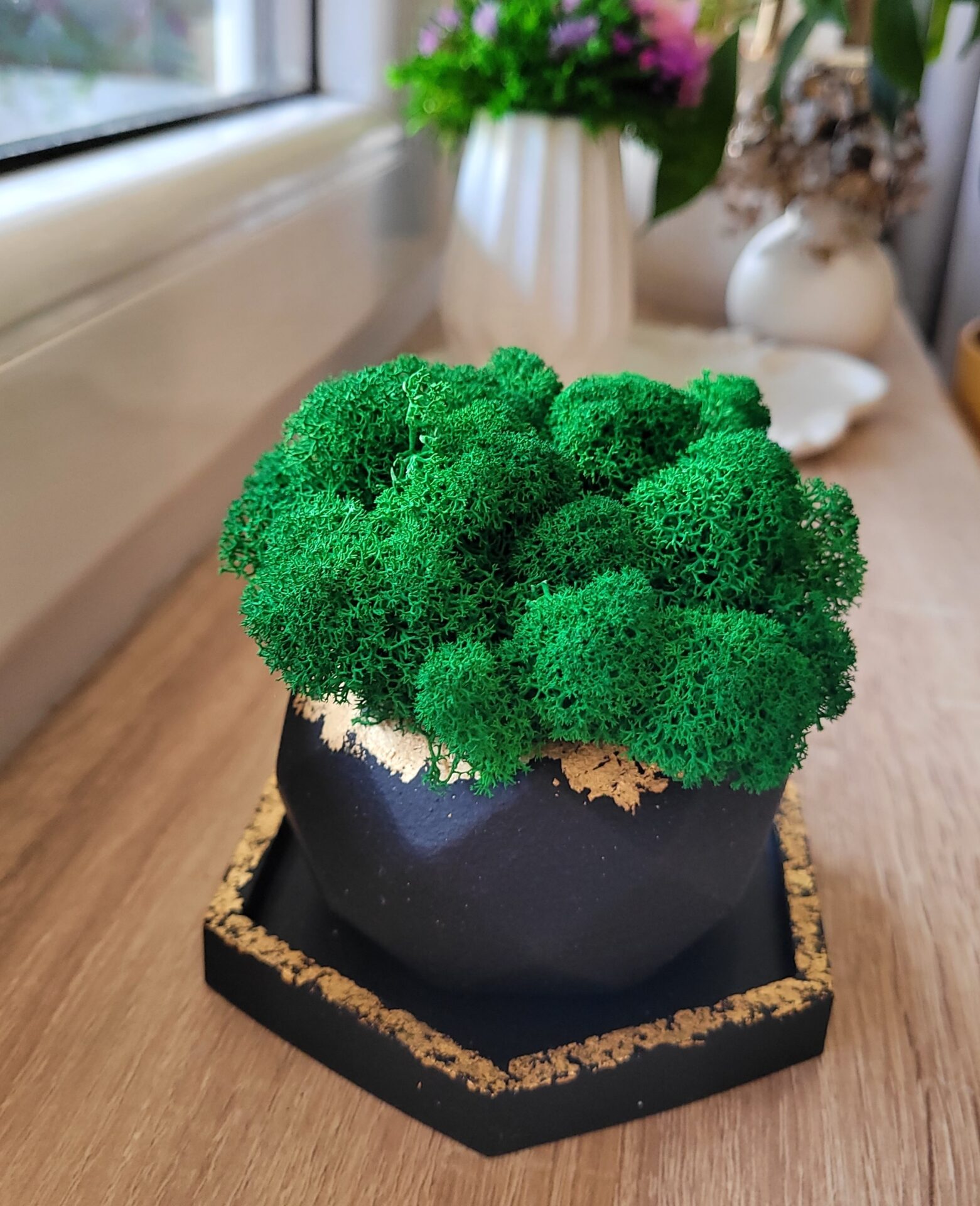 Elegancki zestaw, który doda naturalnego uroku każdemu wnętrzu! Zestaw zawiera oryginalną okrągłą doniczkę z gipsu, wypełnioną intensywnie zielonym mchem chrobotkiem, oraz podstawkę.