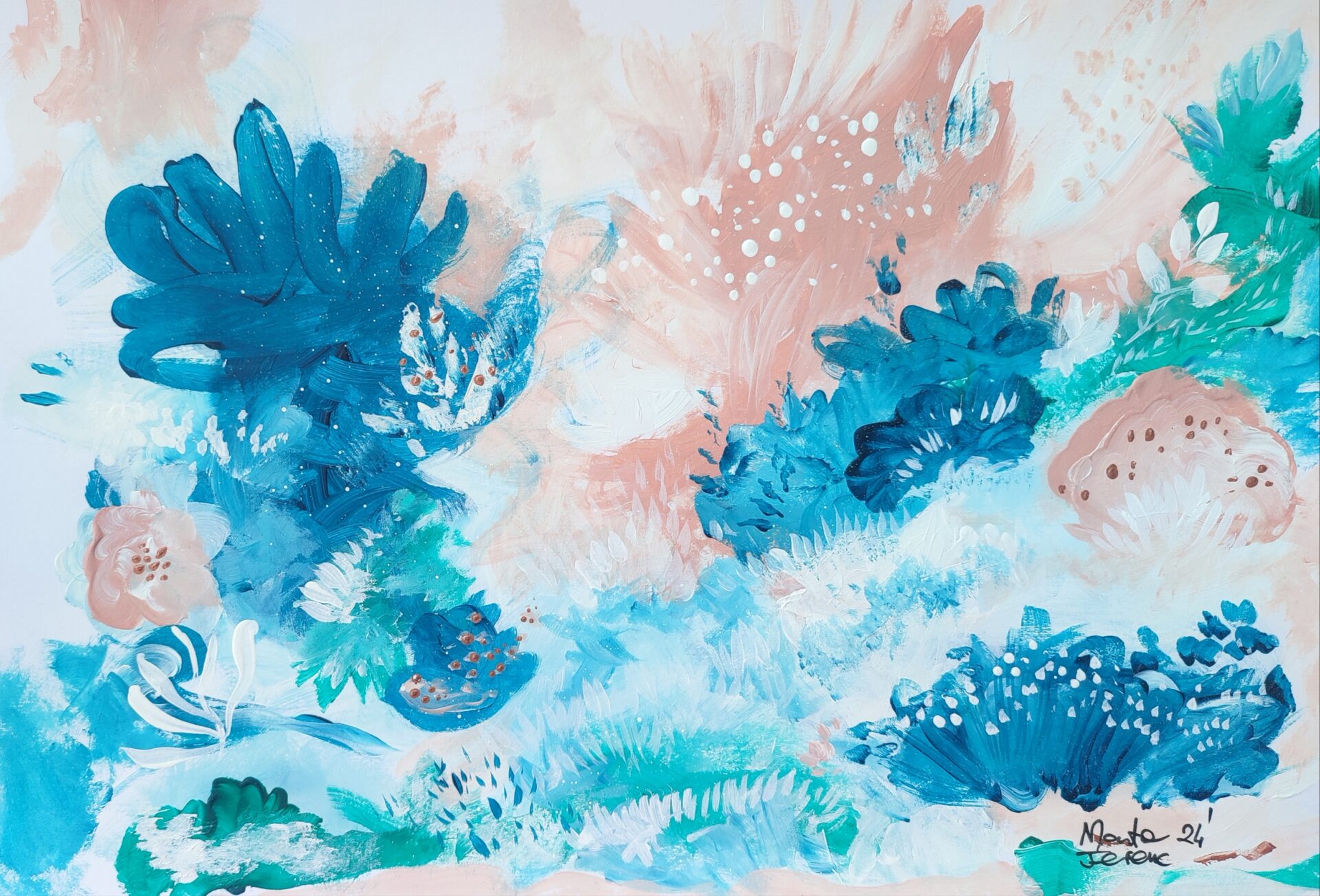 Obraz akrylowy wykonany na papierze o wysokiej jakości, inspirowany naturą. Piękne żywe oraz pastelowe kolory. Jedyny w swoim rodzaju i bardzo oryginalny. Idealny do oprawienia w białą ramę. Obraz sygnowany z przodu oraz z tyłu.