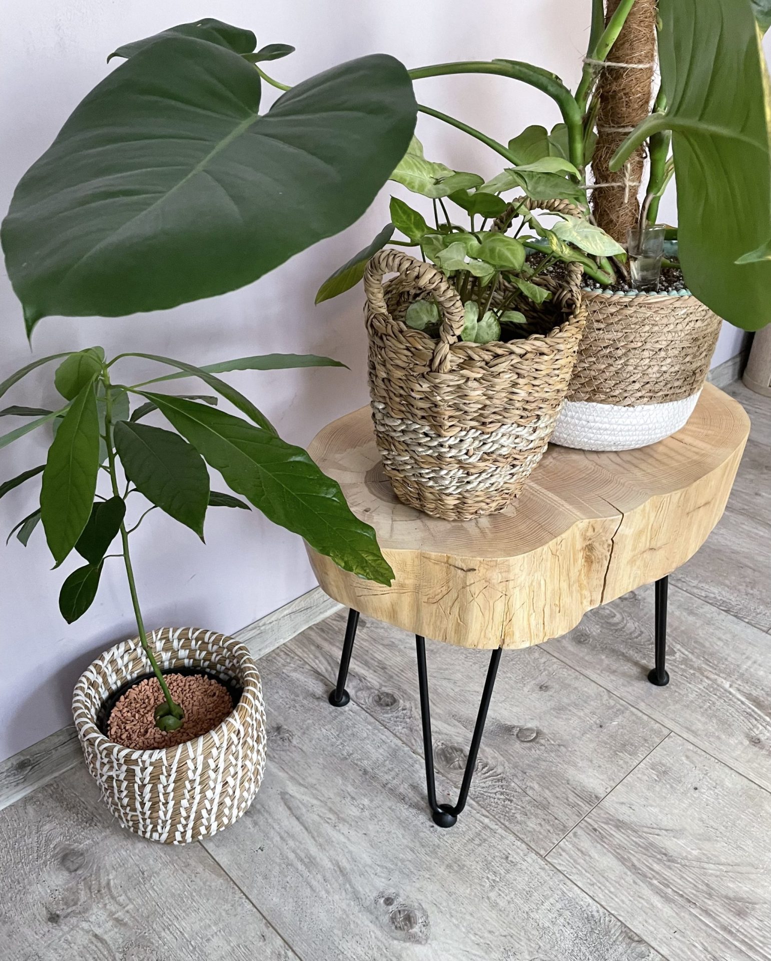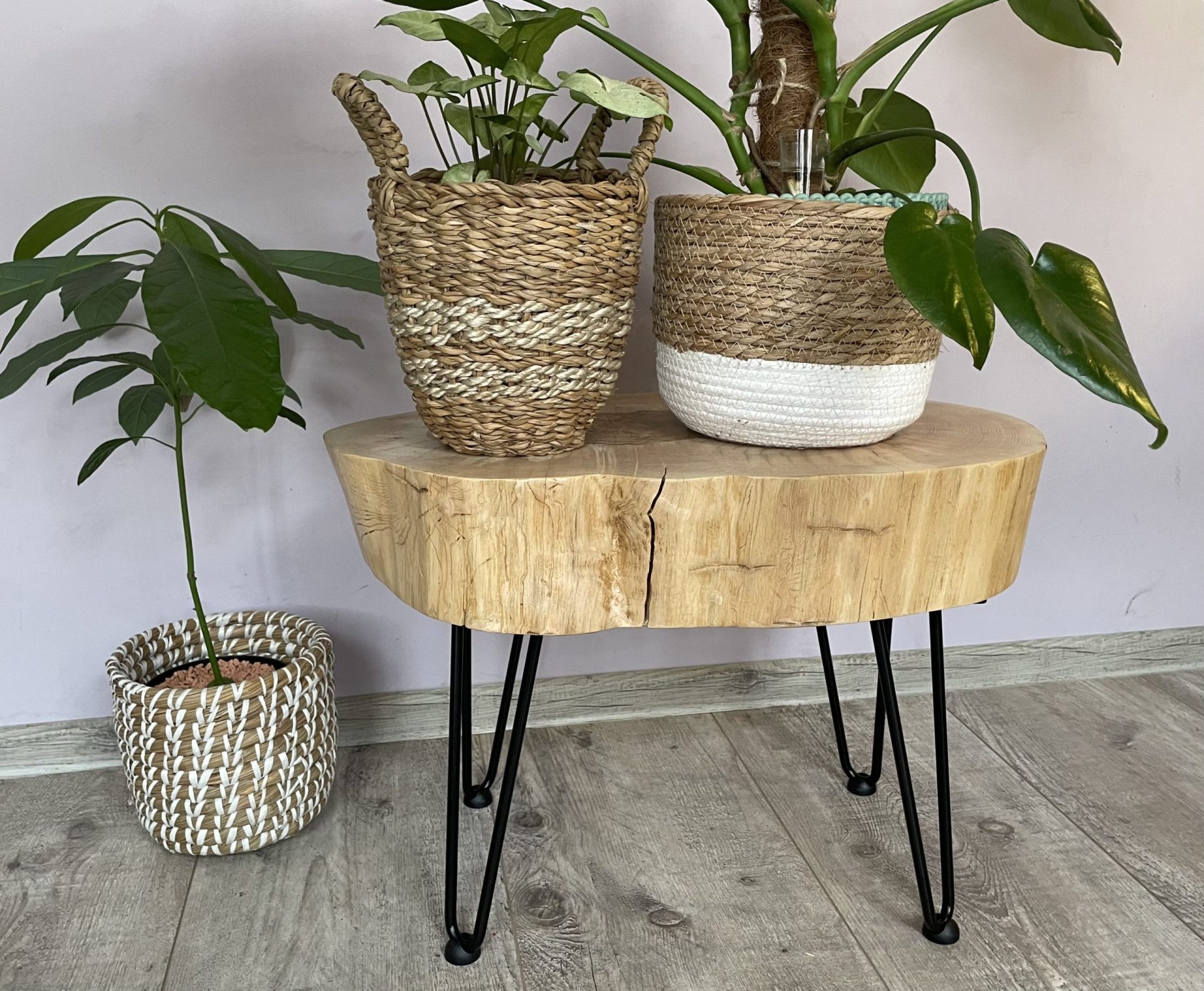 Stolik na 4 metalowych nogach o wysokości 31 cm + drewniany plaster o wysokości 11 cm.
