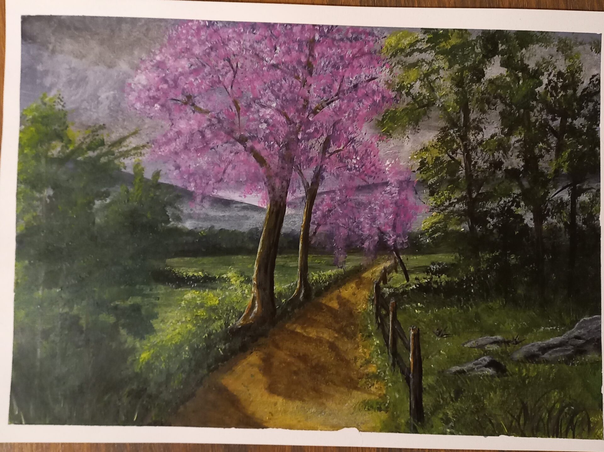 Pejzaż. Papier bez ramy, technika akrylowa, jeden z moich pierwszych obrazów.