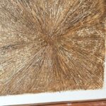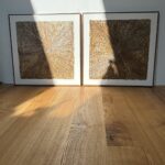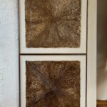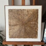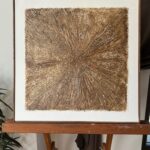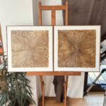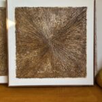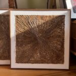 Obrazy strukturalne w brązowych kolorach o charakterze drzewa. Obrazy o wymiarach 50×50 każdy, oprawione w ramy typu amerykańskim.