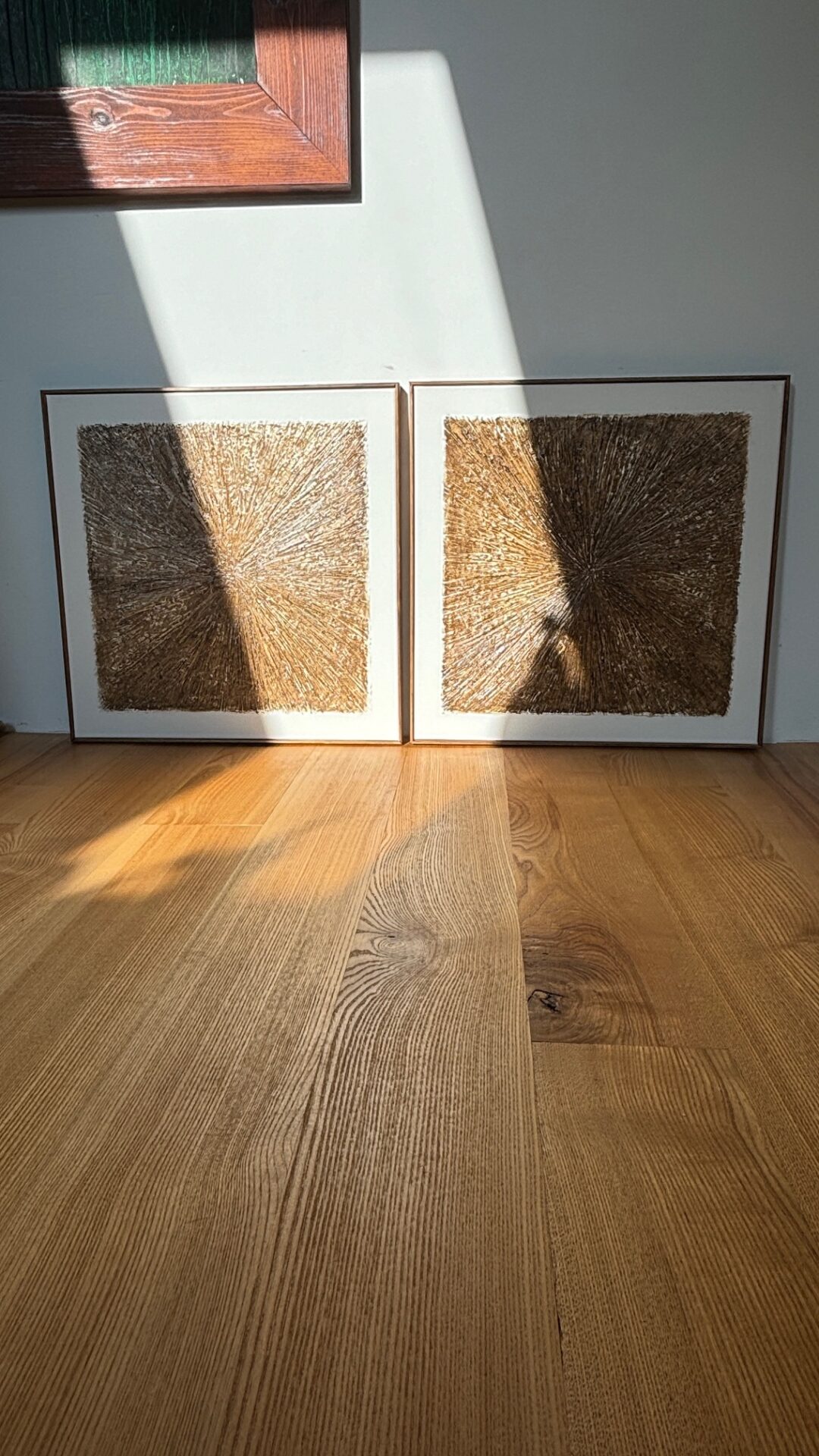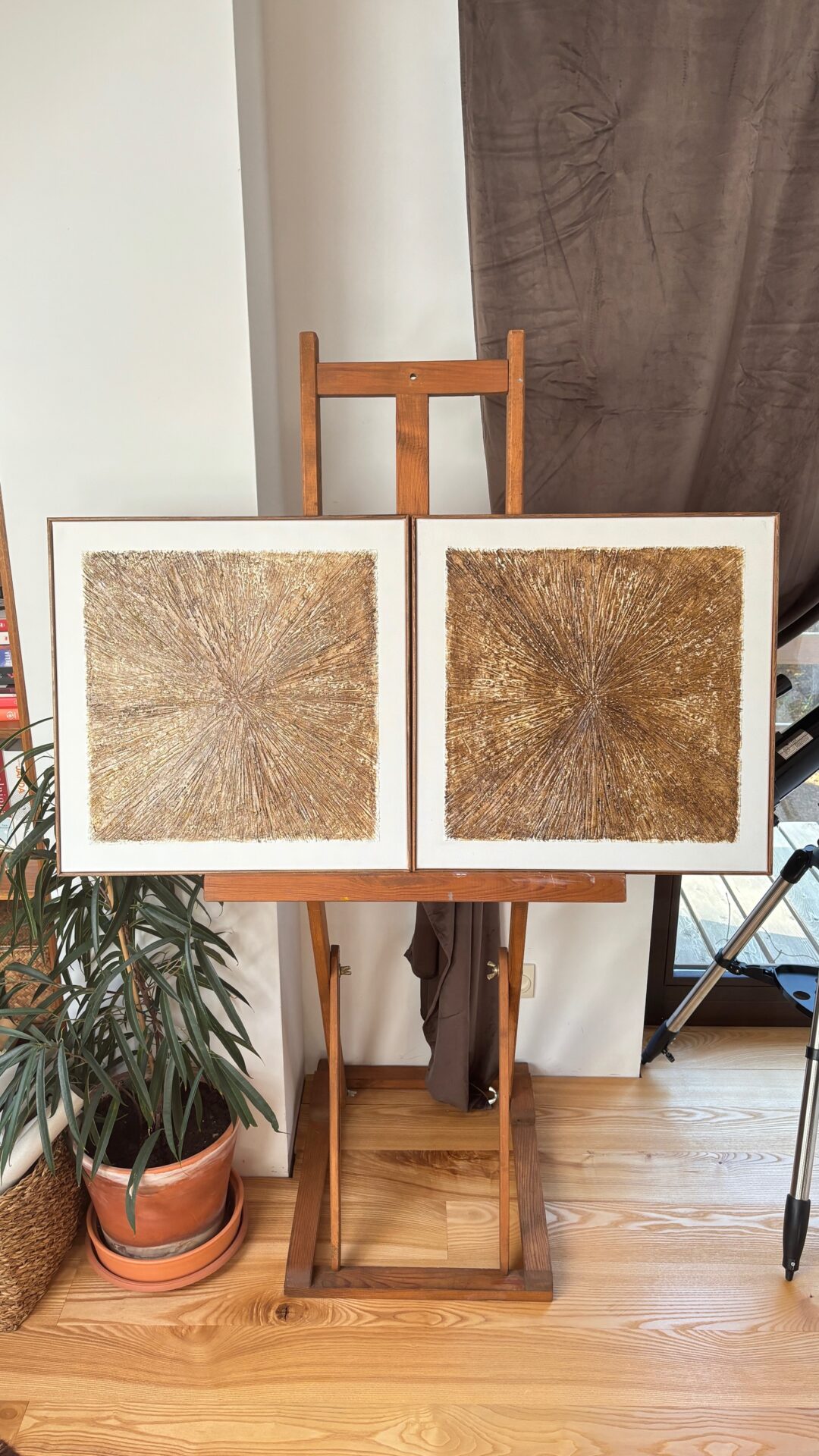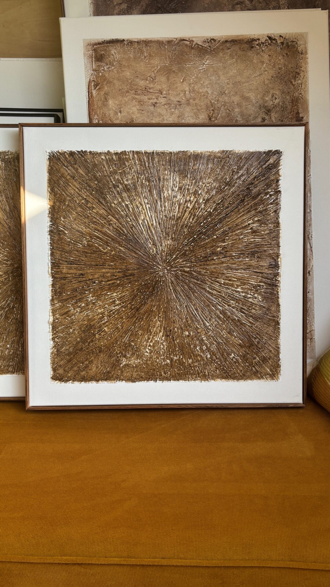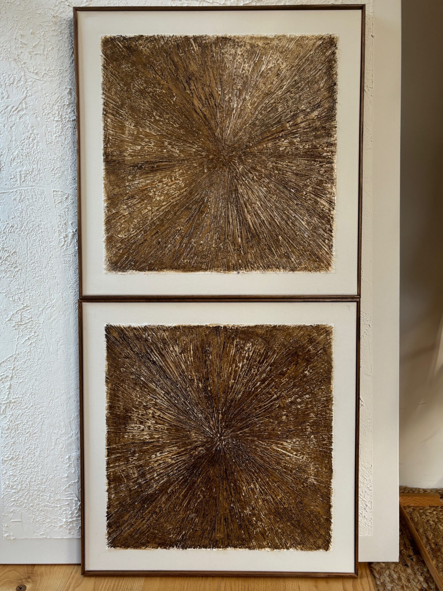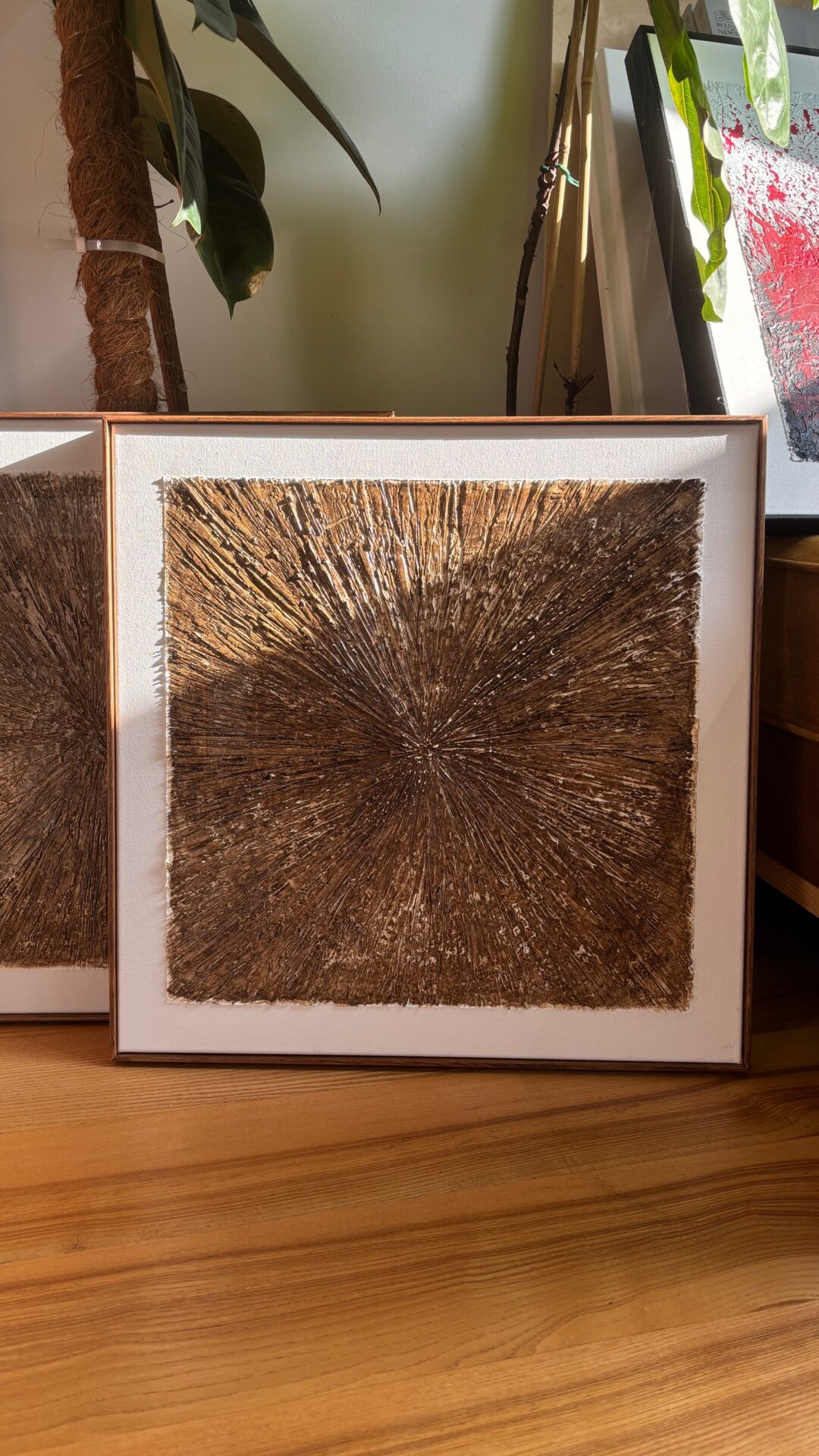 Obrazy strukturalne w brązowych kolorach o charakterze drzewa. Obrazy o wymiarach 50×50 każdy, oprawione w ramy typu amerykańskim.