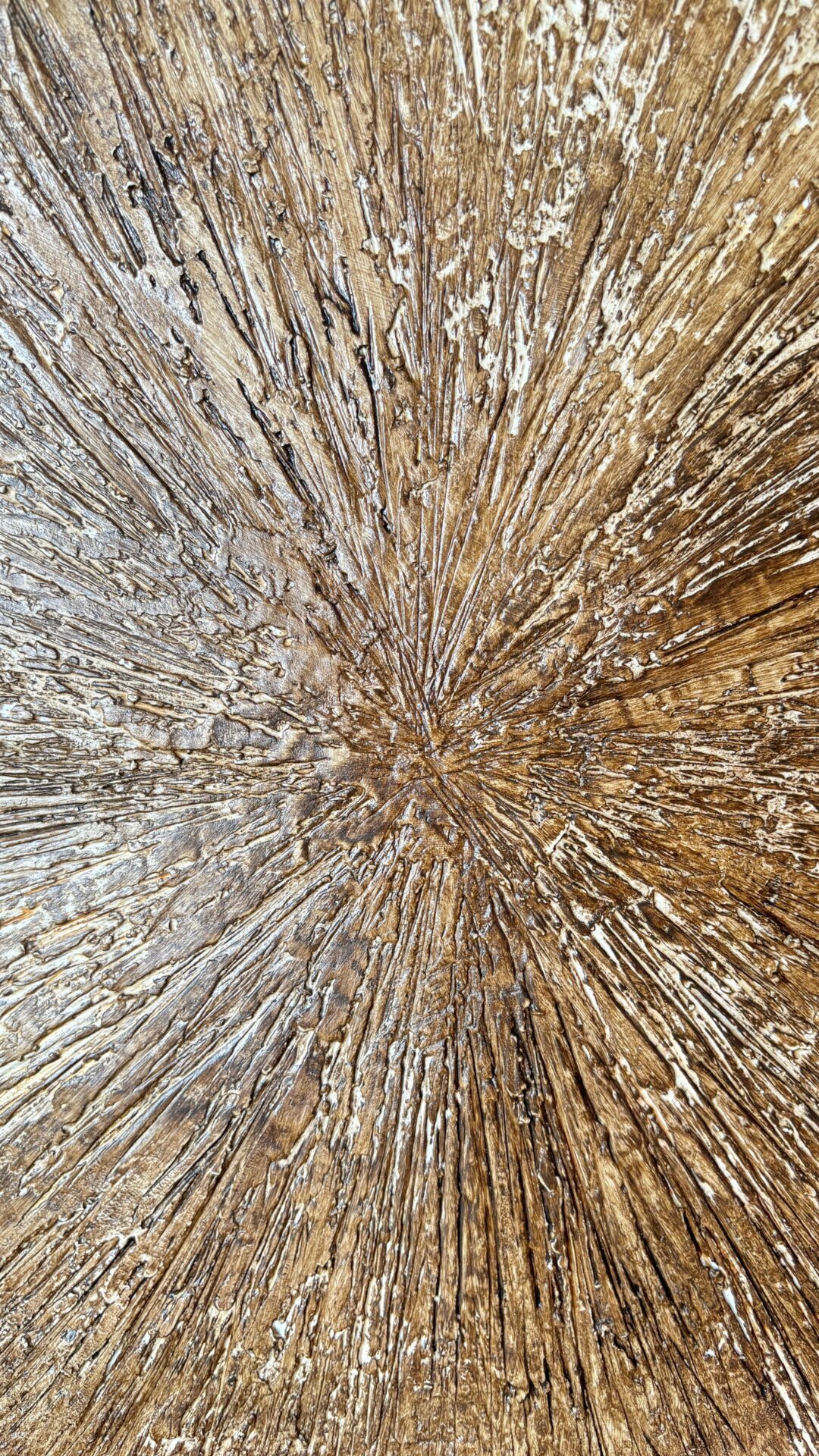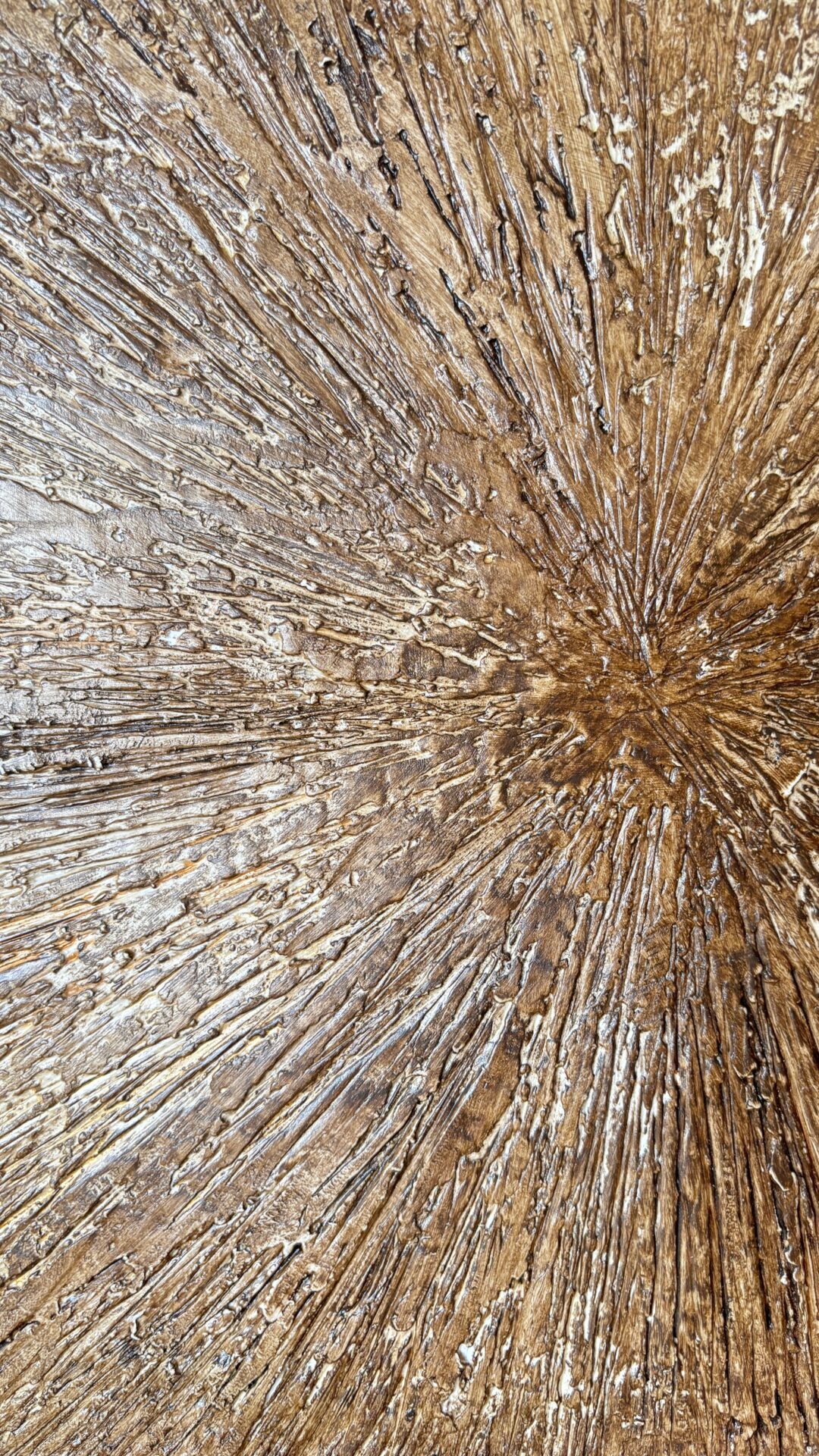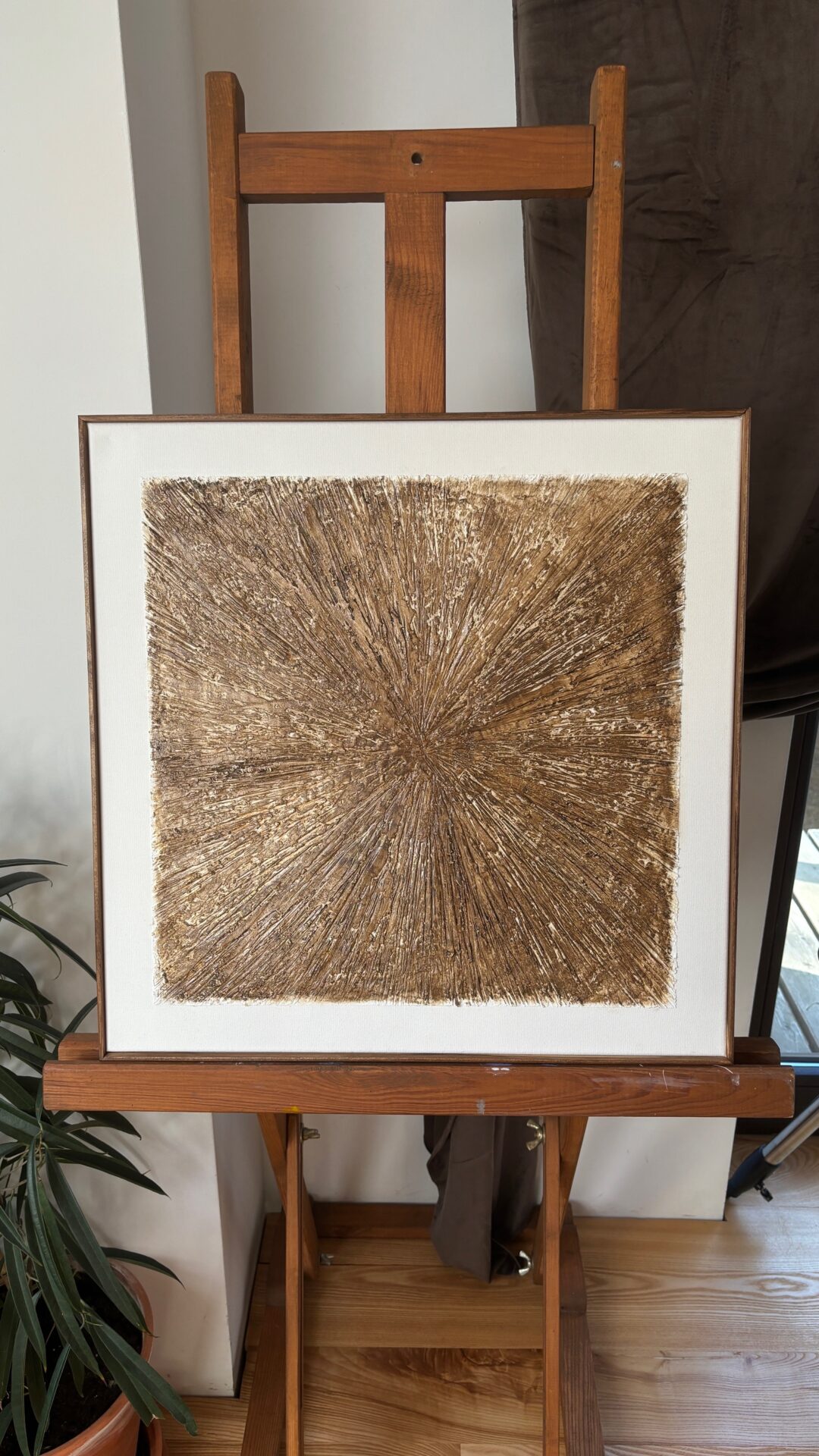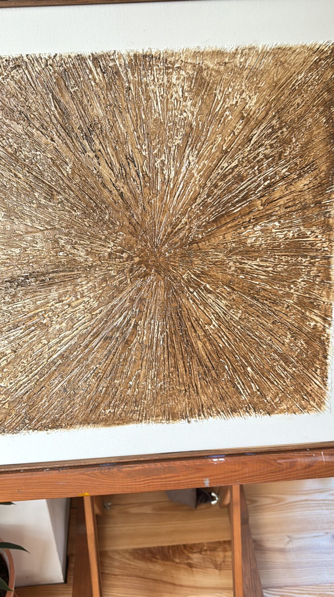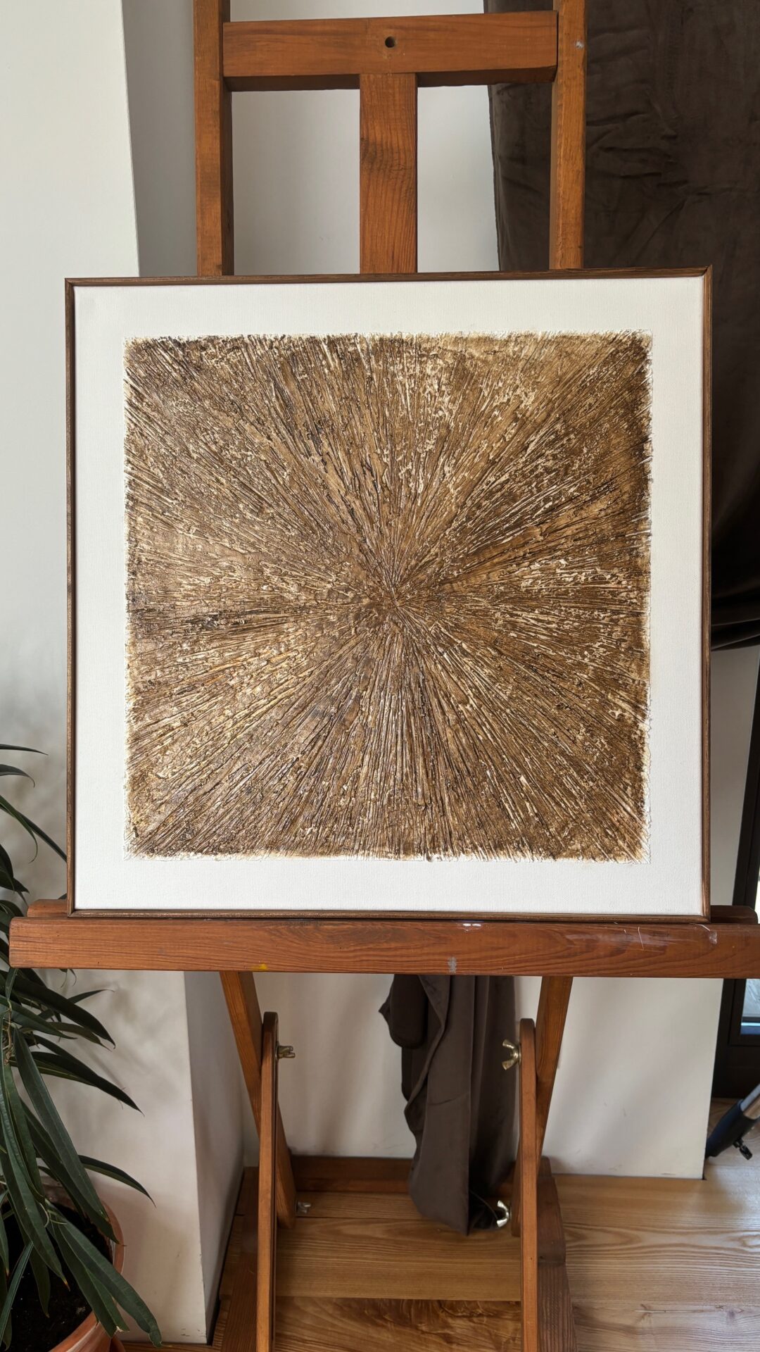 Obrazy strukturalne w brązowych kolorach o charakterze drzewa. Obrazy o wymiarach 50×50 każdy, oprawione w ramy typu amerykańskim.