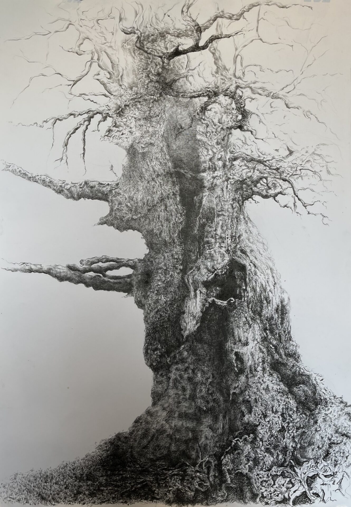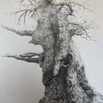 Na obrazie widzimy potężne, stare drzewo, którego gałęzie rozkładają się w dynamicznym, niemal chaotycznym tańcu. Czarno-biała kolorystyka nadaje całości surowy i tajemniczy ton. Pień drzewa jest masywna, pokryty skomplikowaną siecią pęknięć i wyżłobień, co dodaje mu charakteru i pewnej dawki dramatyzmu. Kompozycja jest na maxa skupiona na centralnym motywie drzewa, dając wrażenie nieokiełznanej siły natury.