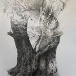 Obraz jest niezwykle intrygujący i pełen detali. Przedstawia masywne, poskręcane pnie drzew unoszące się w delikatnym tańcu gałęzi i korzeni. Czarny węgiel kontrastuje z jasnym tłem, tworząc dramatyczną i surową atmosferę. Artysta zastosował technikę rysunku, skupiając się na fakturze kory i misternie połączonych gałęziach. Wygląda to tak, jakby cała natura tętniła życiem i tajemnicą. Brak wyraźnych barw dodaje dziełu enigmatycznego, nieco melancholijnego klimatu