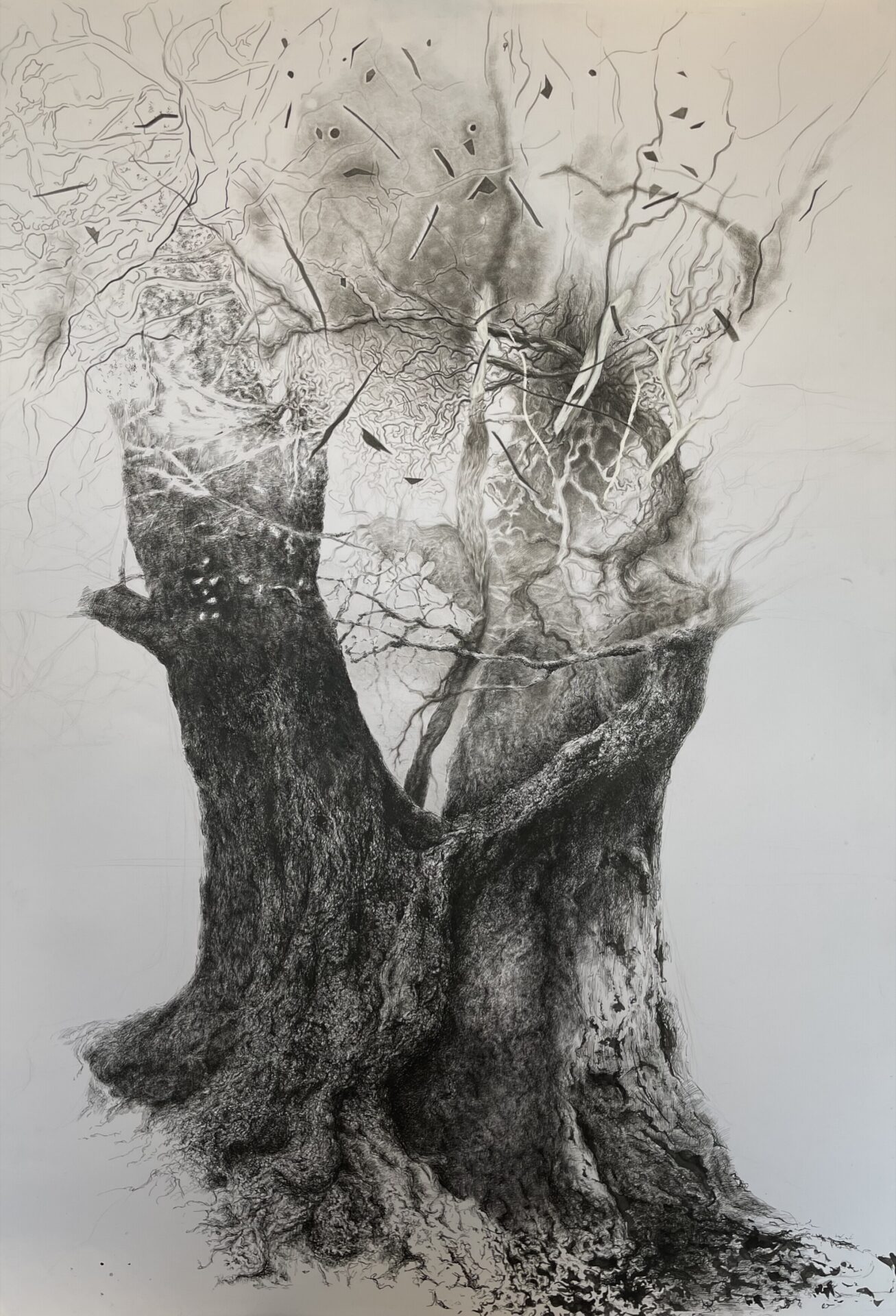 Obraz jest niezwykle intrygujący i pełen detali. Przedstawia masywne, poskręcane pnie drzew unoszące się w delikatnym tańcu gałęzi i korzeni. Czarny węgiel kontrastuje z jasnym tłem, tworząc dramatyczną i surową atmosferę. Artysta zastosował technikę rysunku, skupiając się na fakturze kory i misternie połączonych gałęziach. Wygląda to tak, jakby cała natura tętniła życiem i tajemnicą. Brak wyraźnych barw dodaje dziełu enigmatycznego, nieco melancholijnego klimatu
