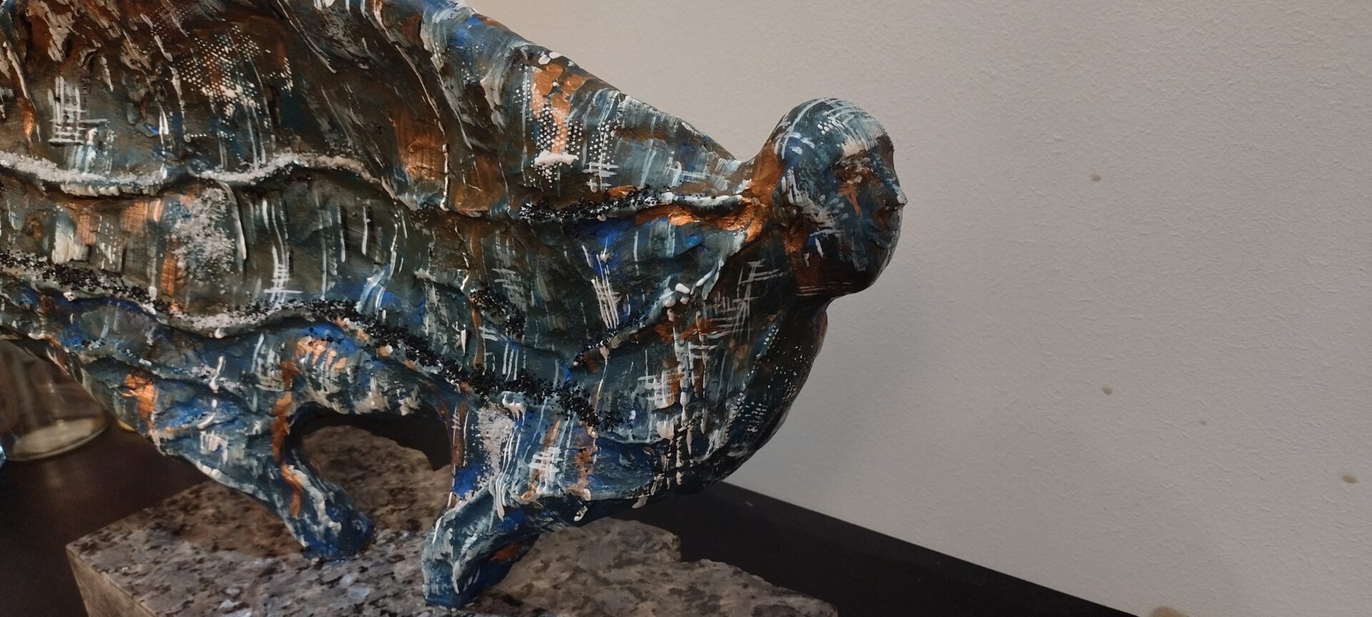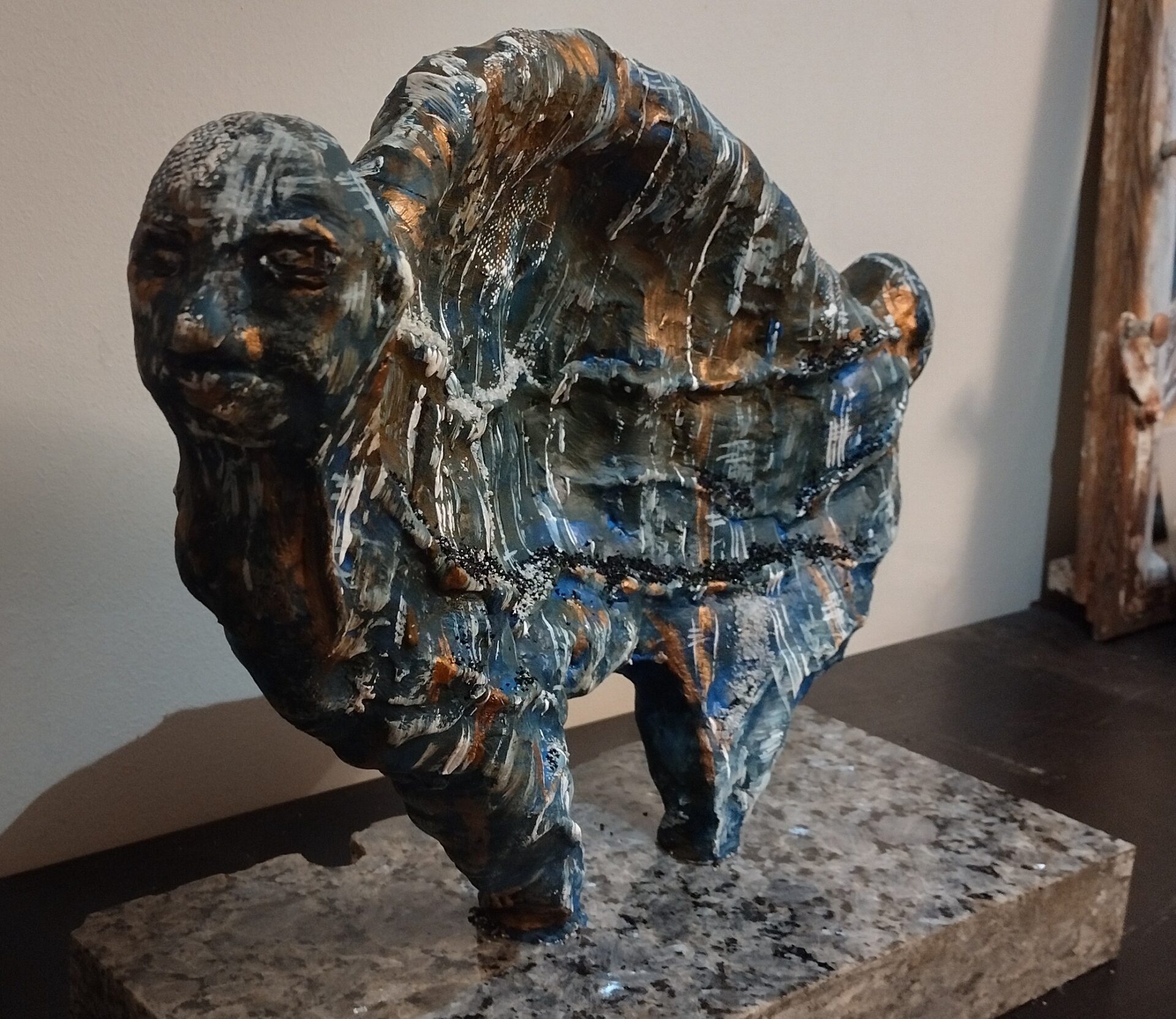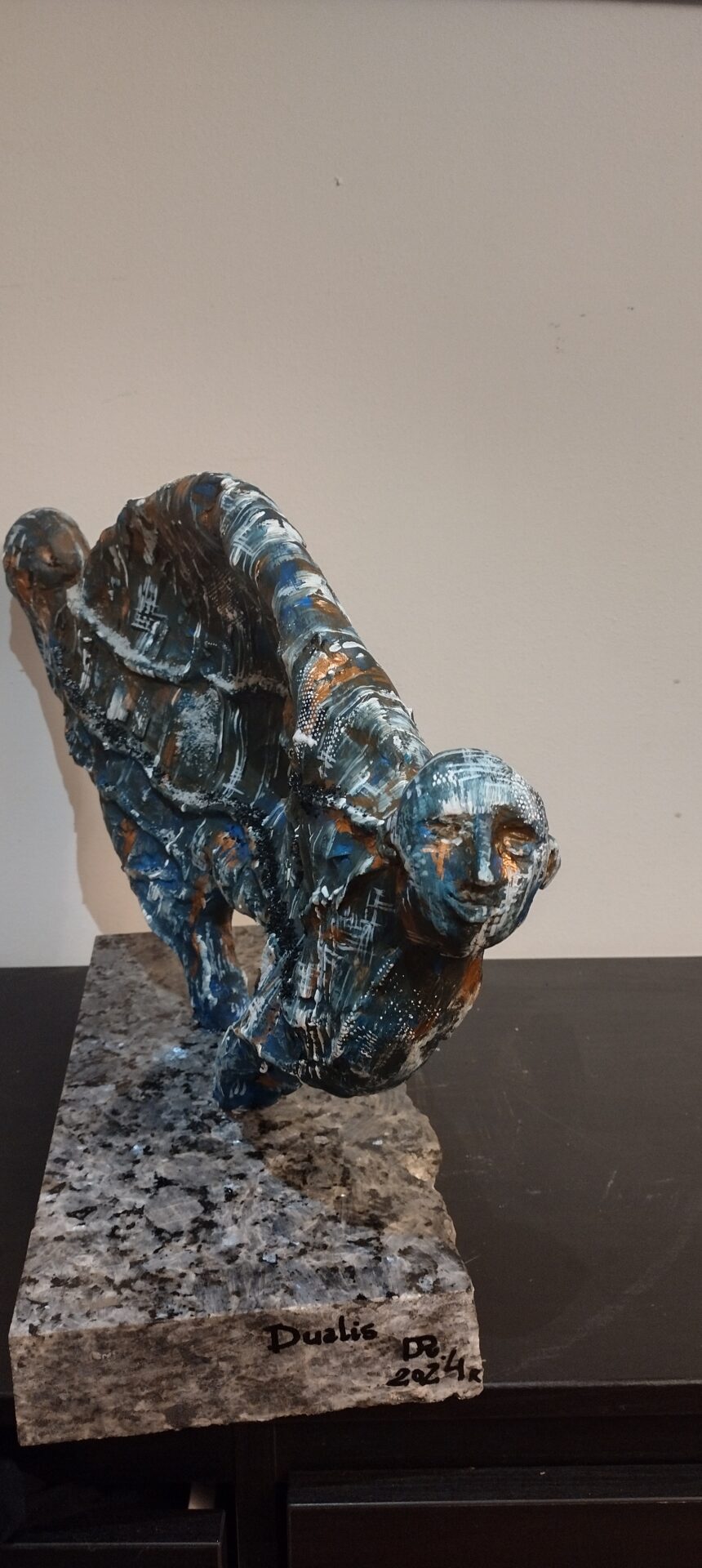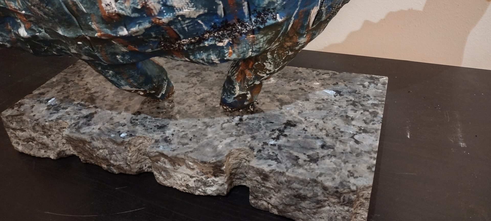 Tym razem prezentuję autorską rzeźbę wykonaną z gliny oraz betonu architektonicznego na postumencie z przepięknego granitu o nazwie „blue pearl”