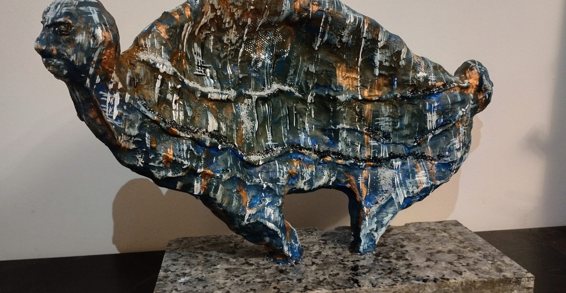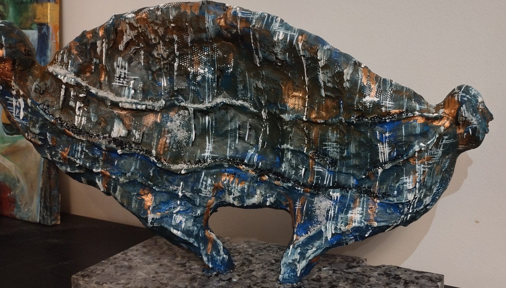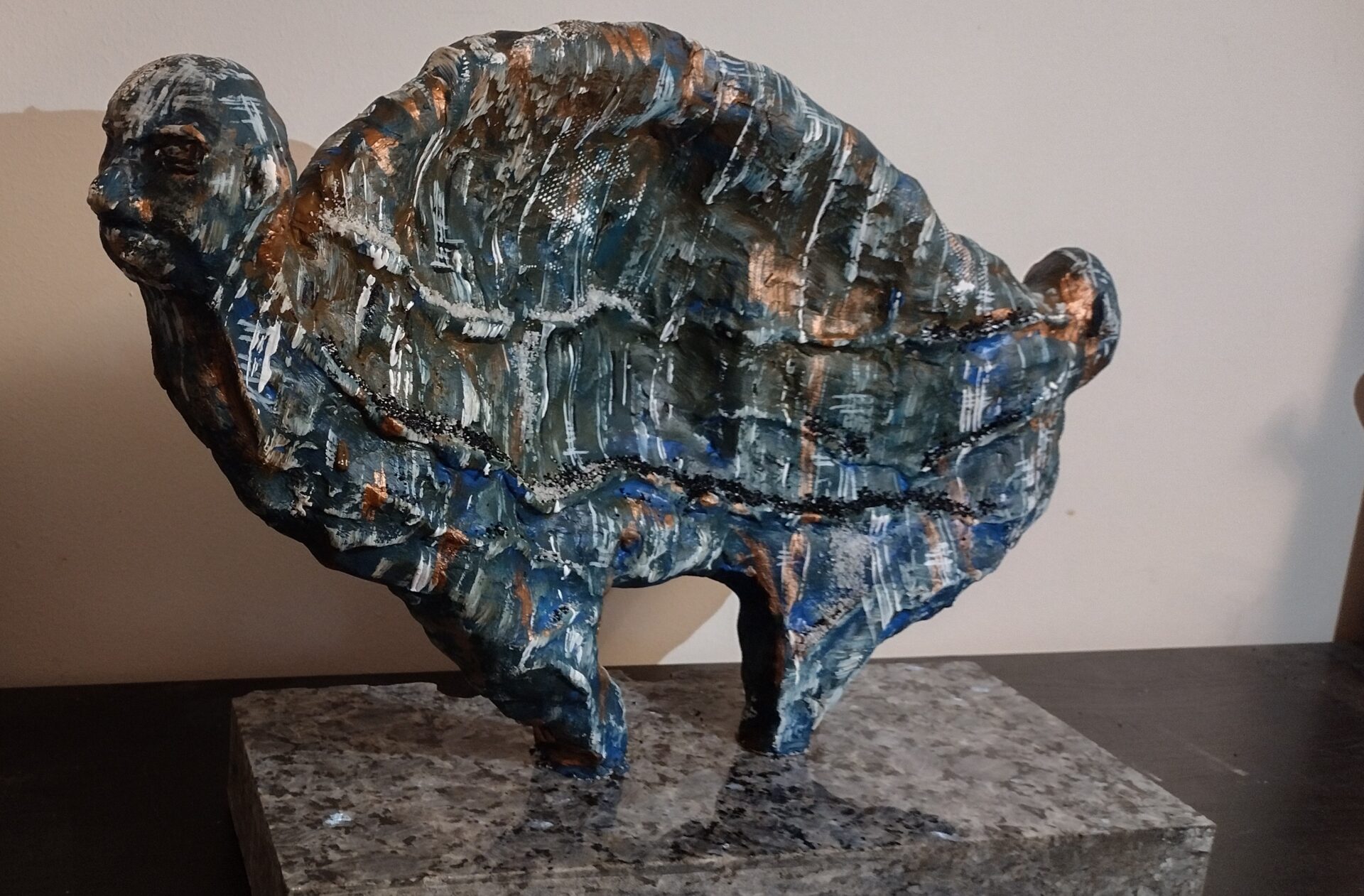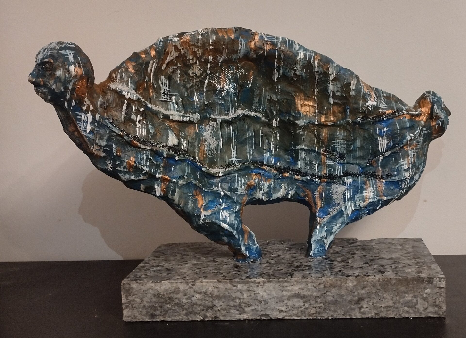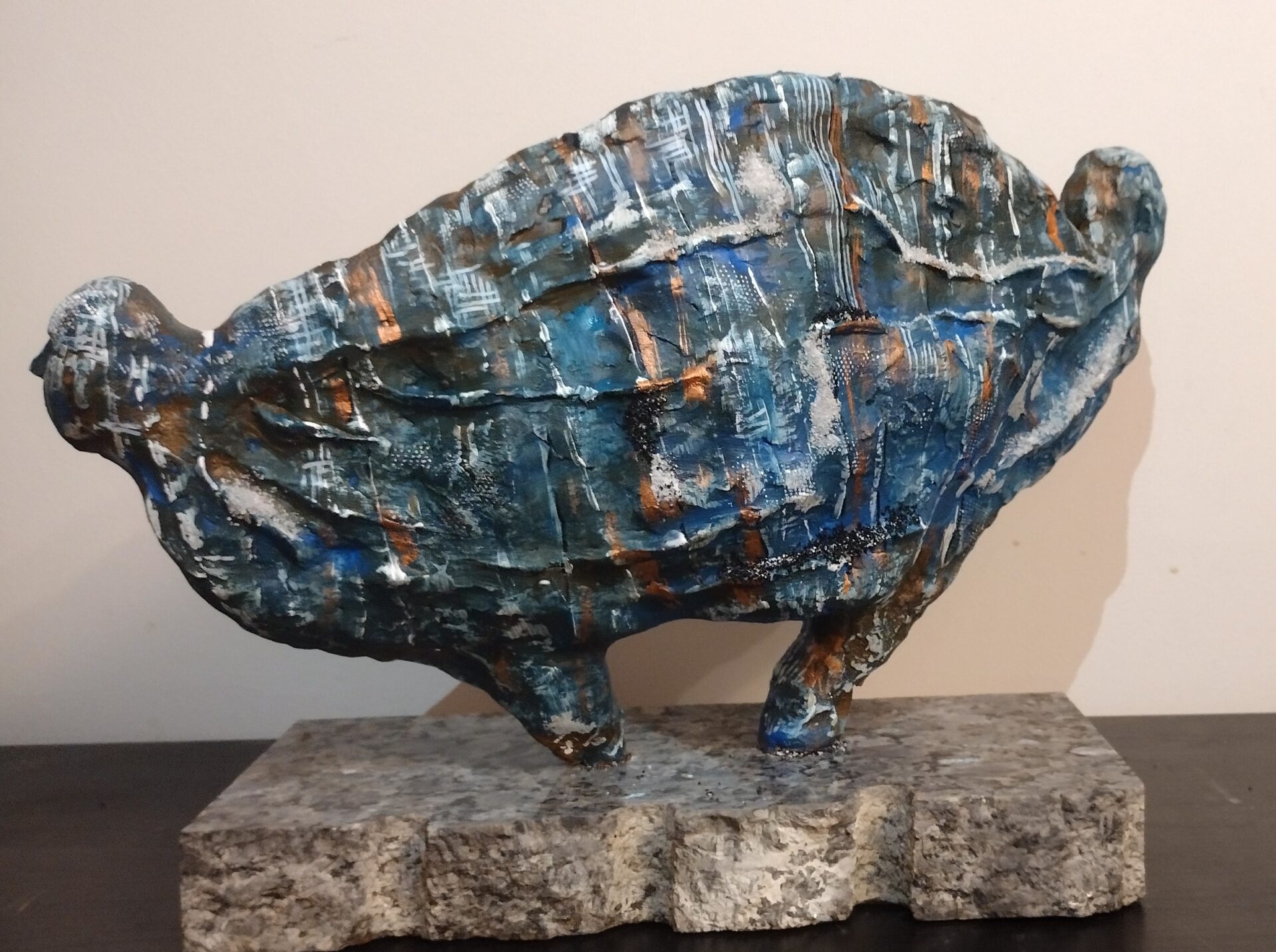 Tym razem prezentuję autorską rzeźbę wykonaną z gliny oraz betonu architektonicznego na postumencie z przepięknego granitu o nazwie „blue pearl”
