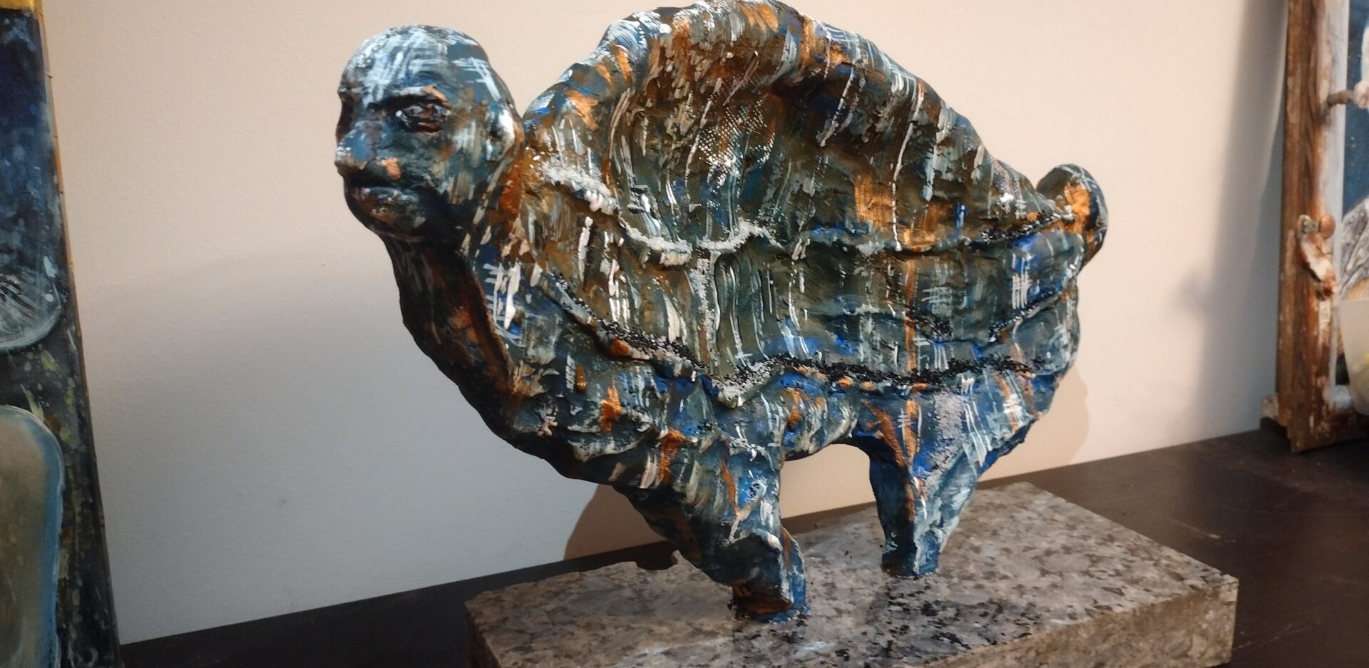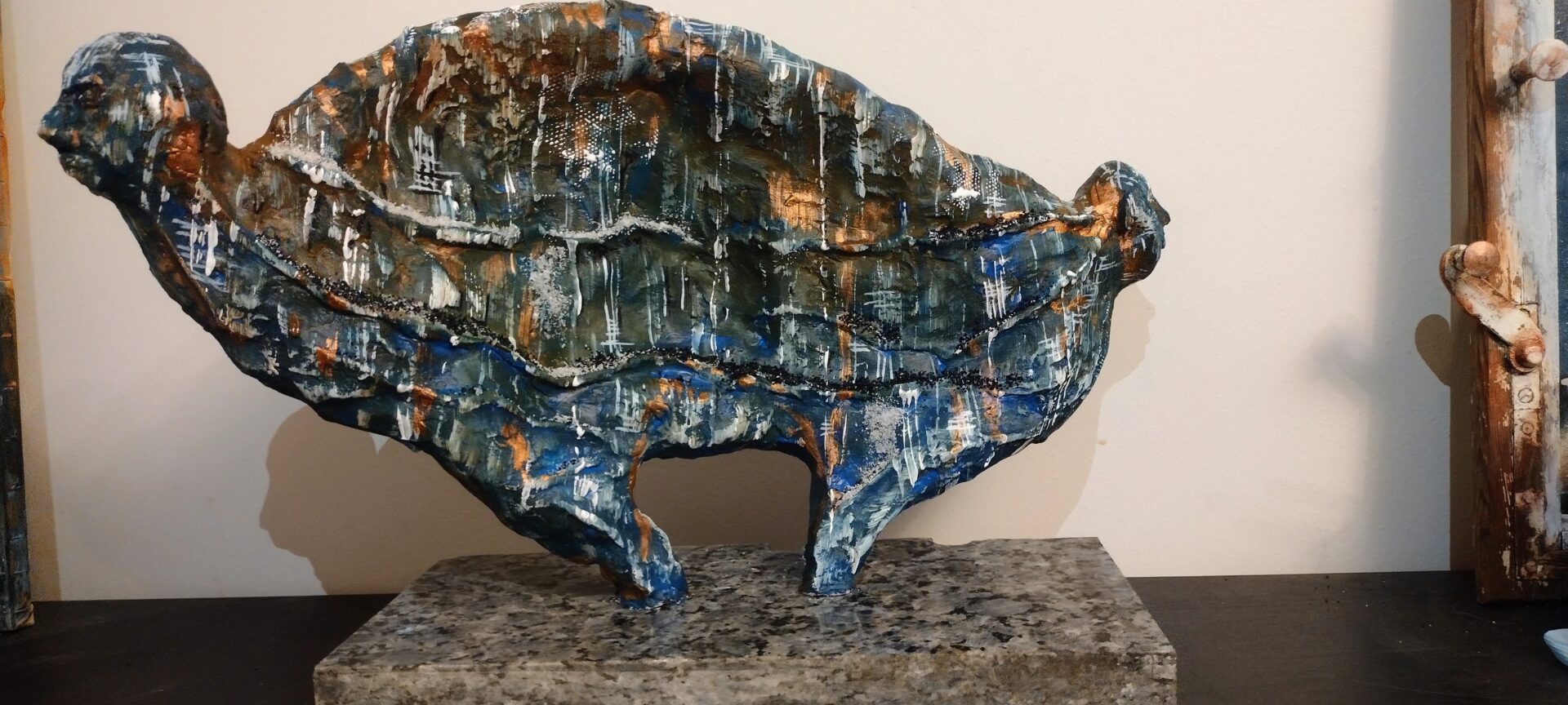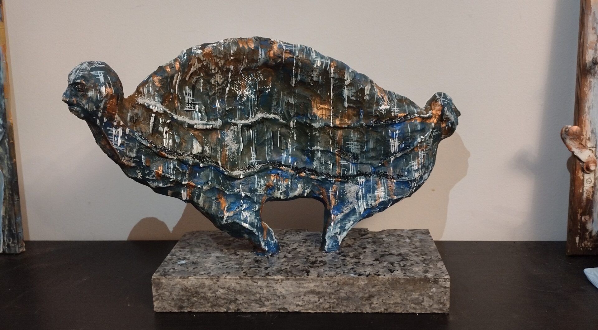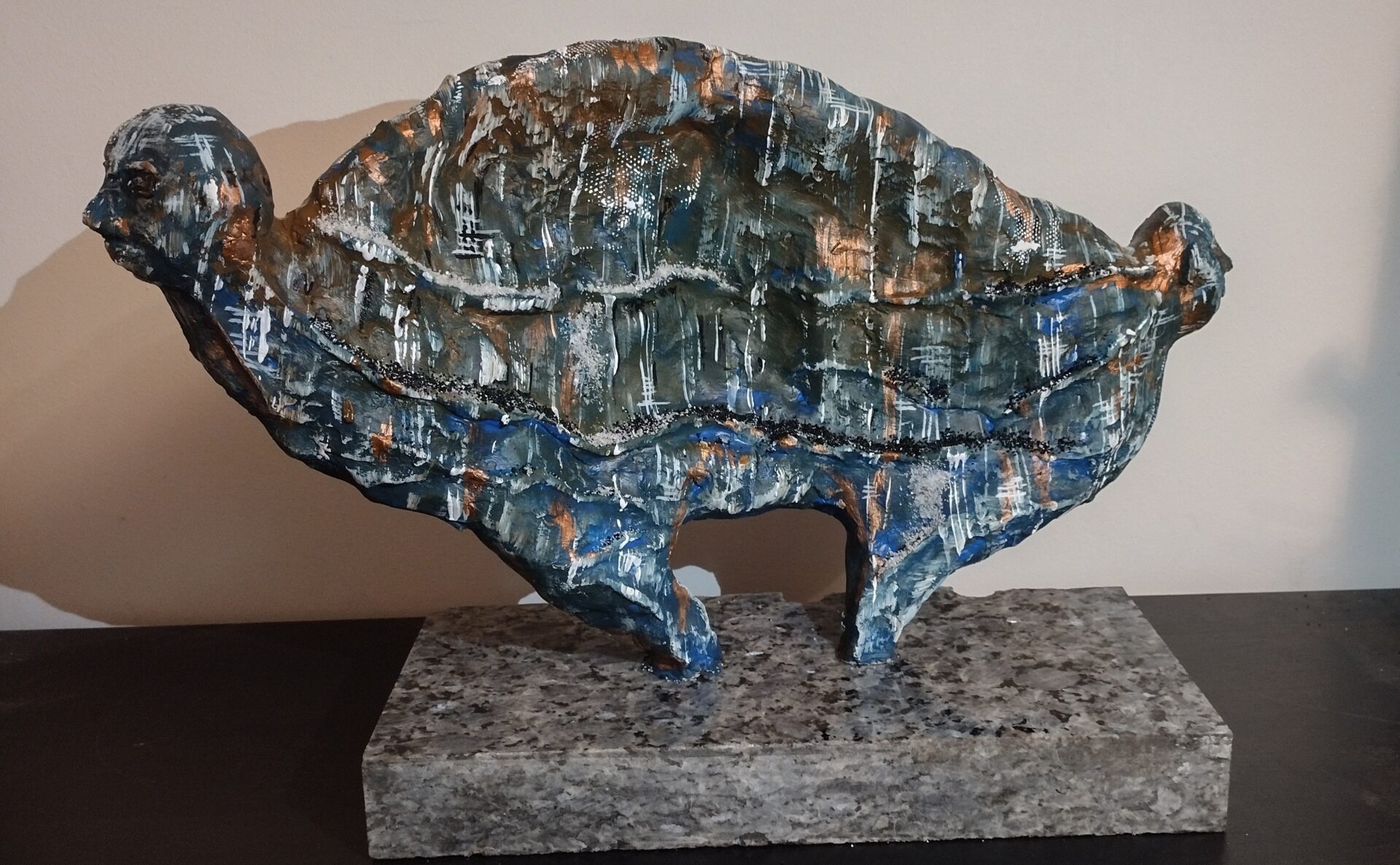 Tym razem prezentuję autorską rzeźbę wykonaną z gliny oraz betonu architektonicznego na postumencie z przepięknego granitu o nazwie „blue pearl”