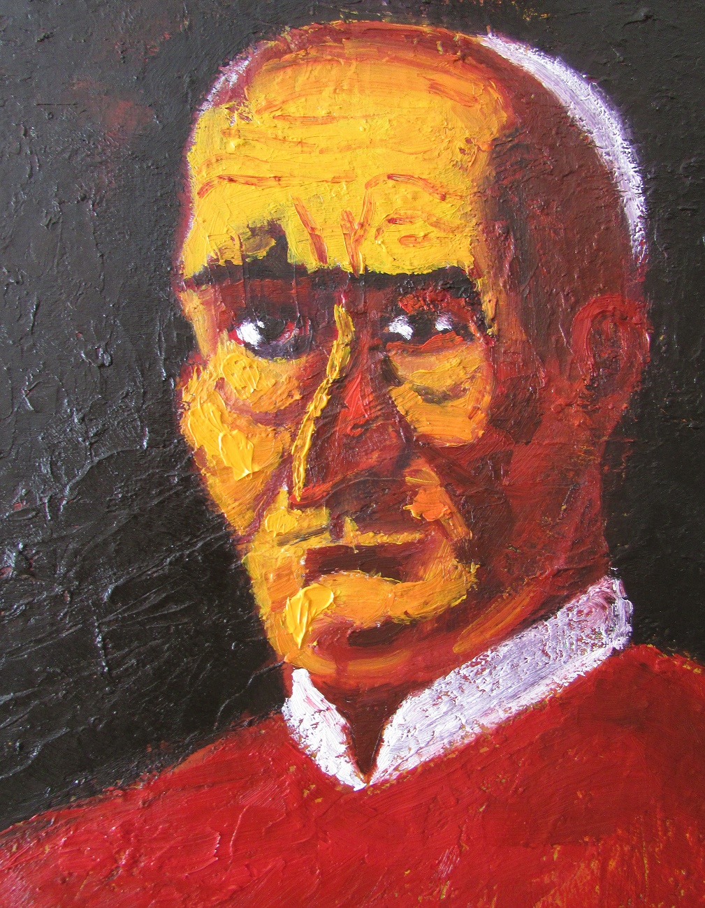 Olej na płycie 30×25, przedstawiający duchownego. Początkowo chciałem namalować tu inną postać lecz zamiast niej pojawił się duchowny.