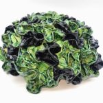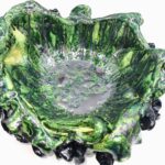 Duża ceramiczna misa ozdobna, szkliwiona tlenkiem miedzi i opiłkami miedzianymi. Wykonana z dwóch rodzajów glin czarnej i jasnej. Technika wypału piec elektryczny. Wymiary średnica 29 cm wysokość 12 cm